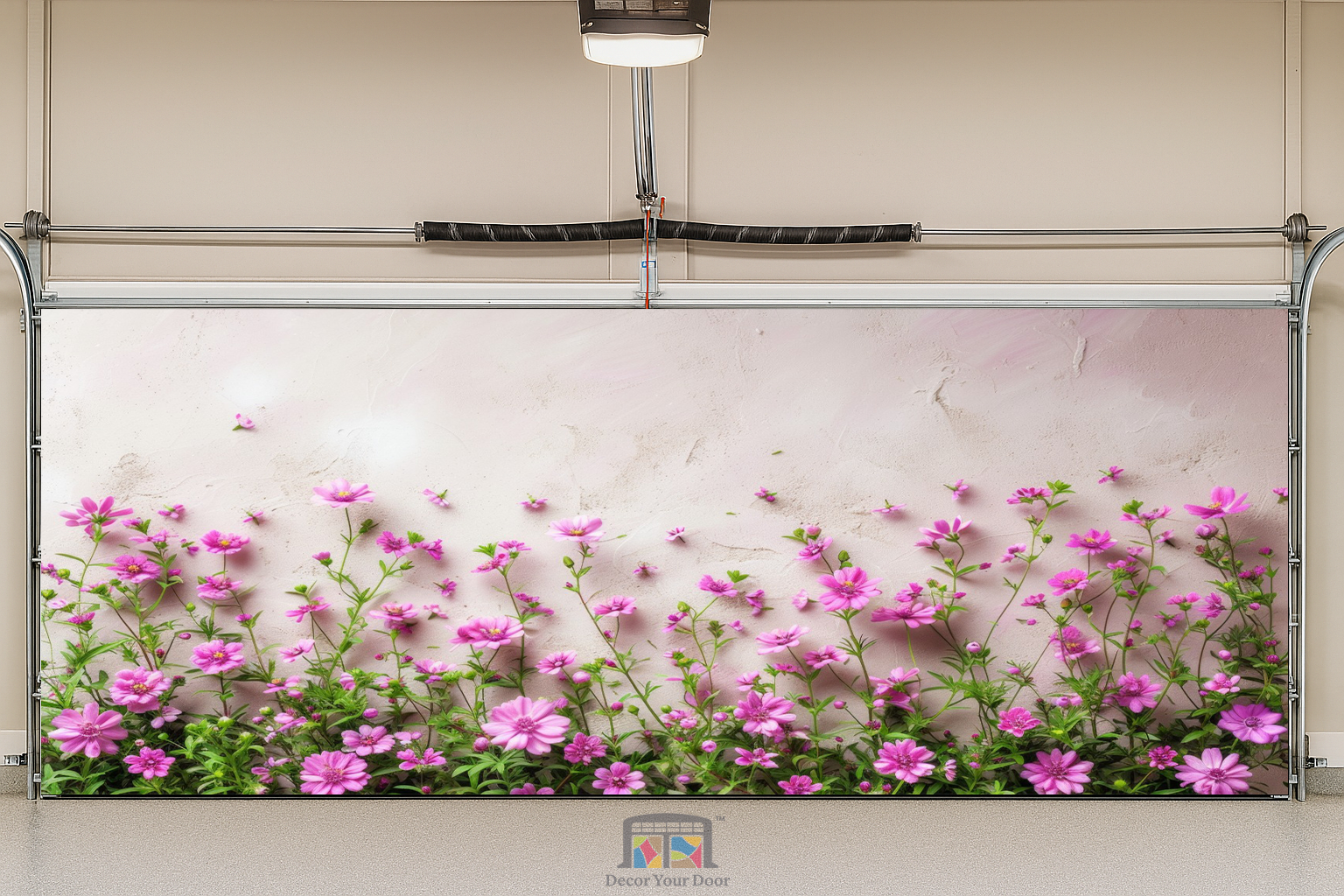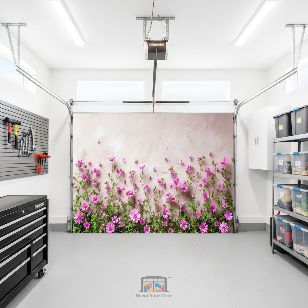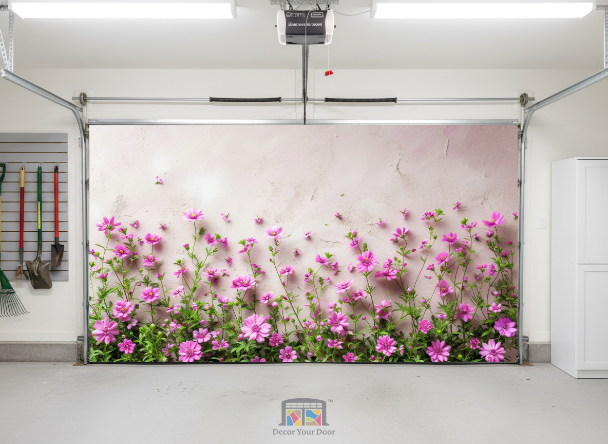 Brighten your home with the gentle beauty of the Blossom Charm Interior Garage Door Cover by Decor Your Door. Featuring a row of delicate pink blooms rising against a soft pastel wall, this design brings a touch of spring serenity to any interior. Perfect for adding freshness and charm, it transforms your garage into a peaceful, uplifting space filled with natural warmth and floral elegance.