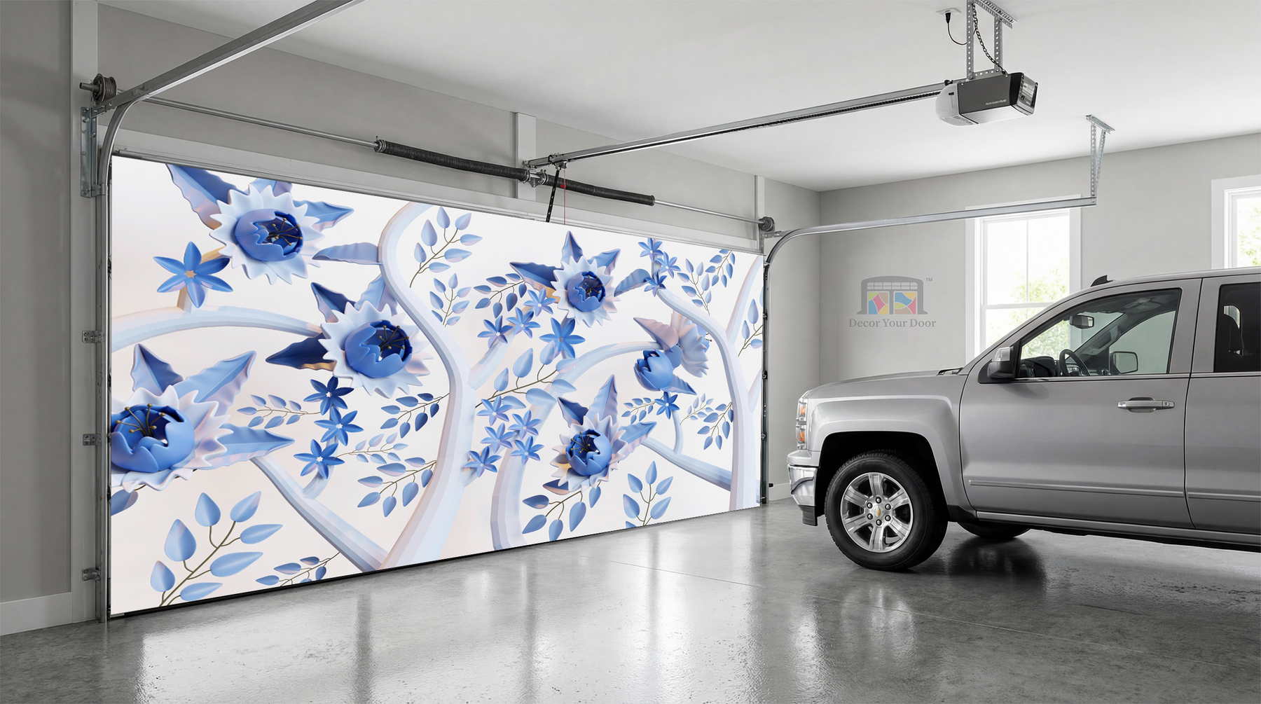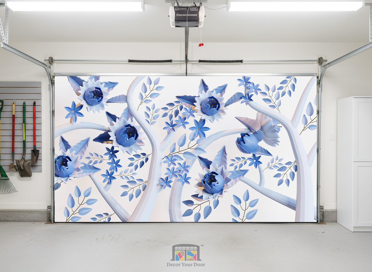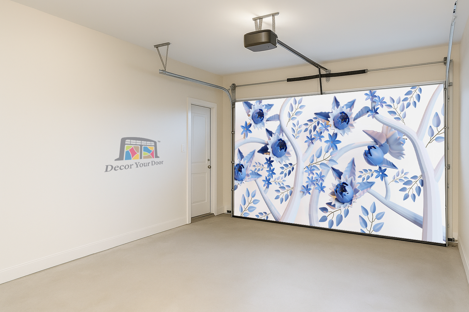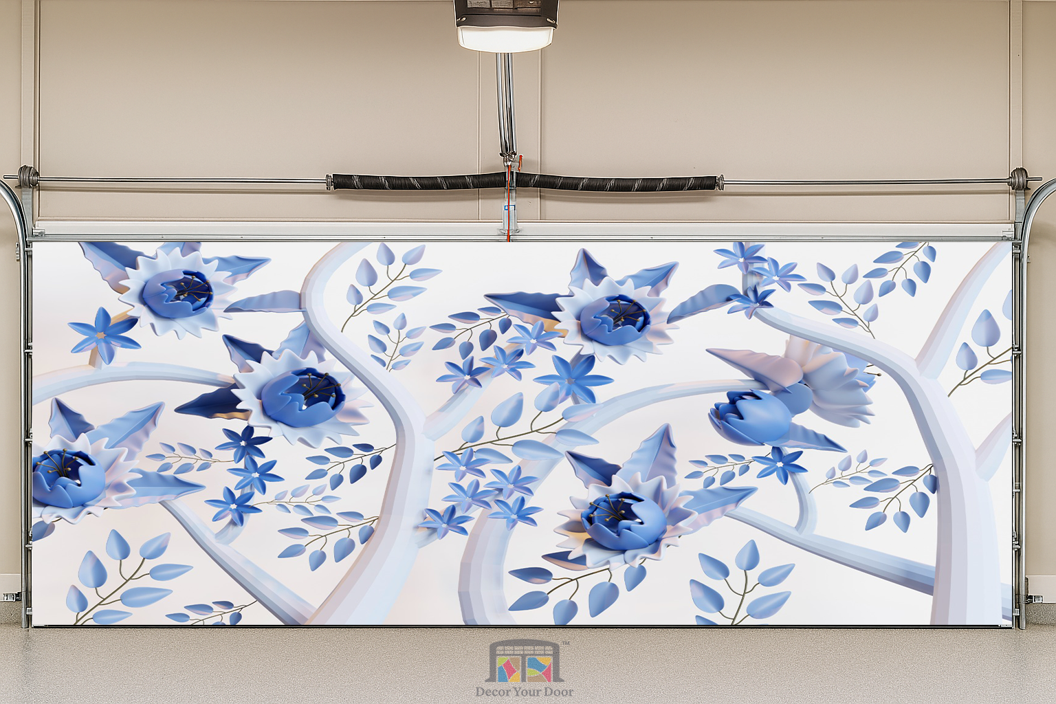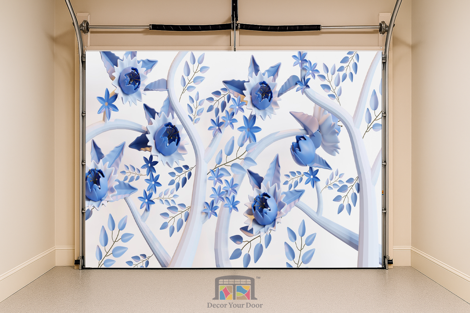 Add a touch of refined artistry to your space with the Blue Porcelain Elegance Interior Garage Door Cover by Decor Your Door. Inspired by delicate porcelain patterns, this design features layered blue and white floral sculptures that create a graceful three-dimensional effect. Its cool tones and intricate detailing bring sophistication and calm to your interior, turning your garage into a modern art-inspired statement of beauty and balance.
