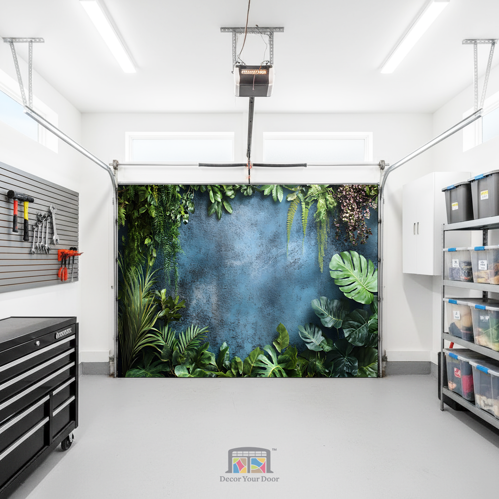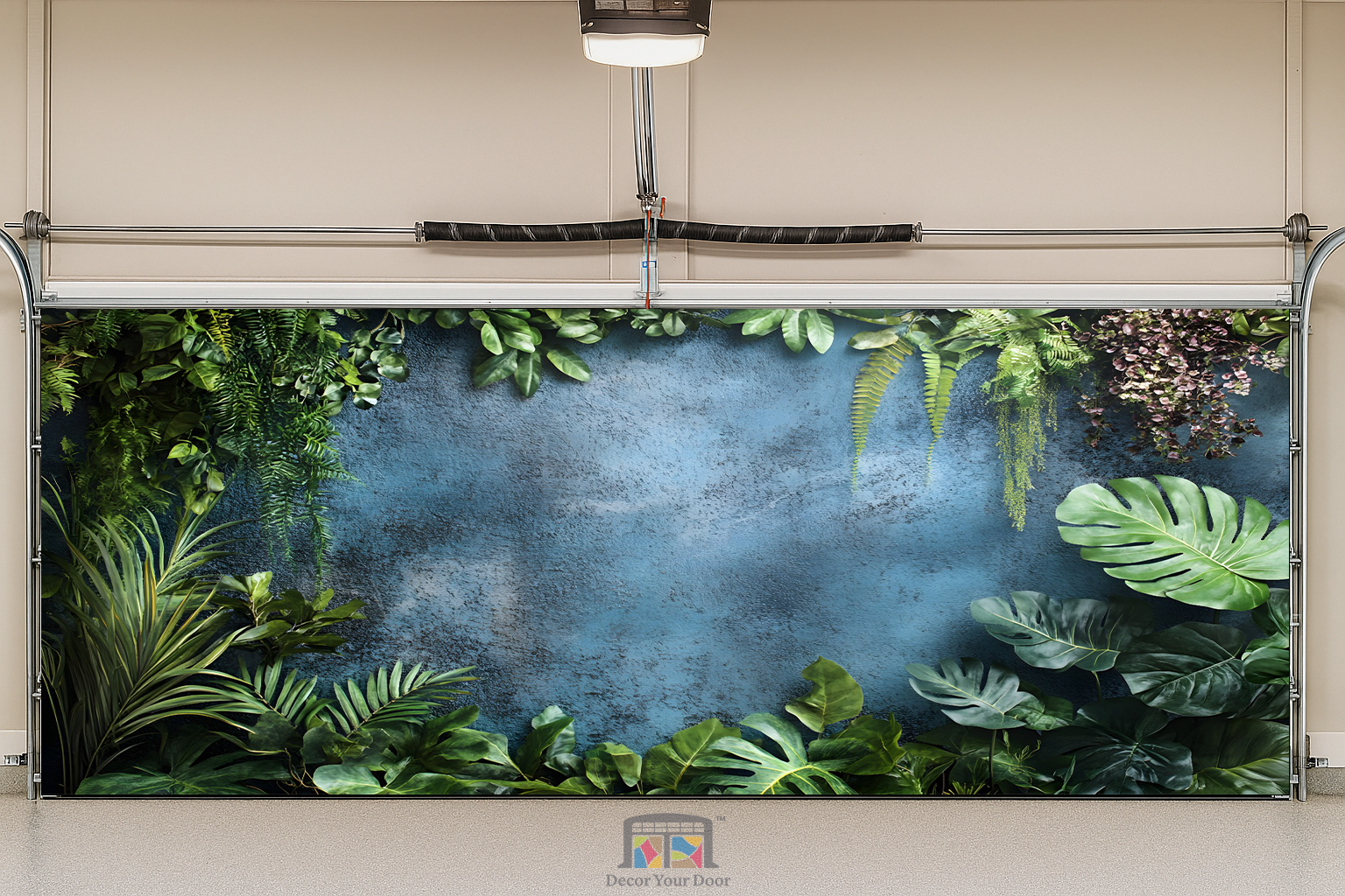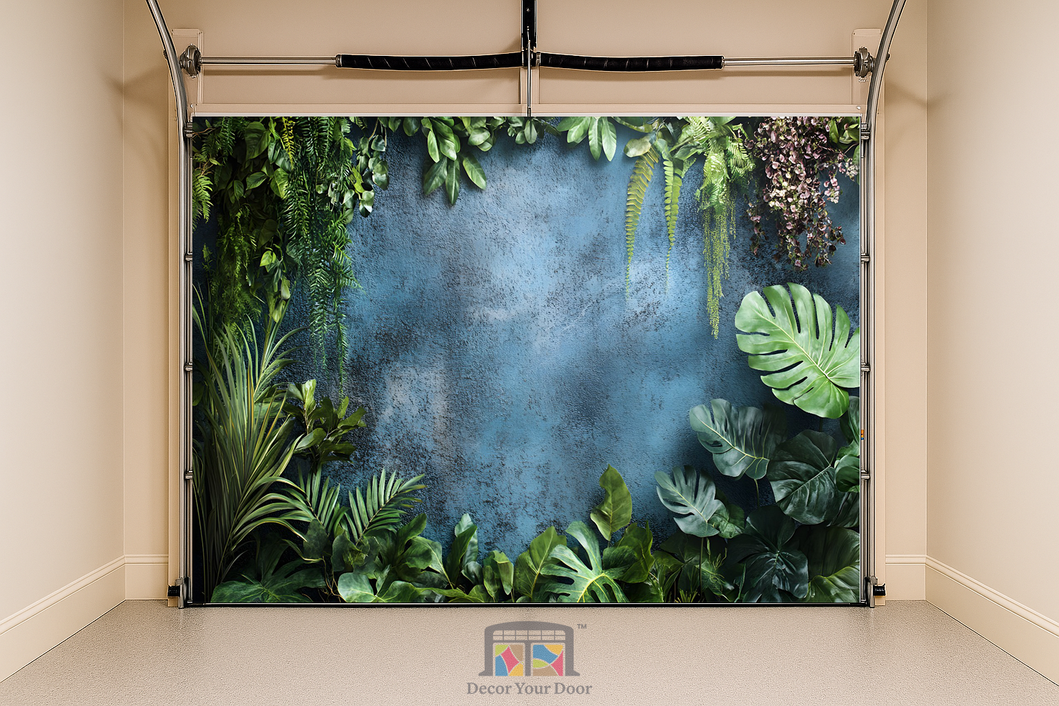 The Botanic Blue Haven Interior Garage Door Cover by Decor Your Door combines tropical calm with modern elegance. A soothing blue textured background surrounded by vibrant monstera leaves, ferns, and lush greenery creates a fresh, natural frame. Perfect for adding a relaxing tropical vibe and a touch of sophistication to any interior setting.