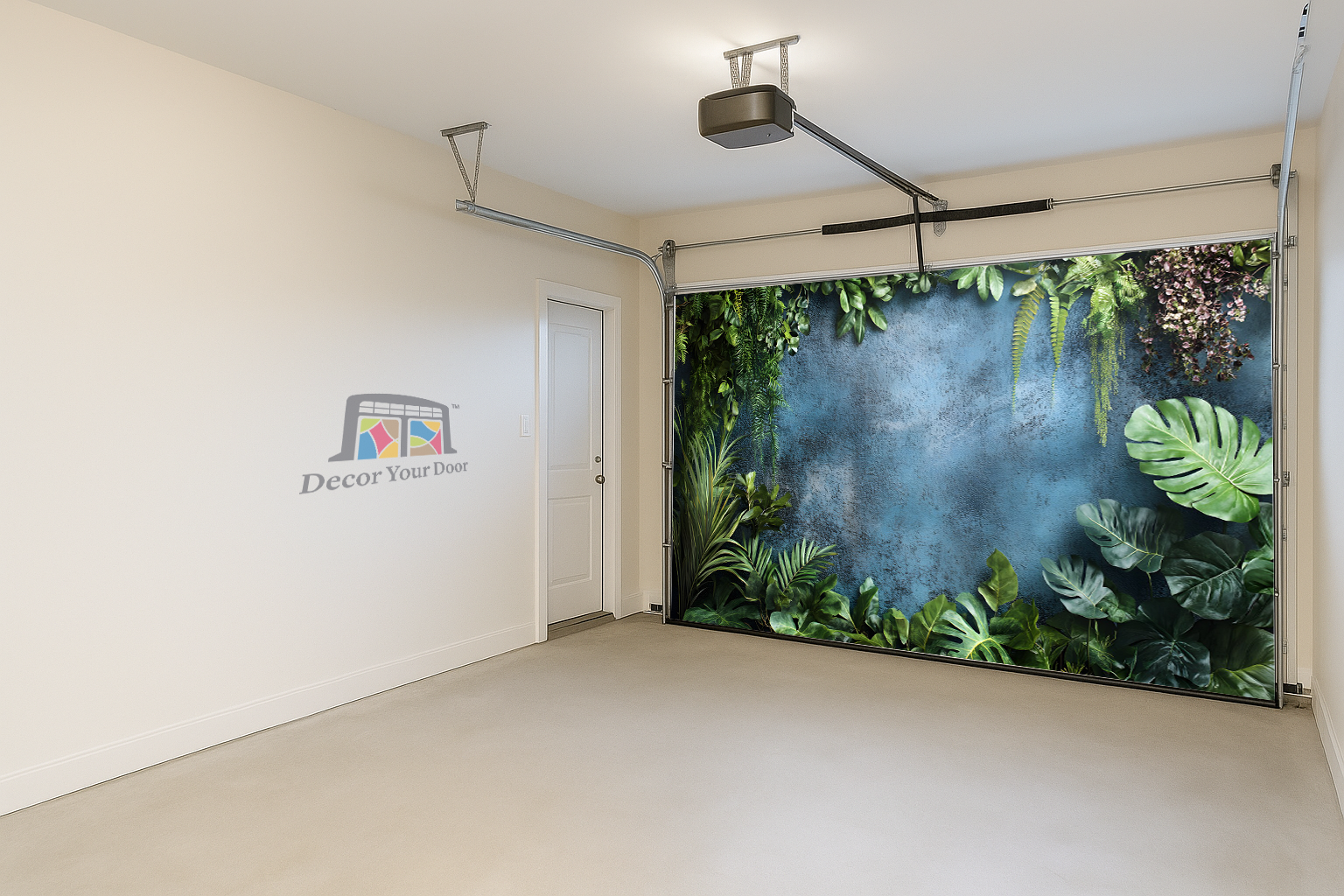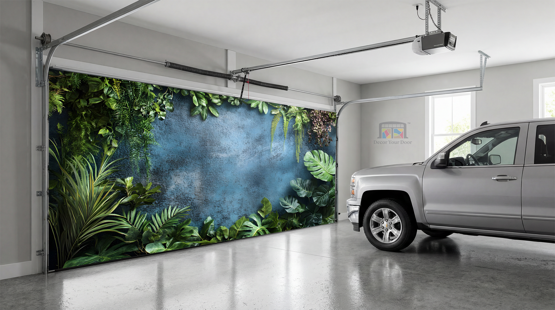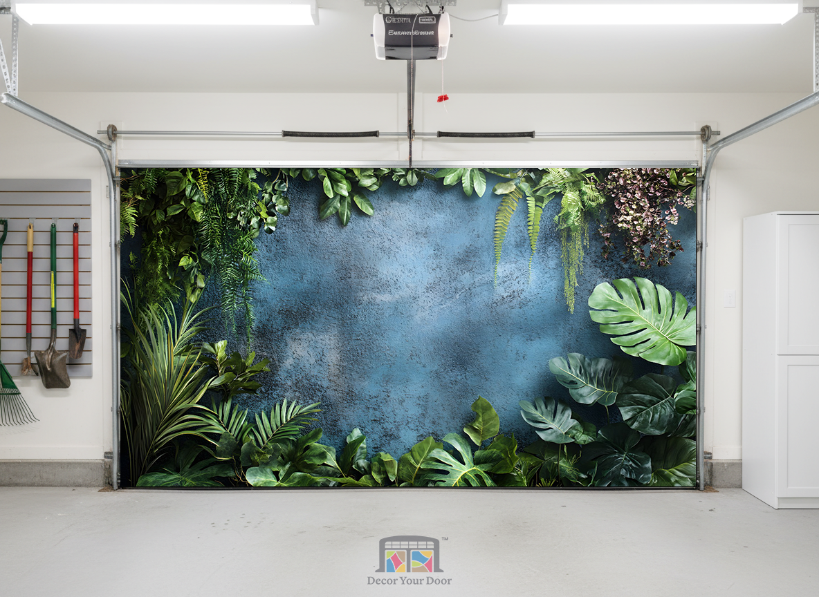 The Botanic Blue Haven Interior Garage Door Cover by Decor Your Door combines tropical calm with modern elegance. A soothing blue textured background surrounded by vibrant monstera leaves, ferns, and lush greenery creates a fresh, natural frame. Perfect for adding a relaxing tropical vibe and a touch of sophistication to any interior setting.