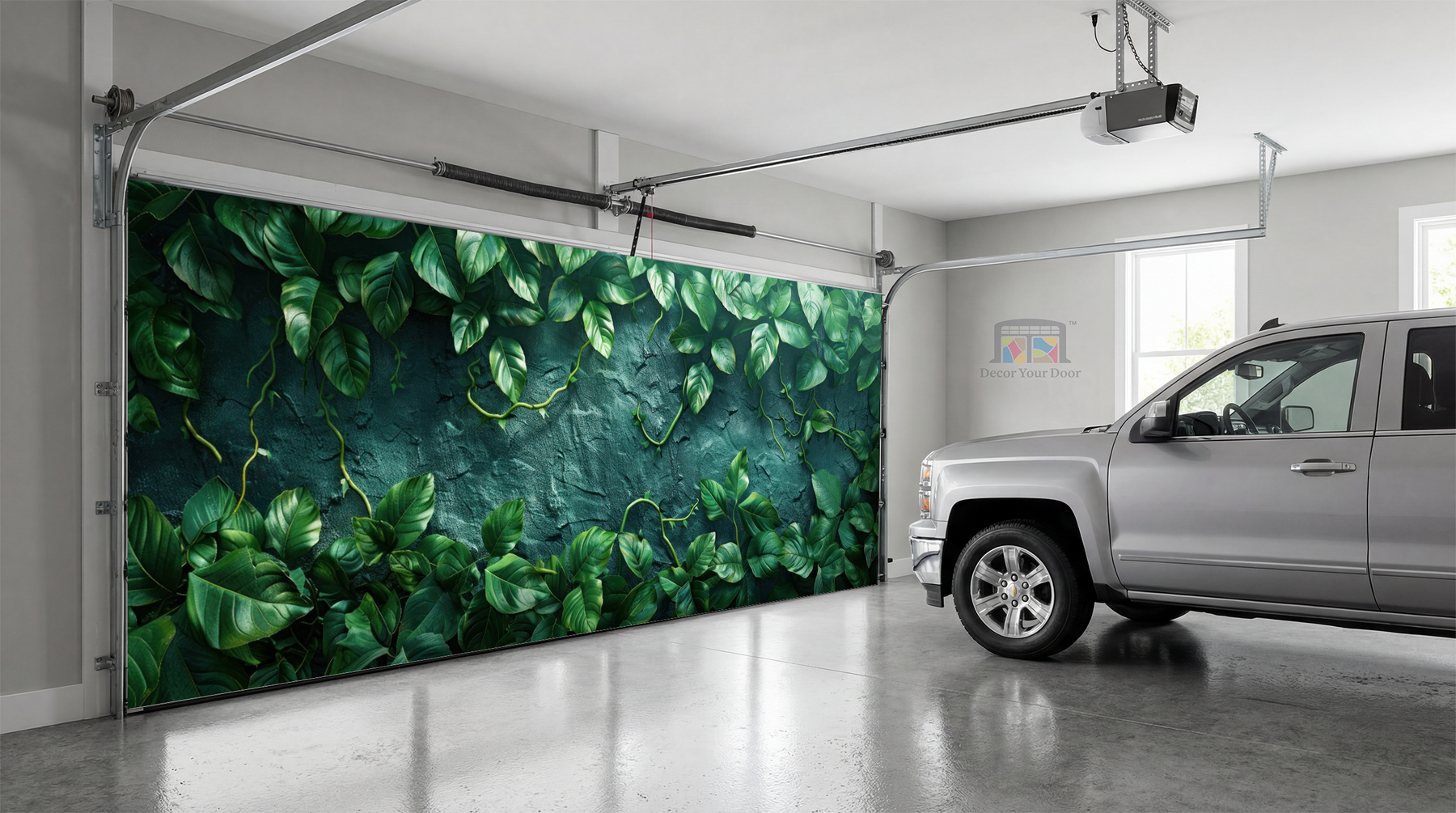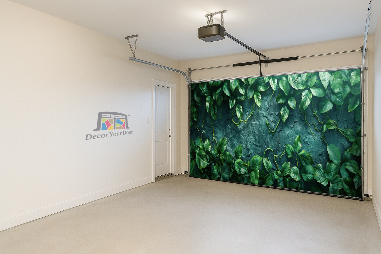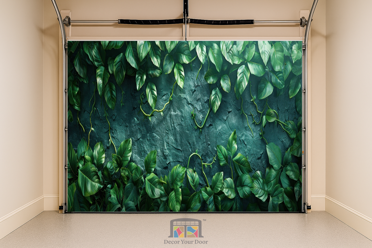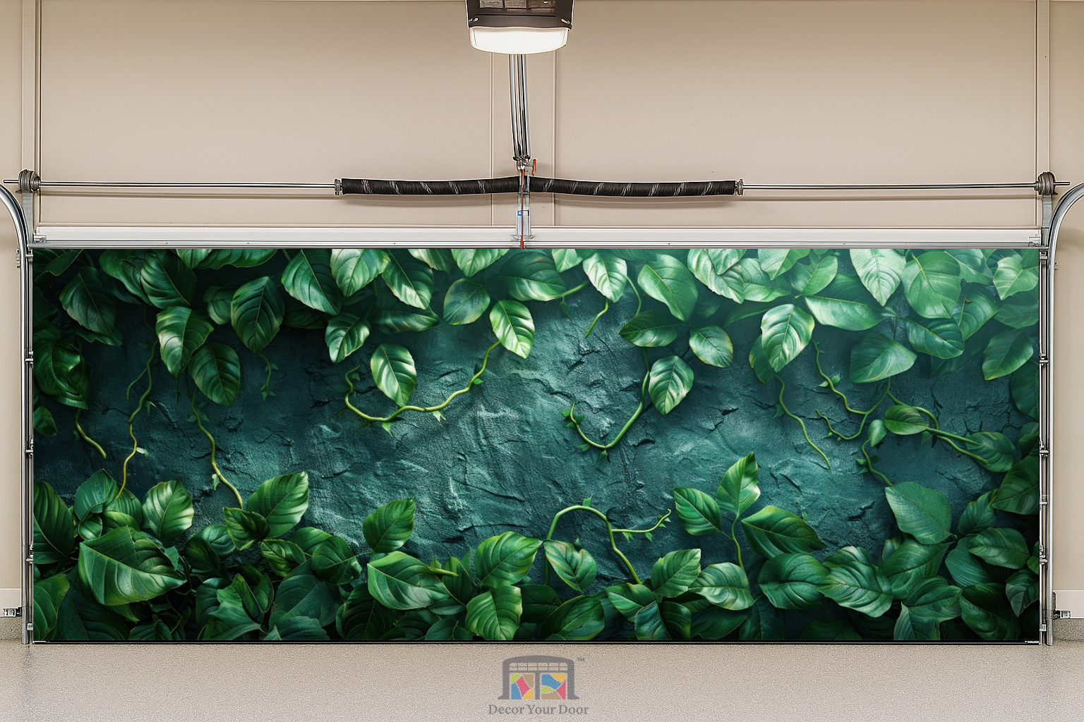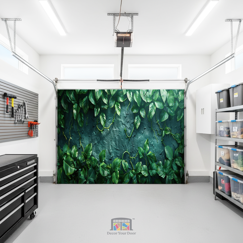 The Emerald Wall Interior Garage Door Cover by Decor Your Door brings the lush serenity of a tropical garden straight into your space. Rich green vines cascade over a textured stone backdrop, creating the illusion of a living wall full of depth and freshness. Perfect for adding a calming, natural atmosphere to your interior, this design blends modern elegance with timeless botanical beauty.