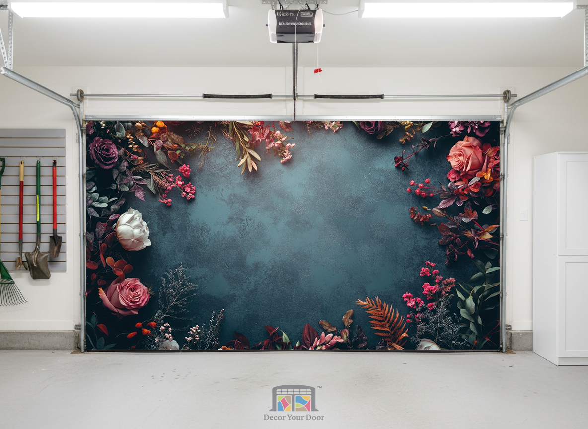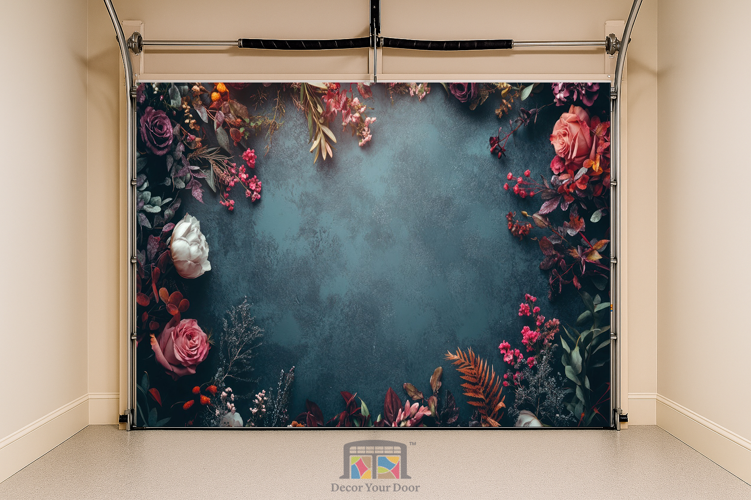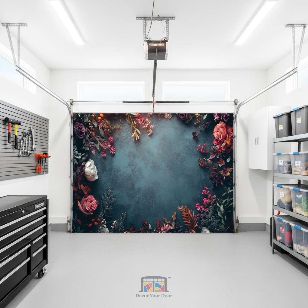 The Midnight Rose Frame Interior Garage Door Cover by Decor Your Door captures timeless romance with a dramatic dark teal background surrounded by elegant blooms in shades of rose, berry, and ivory. Each petal and leaf adds depth and contrast, creating a luxurious frame-like composition. Perfect for bringing a touch of floral sophistication and artistic elegance to any interior space.