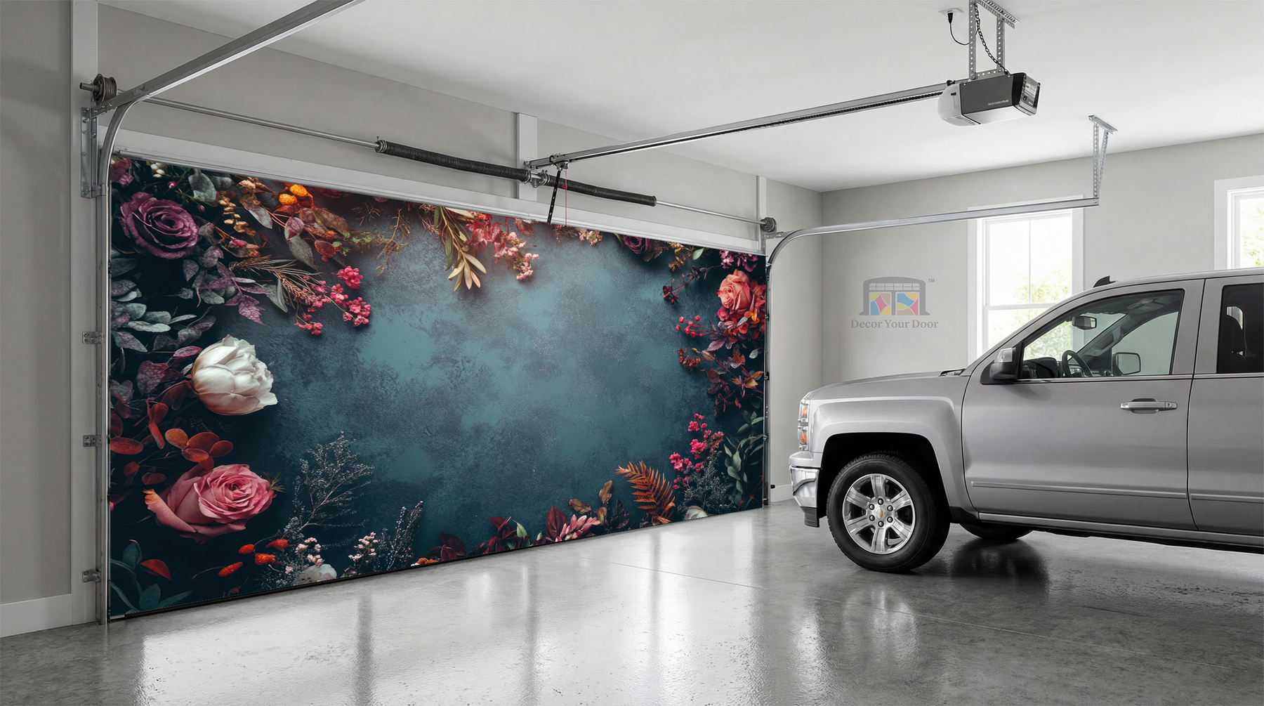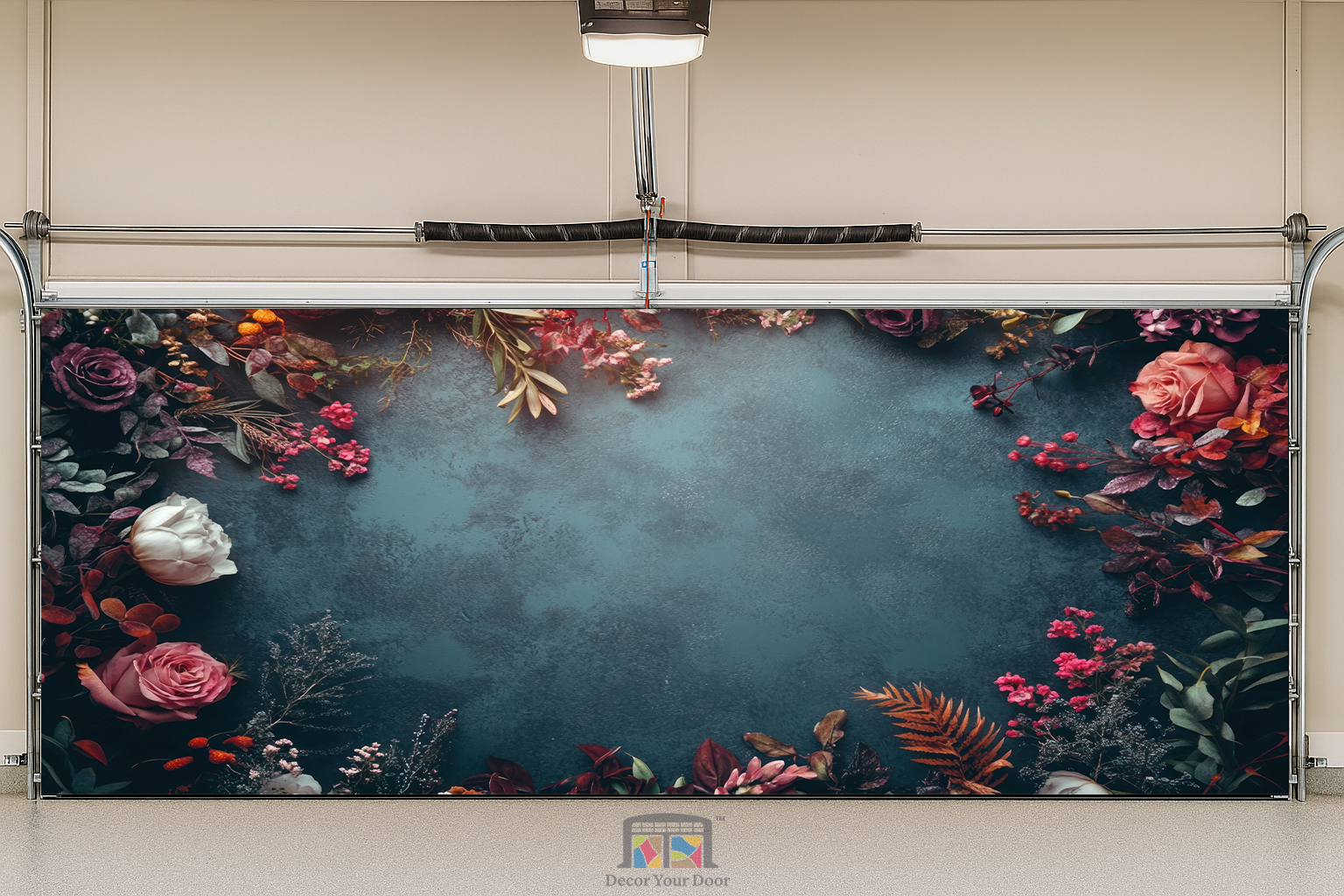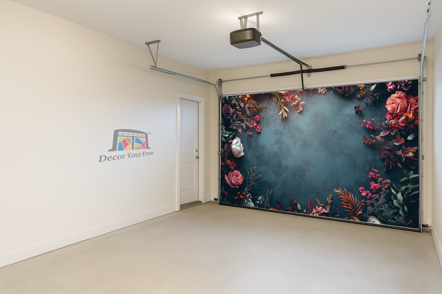 The Midnight Rose Frame Interior Garage Door Cover by Decor Your Door captures timeless romance with a dramatic dark teal background surrounded by elegant blooms in shades of rose, berry, and ivory. Each petal and leaf adds depth and contrast, creating a luxurious frame-like composition. Perfect for bringing a touch of floral sophistication and artistic elegance to any interior space.