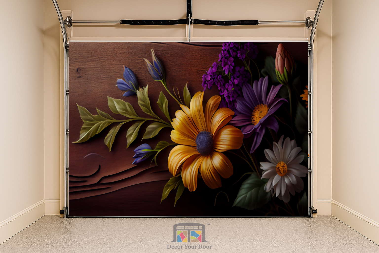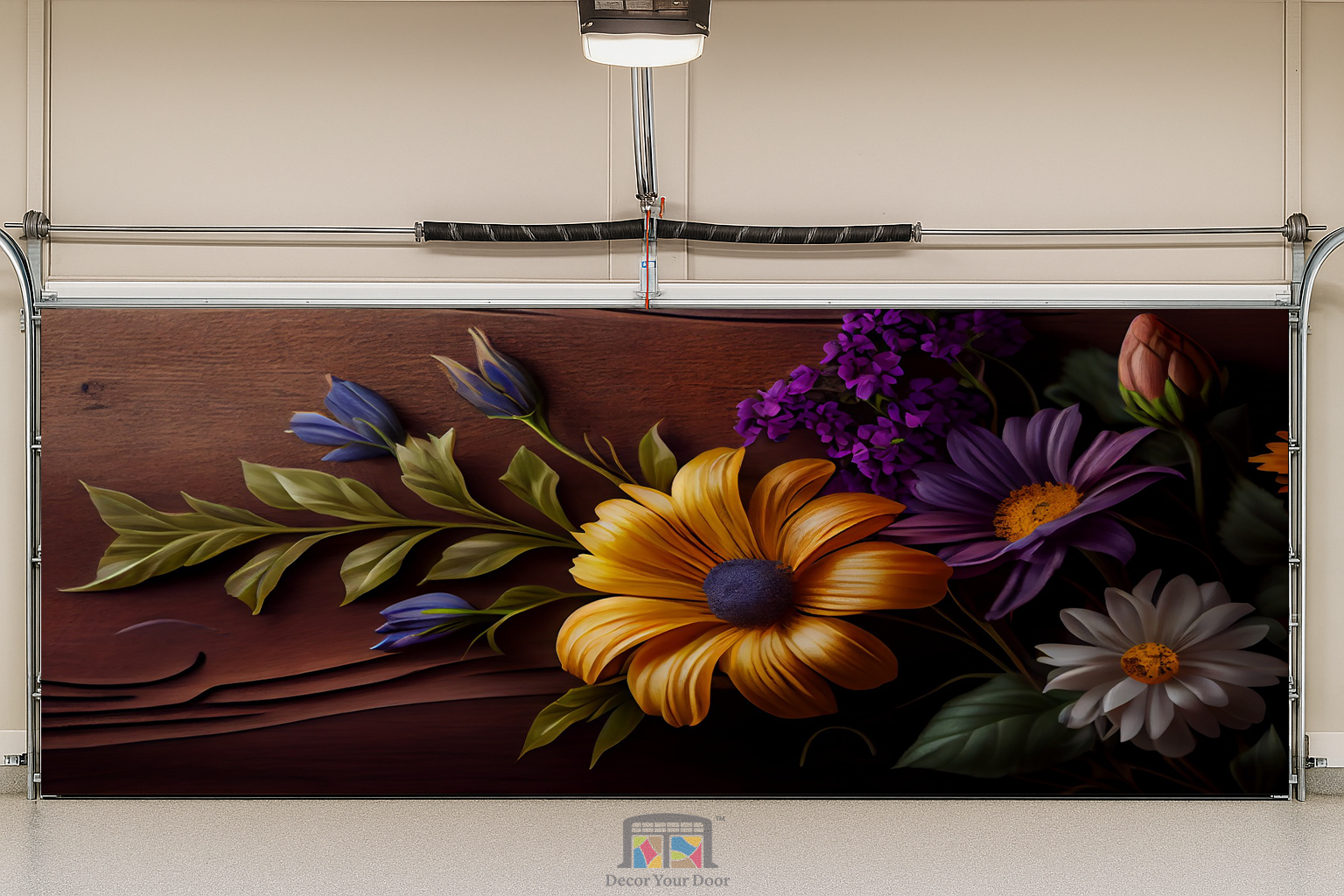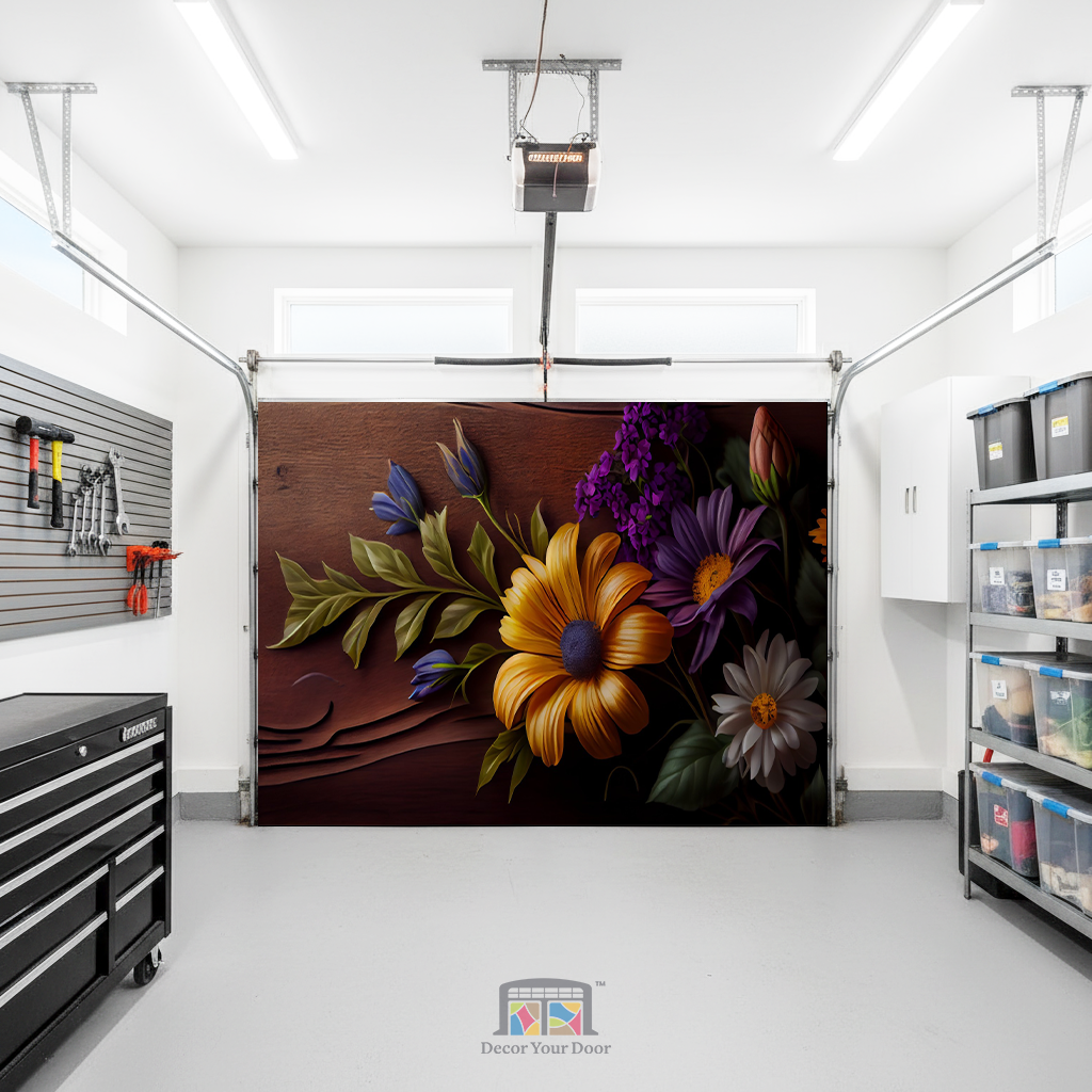 Bring timeless charm to your space with the Rustic Bloom Harmony Interior Garage Door Cover by Decor Your Door. Featuring hand-painted-style flowers in rich shades of gold, violet, and ivory against a warm wooden backdrop, this design blends natural elegance with artistic depth. Perfect for interiors that celebrate warmth and craftsmanship, it adds a cozy, sophisticated touch that feels both organic and refined.