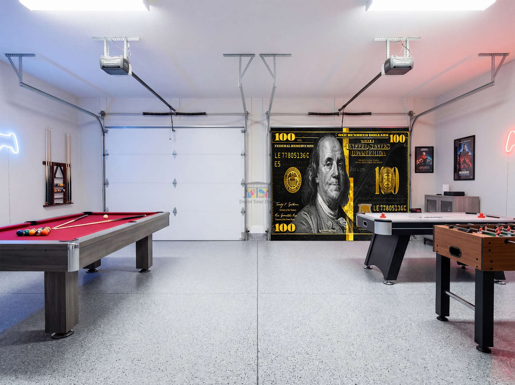 Bring bold energy and high-roller vibes into your game room with the 100 Dollar Bill Power design. This striking artwork transforms your garage into a statement space inspired by success, ambition, and modern street style. The crisp, high-detail money design creates an eye-catching backdrop that instantly upgrades the room’s atmosphere.