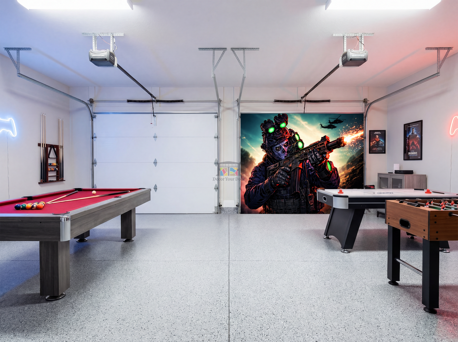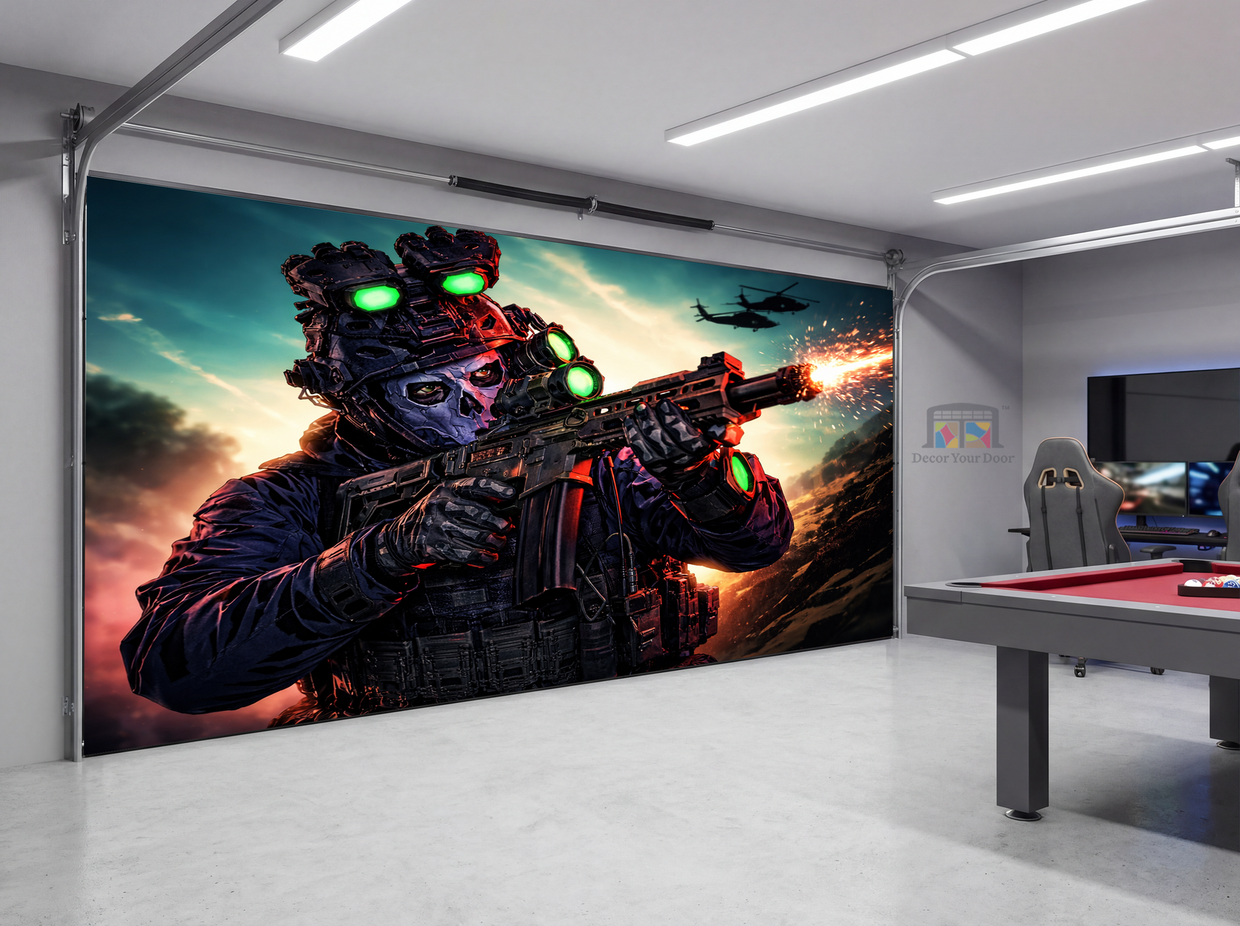 This bold, futuristic design brings elite tactical energy, cinematic lighting, and next-level detail to your game room without overwhelming the space. Printed in ultra-high resolution on premium fabric, it installs easily and still allows your garage door to fully open and close.