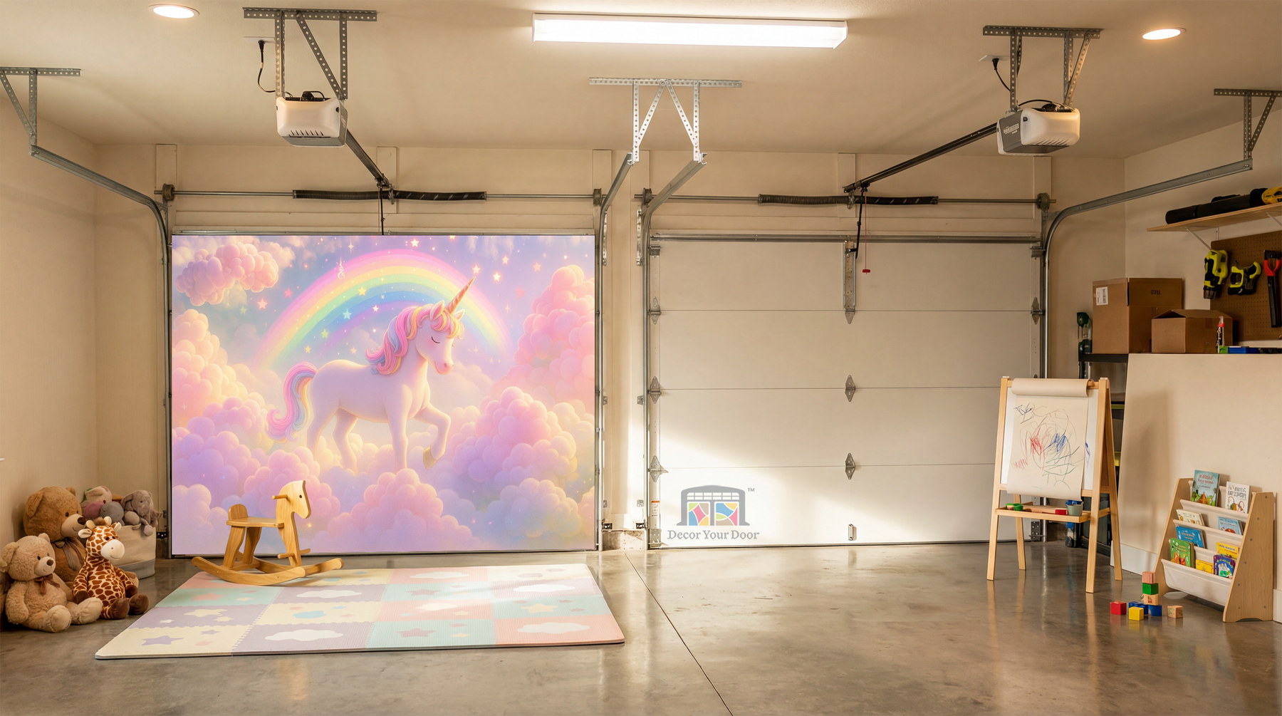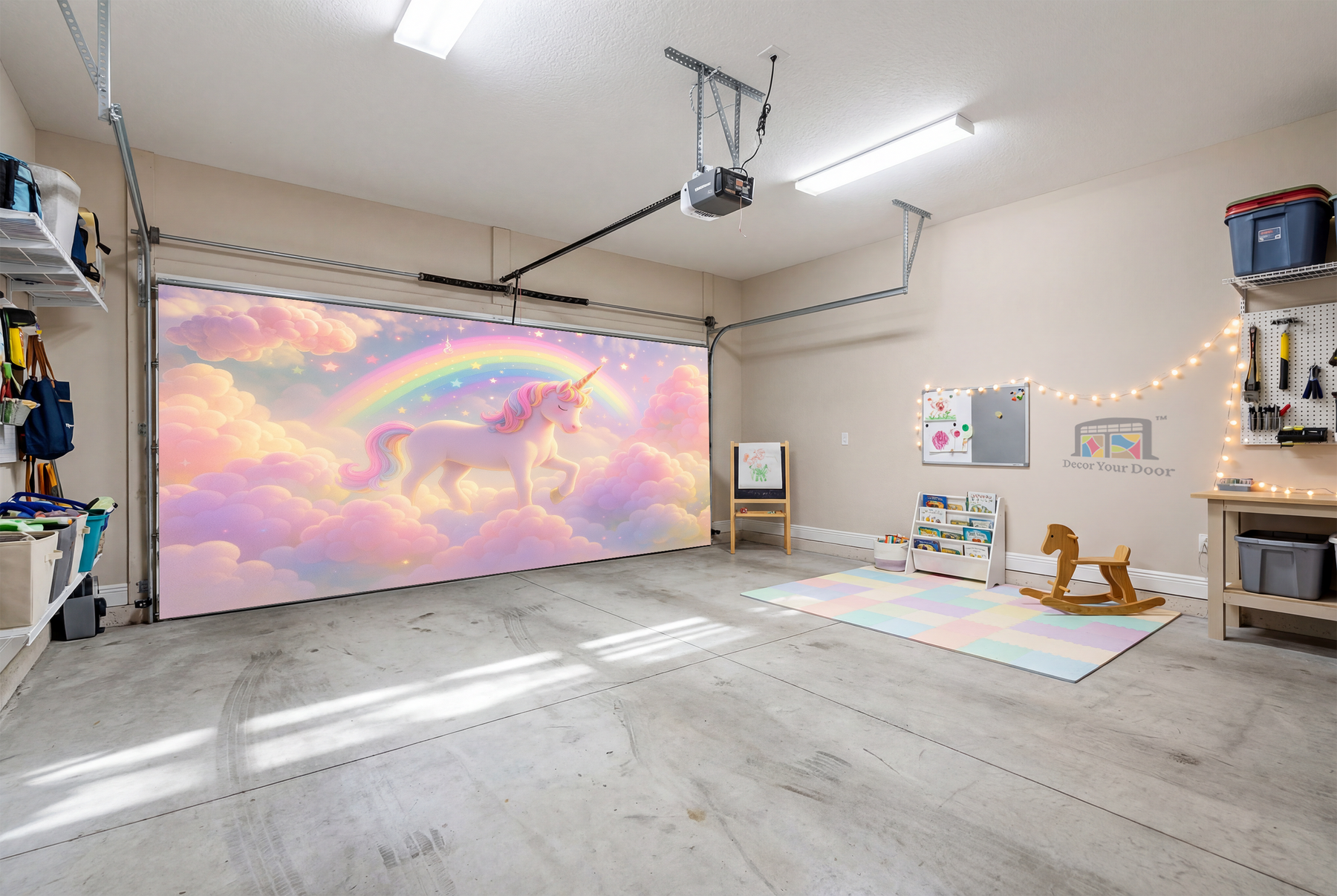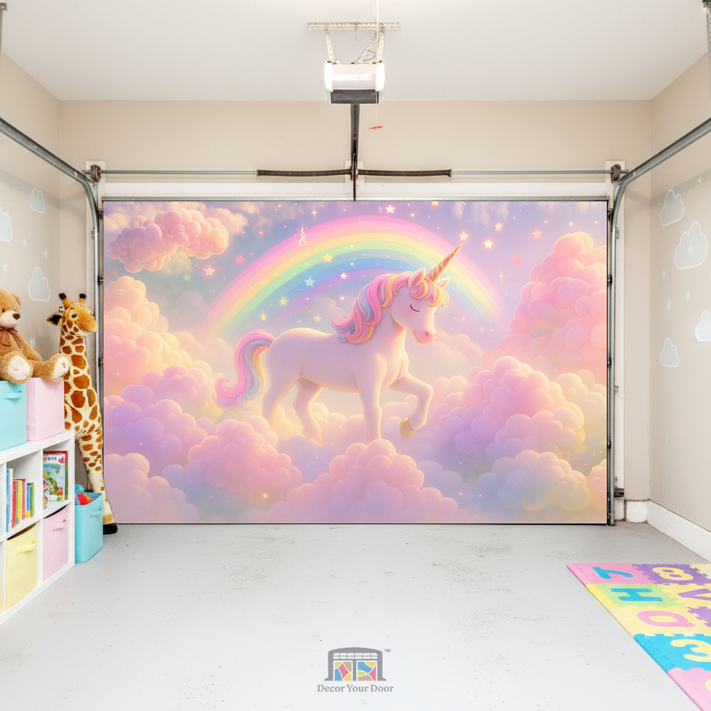 Step into a magical world every time you open your garage. This dreamy nursery-style design features a soft pastel sky filled with clouds, sparkles, and a charming unicorn walking proudly beneath a glowing rainbow. It feels like a fairy tale come to life and instantly turns your space into a playful wonderland for kids and families.