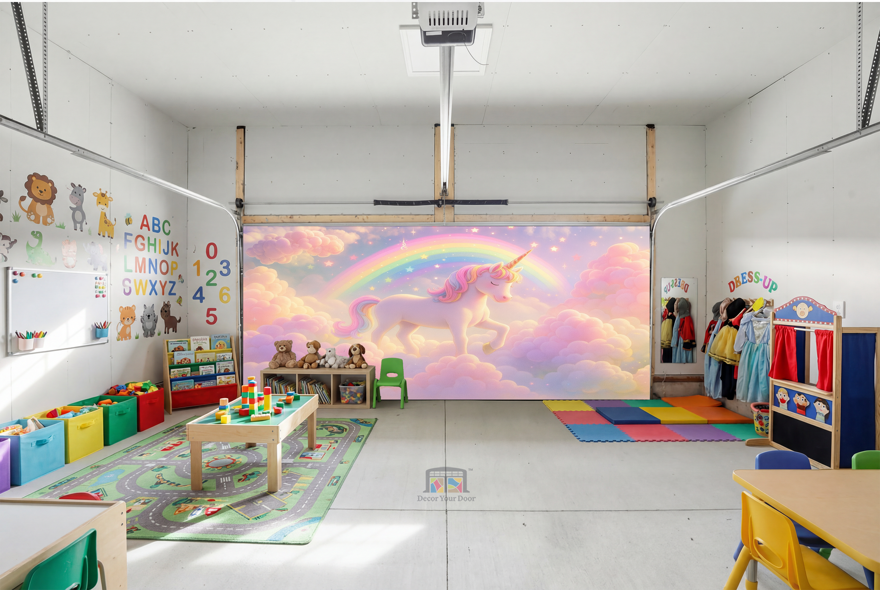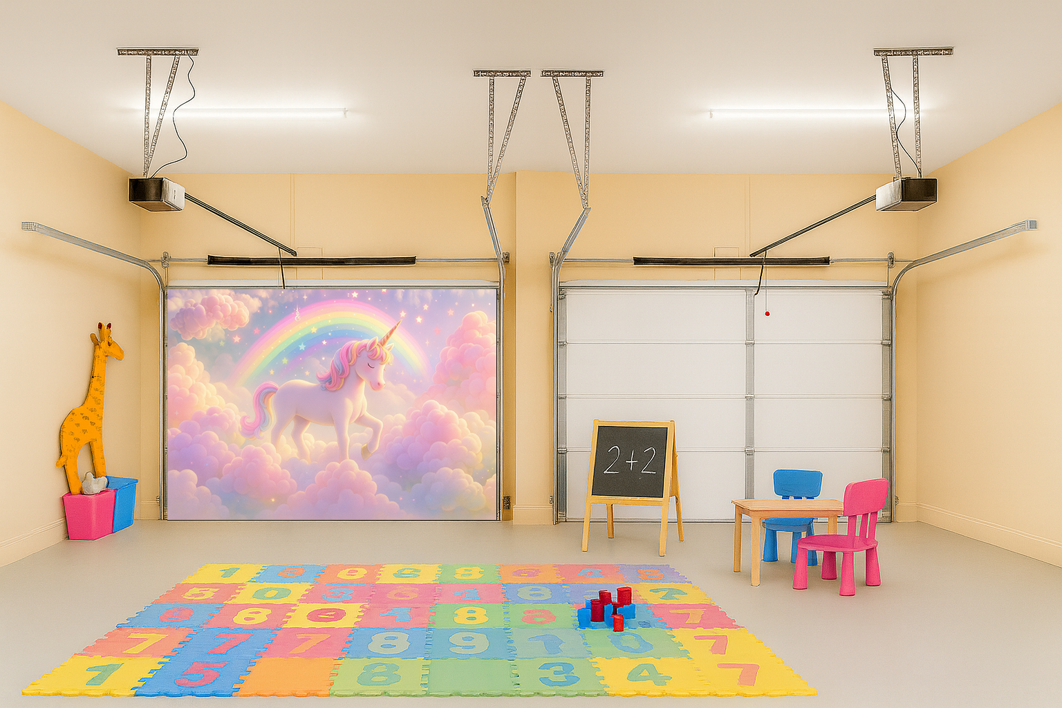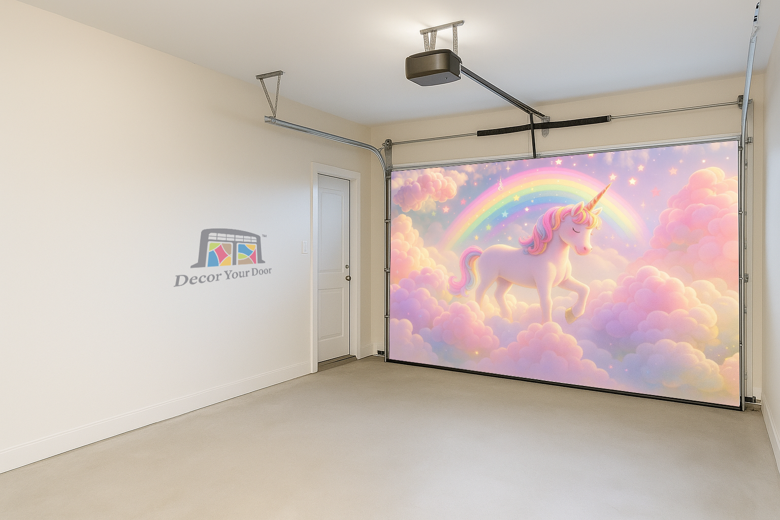 Step into a magical world every time you open your garage. This dreamy nursery-style design features a soft pastel sky filled with clouds, sparkles, and a charming unicorn walking proudly beneath a glowing rainbow. It feels like a fairy tale come to life and instantly turns your space into a playful wonderland for kids and families.