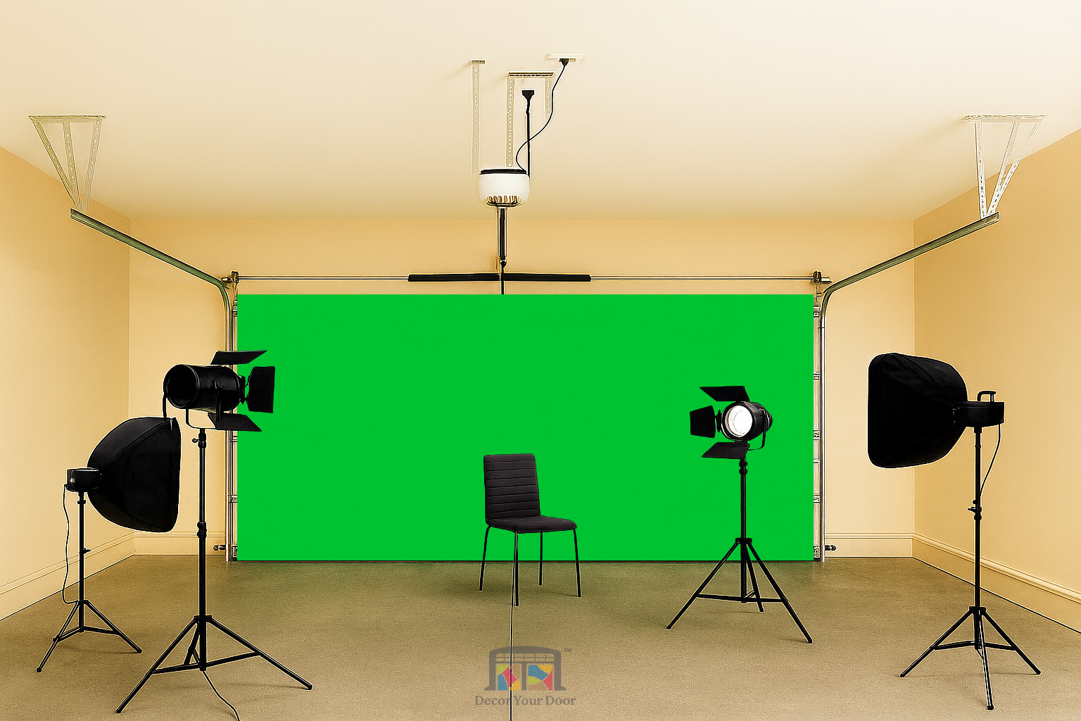 Transform your garage into a real studio with this chroma key green cover. Perfect for filming, photography, live streaming, creative projects, and product demos. Once attached, your garage becomes a blank canvas ready for any background or visual effect. By Decor Your Door.