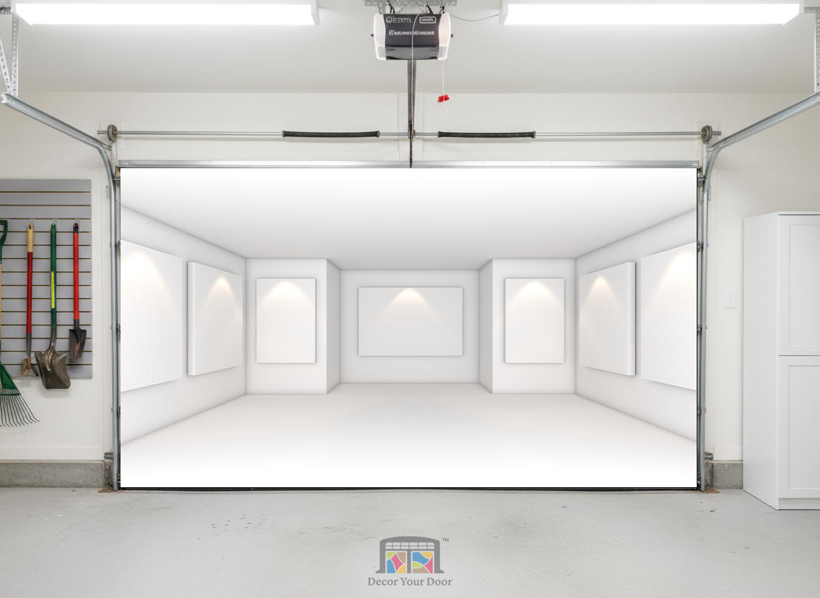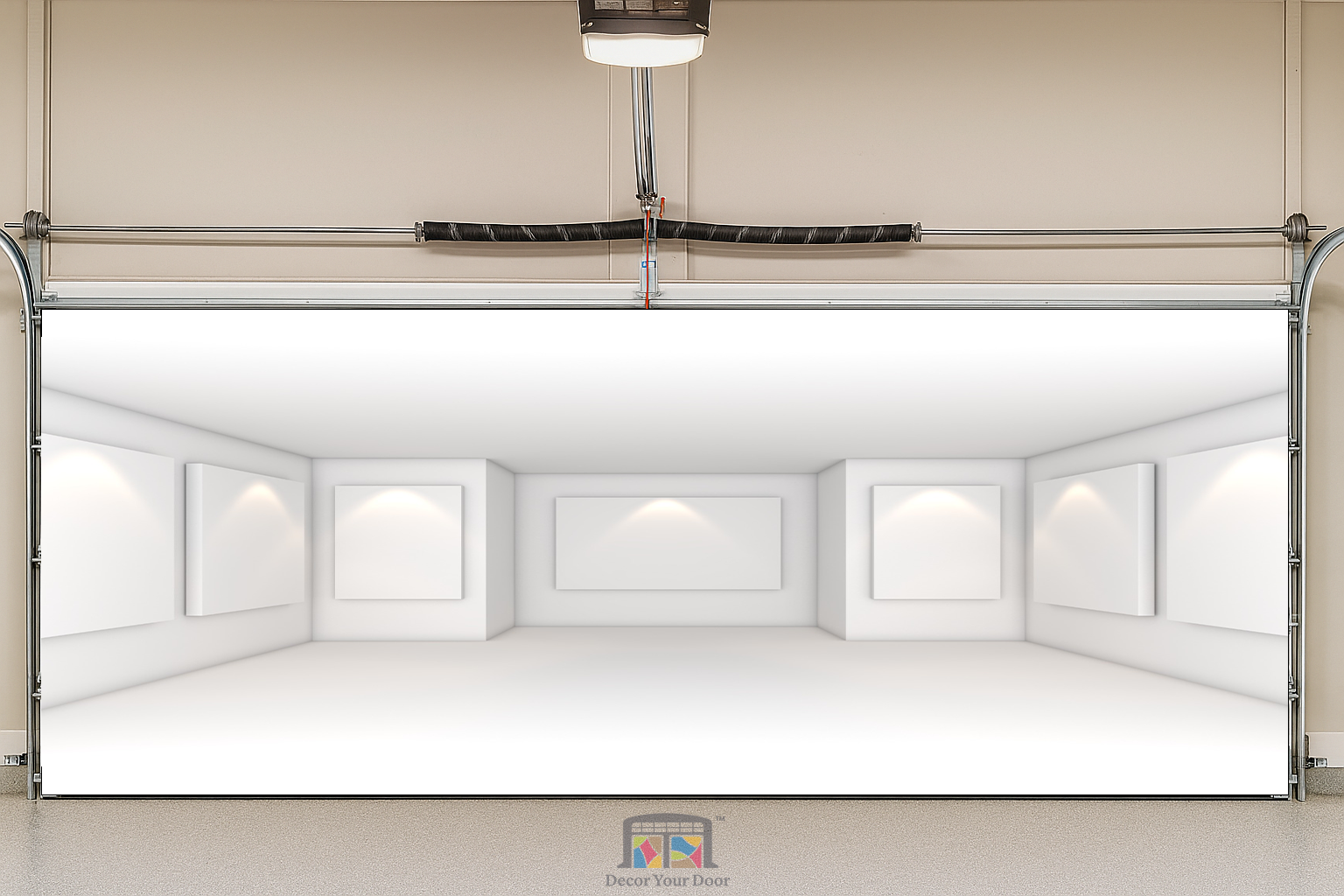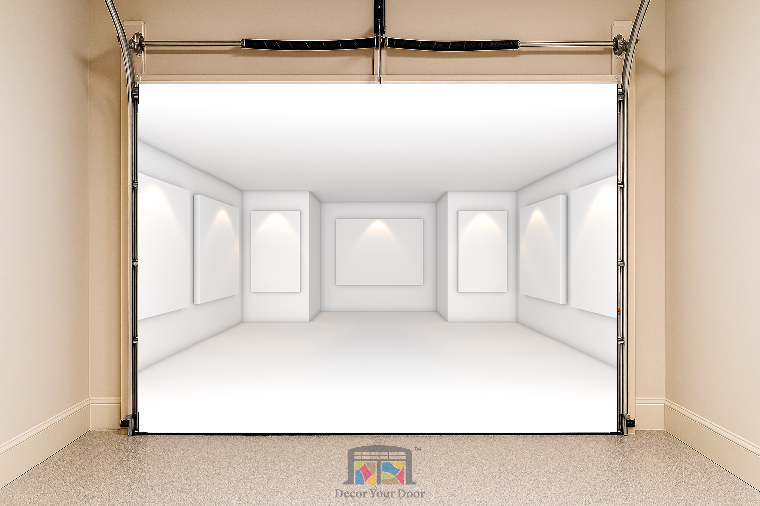 Turn your garage into a modern art space with this clean gallery-style design. Soft spotlights and blank panels create the perfect illusion of a contemporary showroom right inside your garage. By Decor Your Door, this cover brings a premium designer feel that transforms your garage into a bright and spacious feature wall. Ideal for anyone who loves minimalist aesthetics and wants a sleek visual upgrade with real modern appeal.