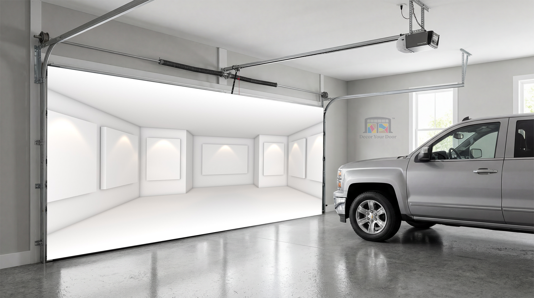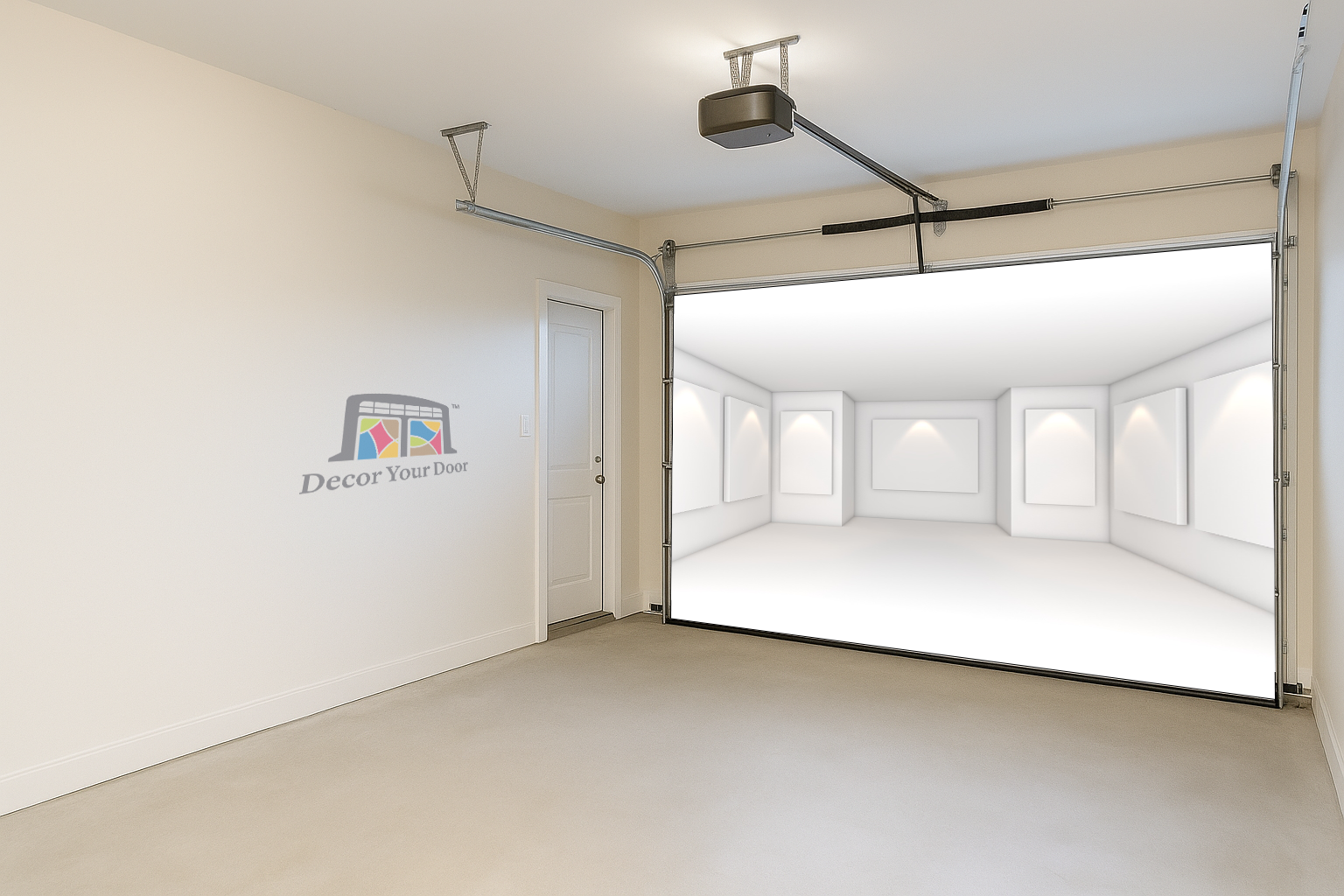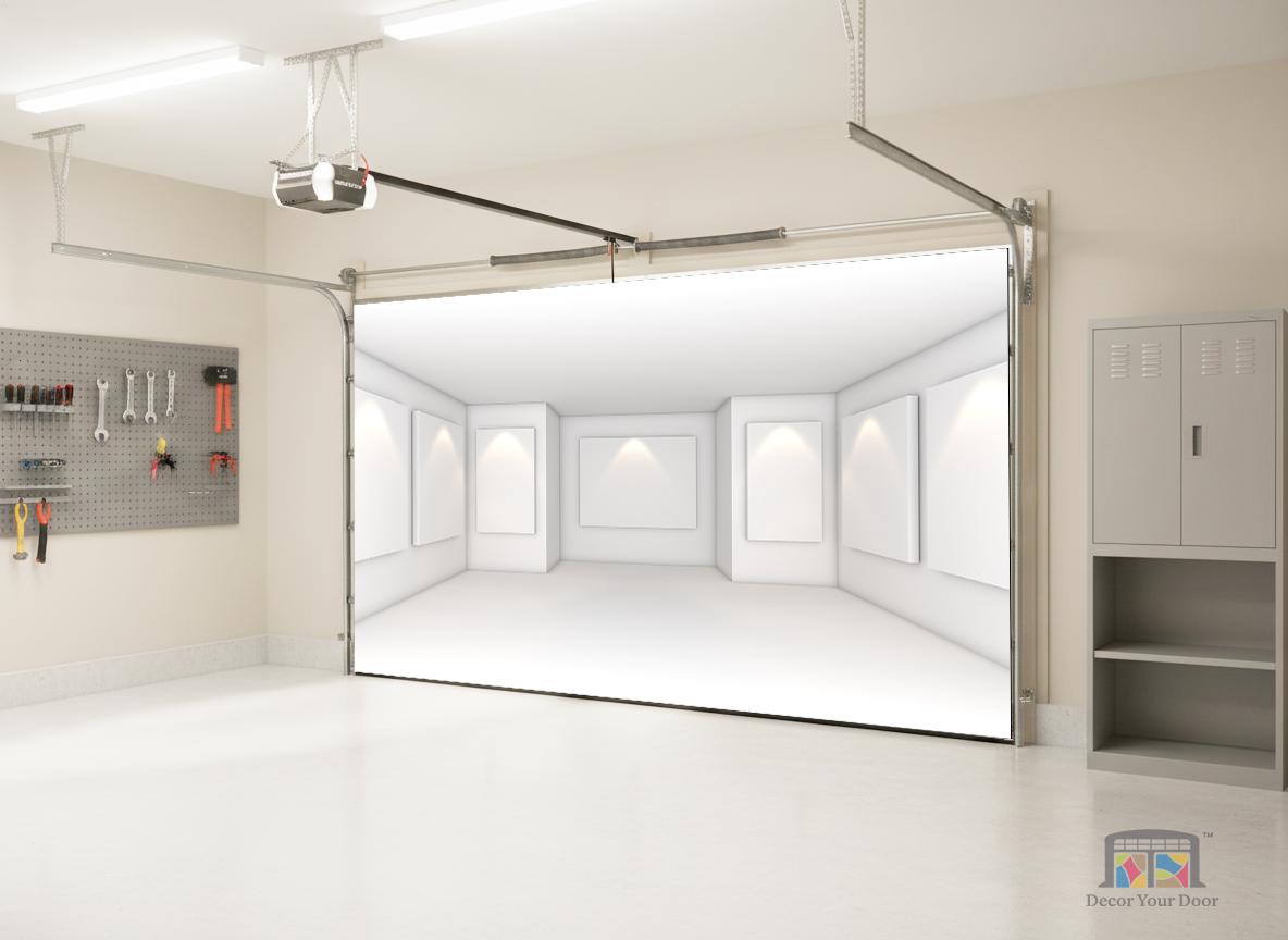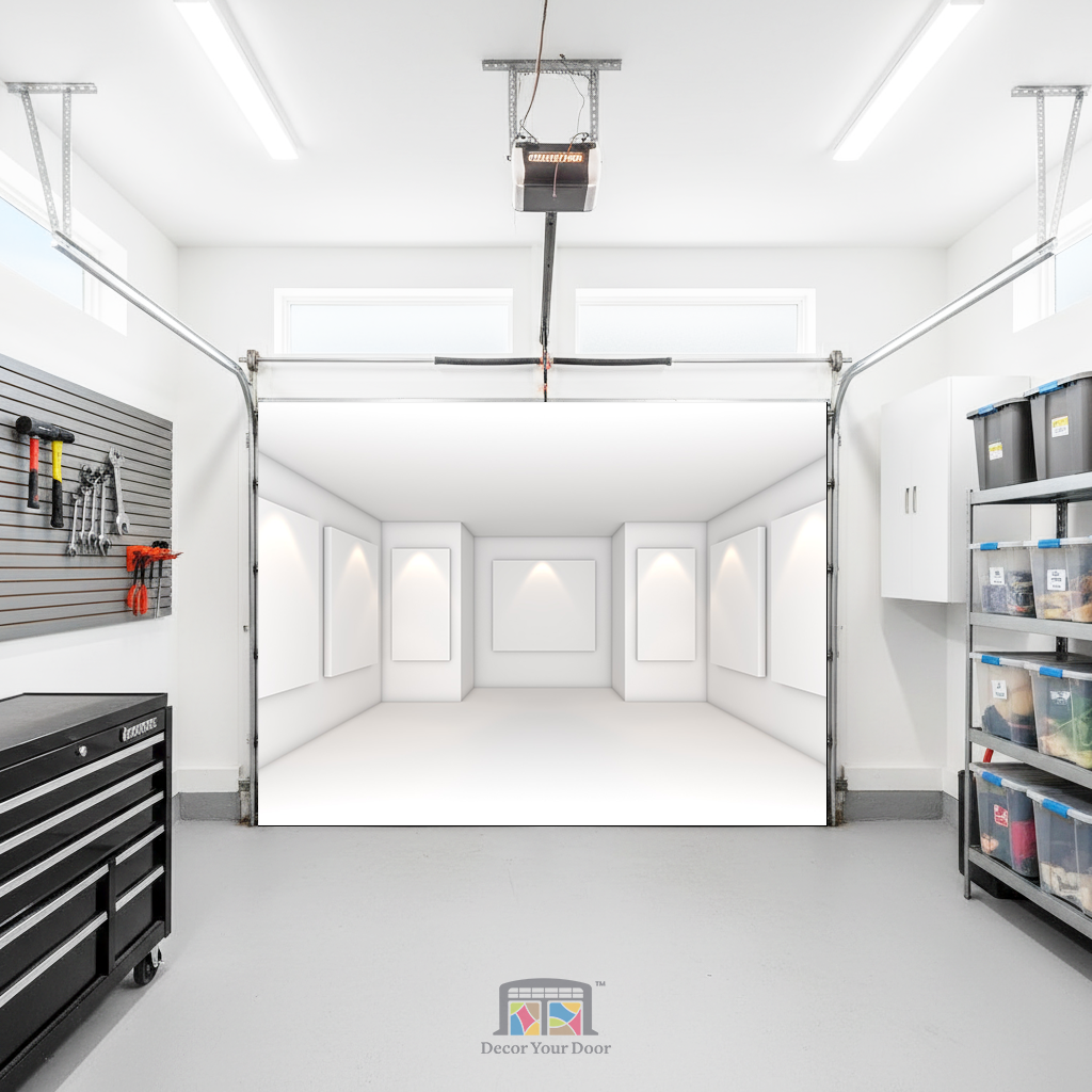 Turn your garage into a modern art space with this clean gallery-style design. Soft spotlights and blank panels create the perfect illusion of a contemporary showroom right inside your garage. By Decor Your Door, this cover brings a premium designer feel that transforms your garage into a bright and spacious feature wall. Ideal for anyone who loves minimalist aesthetics and wants a sleek visual upgrade with real modern appeal.