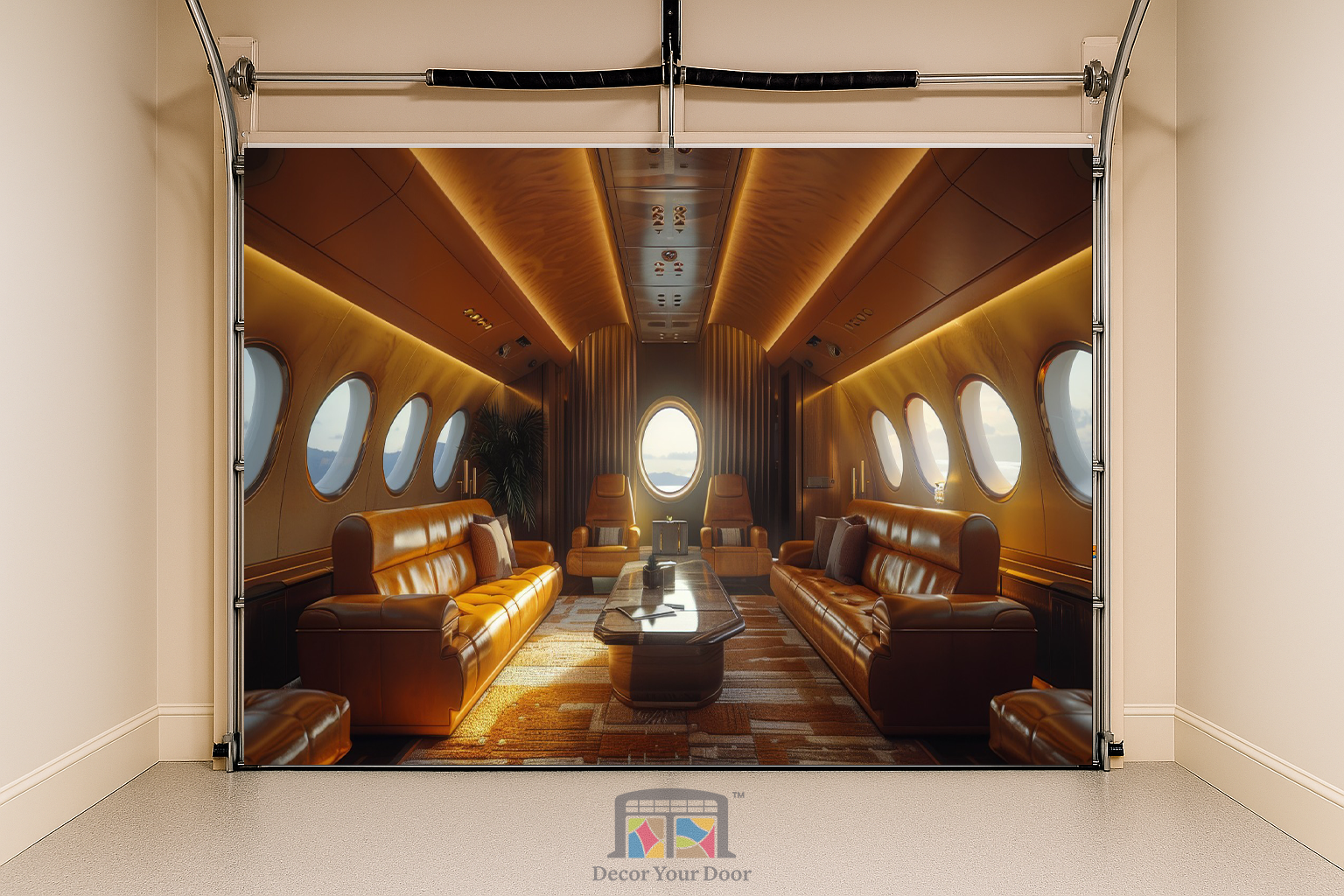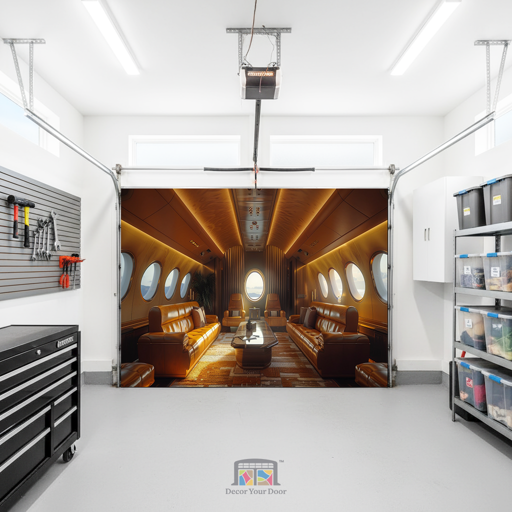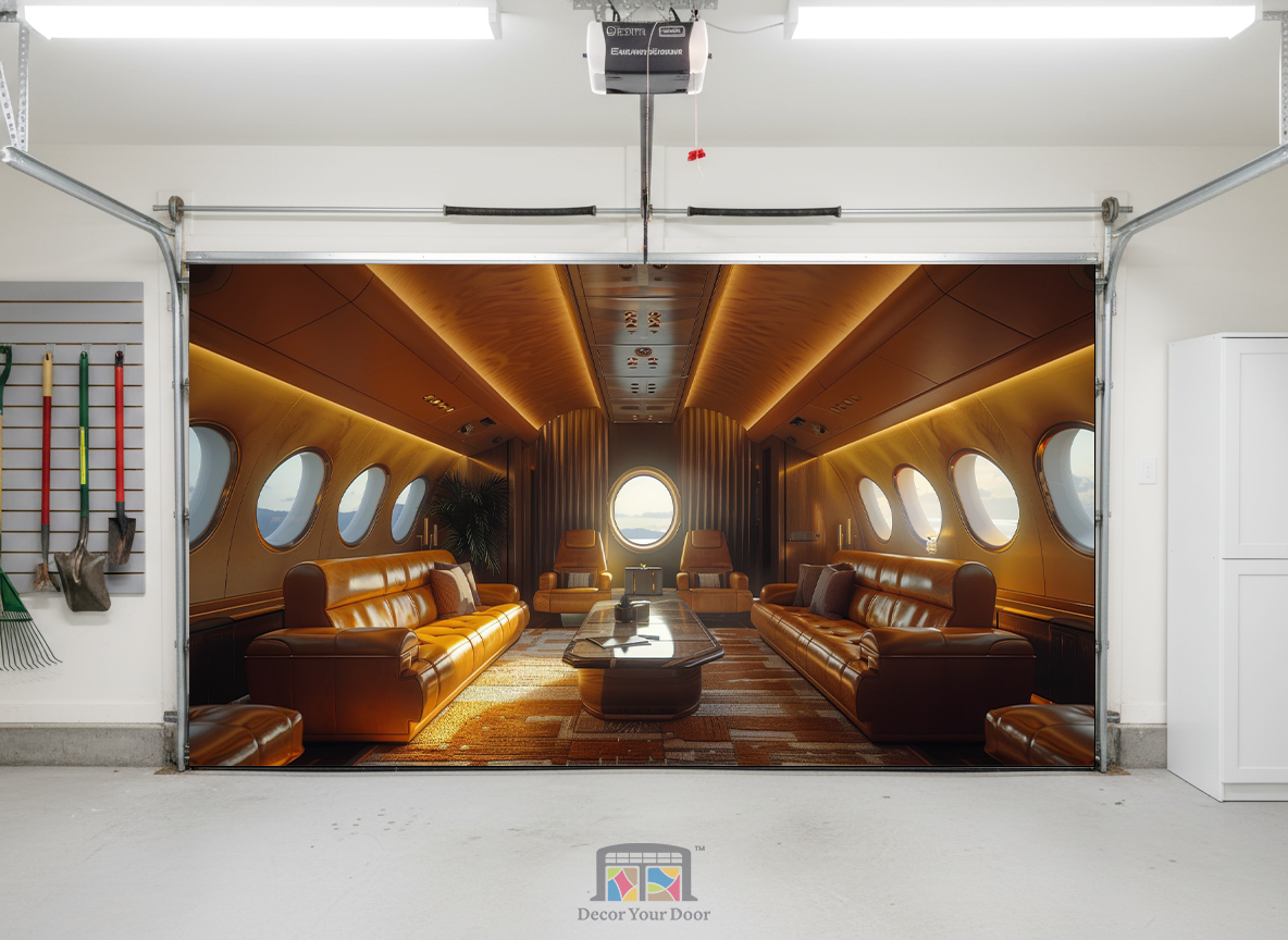 Transform your garage into a first-class escape with this ultra modern private jet interior. Soft golden lighting, rich leather seating, and panoramic window views create the feeling of luxury travel right from home. By Decor Your Door.