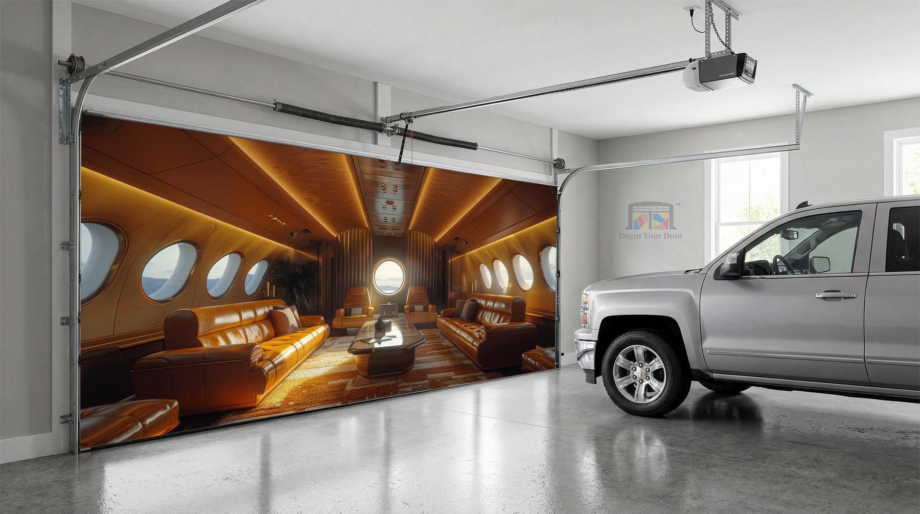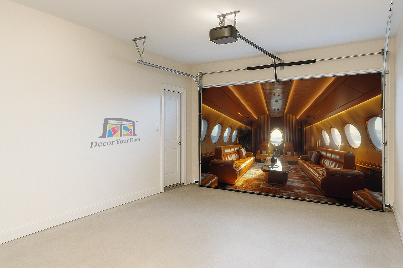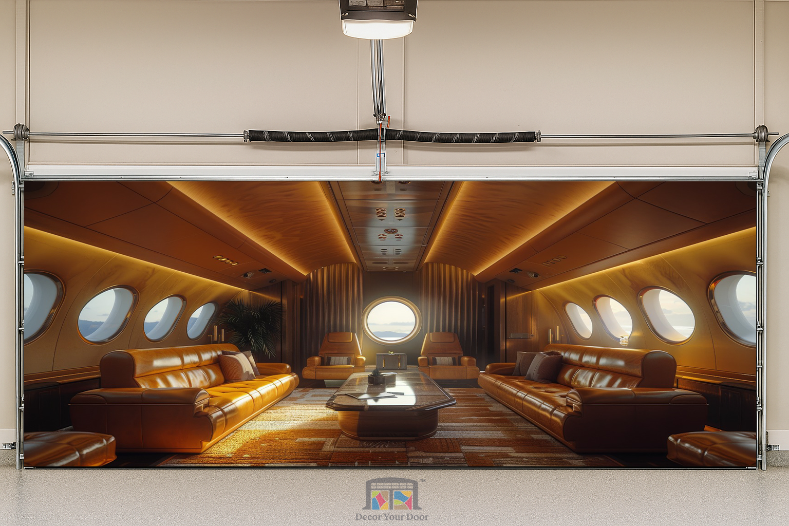 Transform your garage into a first-class escape with this ultra modern private jet interior. Soft golden lighting, rich leather seating, and panoramic window views create the feeling of luxury travel right from home. By Decor Your Door.