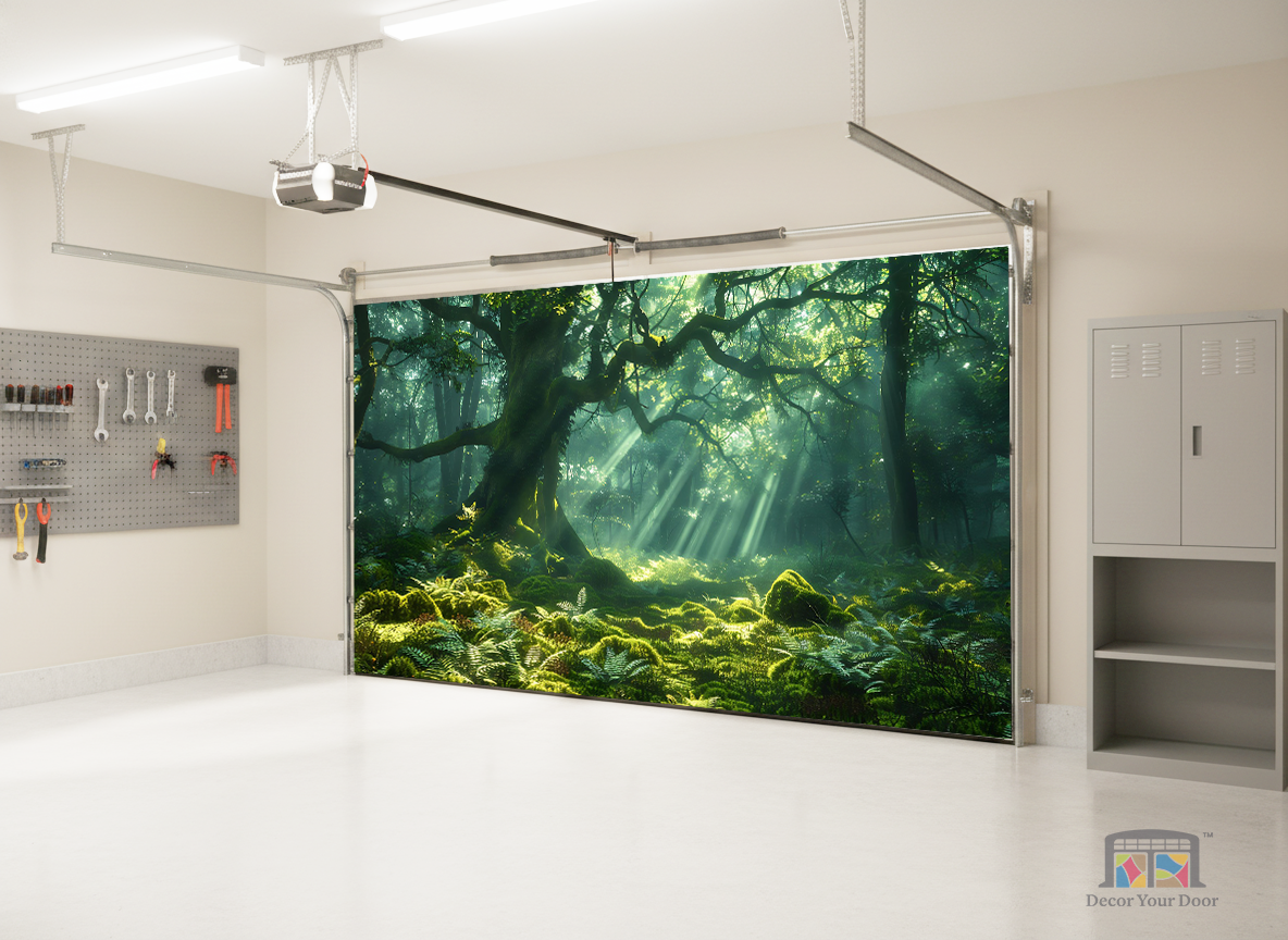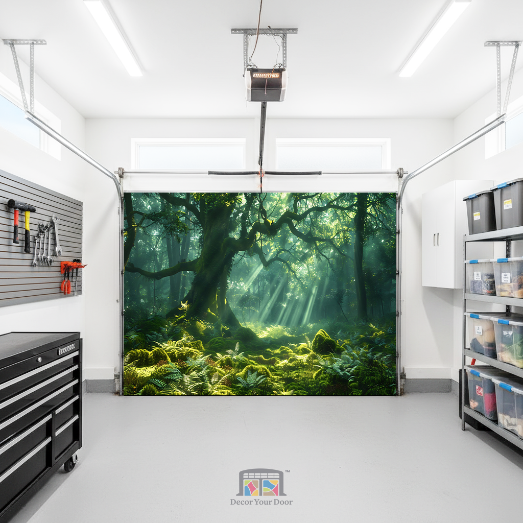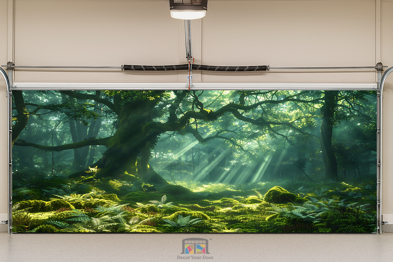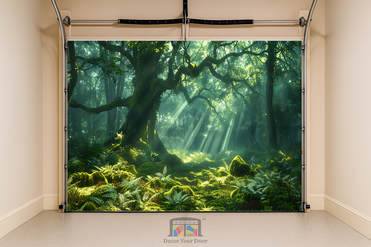 Step into a world of peace and wonder with the Enchanted Forest Light Interior Garage Door Cover by Decor Your Door. This breathtaking design captures sunlight streaming through ancient trees, illuminating soft moss and ferns below. The realistic lighting and depth make your space feel like a hidden forest retreat, transforming your interior garage into a serene sanctuary of nature and calm. Perfect for those who love greenery, tranquility, and timeless natural beauty.