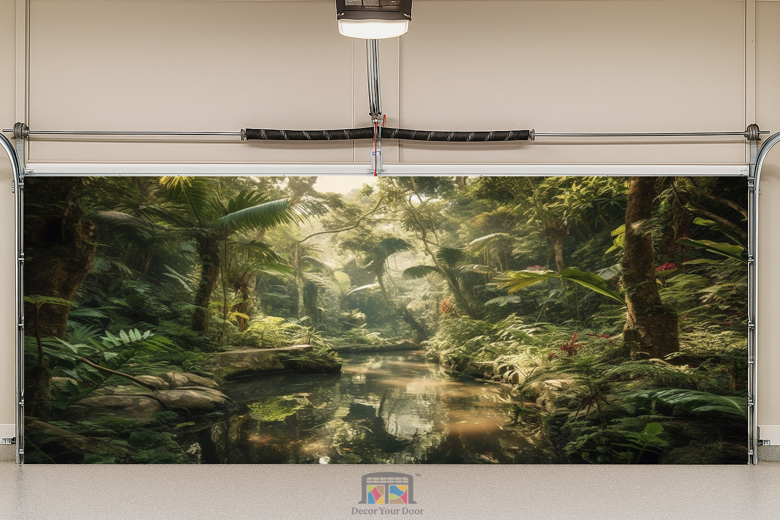 Immerse yourself in the calm beauty of untouched nature with the Serenity Jungle Stream Interior Garage Door Coverby Decor Your Door. This peaceful scene features a soft, golden glow filtering through lush tropical trees and reflecting on a tranquil jungle river. Surrounded by ferns, palms, and vibrant greenery, this design brings the soothing energy of a rainforest oasis straight into your space, offering a relaxing and rejuvenating atmosphere every time you open your garage.