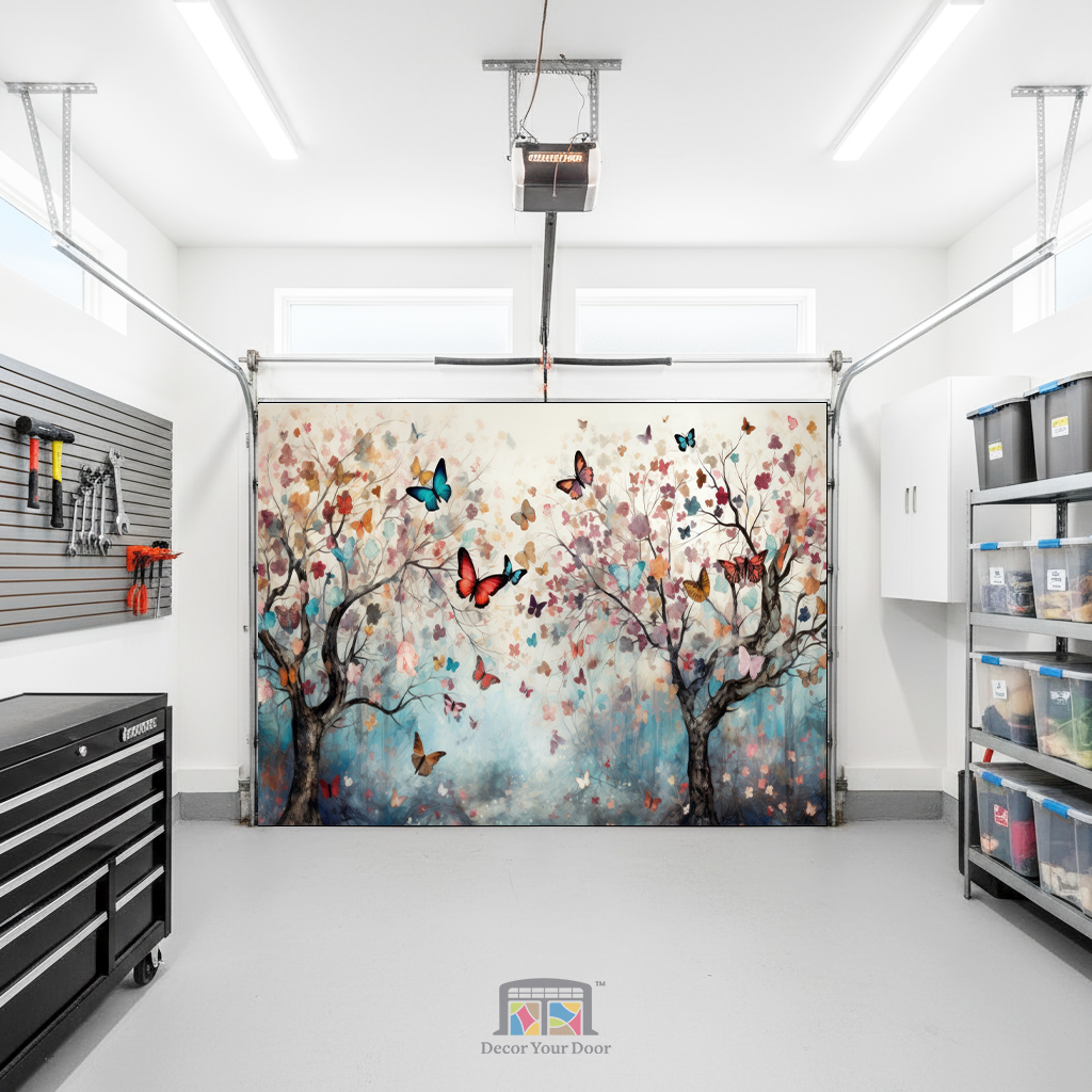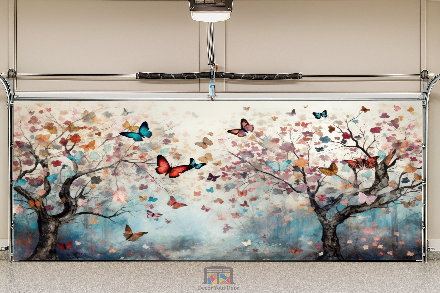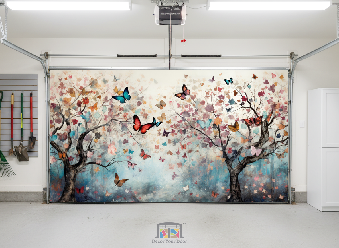 The Butterfly Blossom Symphony Interior Garage Door Cover by Decor Your Door transforms your space into a poetic dreamscape of fluttering color and motion. Gentle trees adorned with pastel leaves and delicate butterflies create a sense of freedom and renewal. This elegant design brings life, grace, and a soft artistic touch to any interior, inspiring calm and creativity every time you walk in.