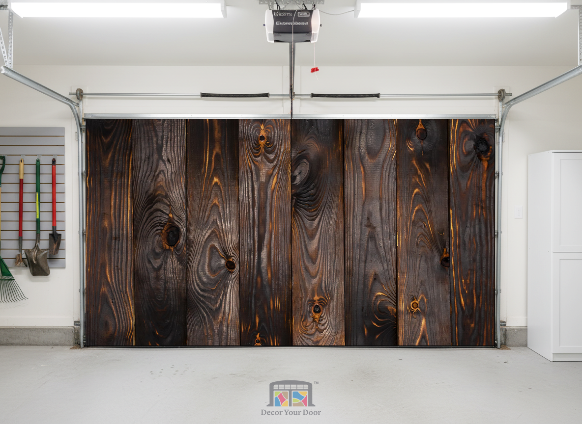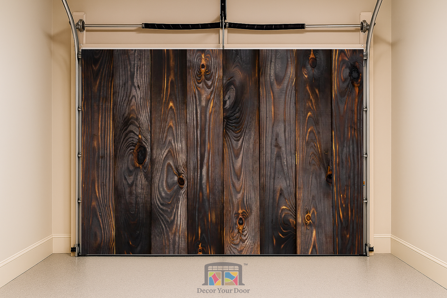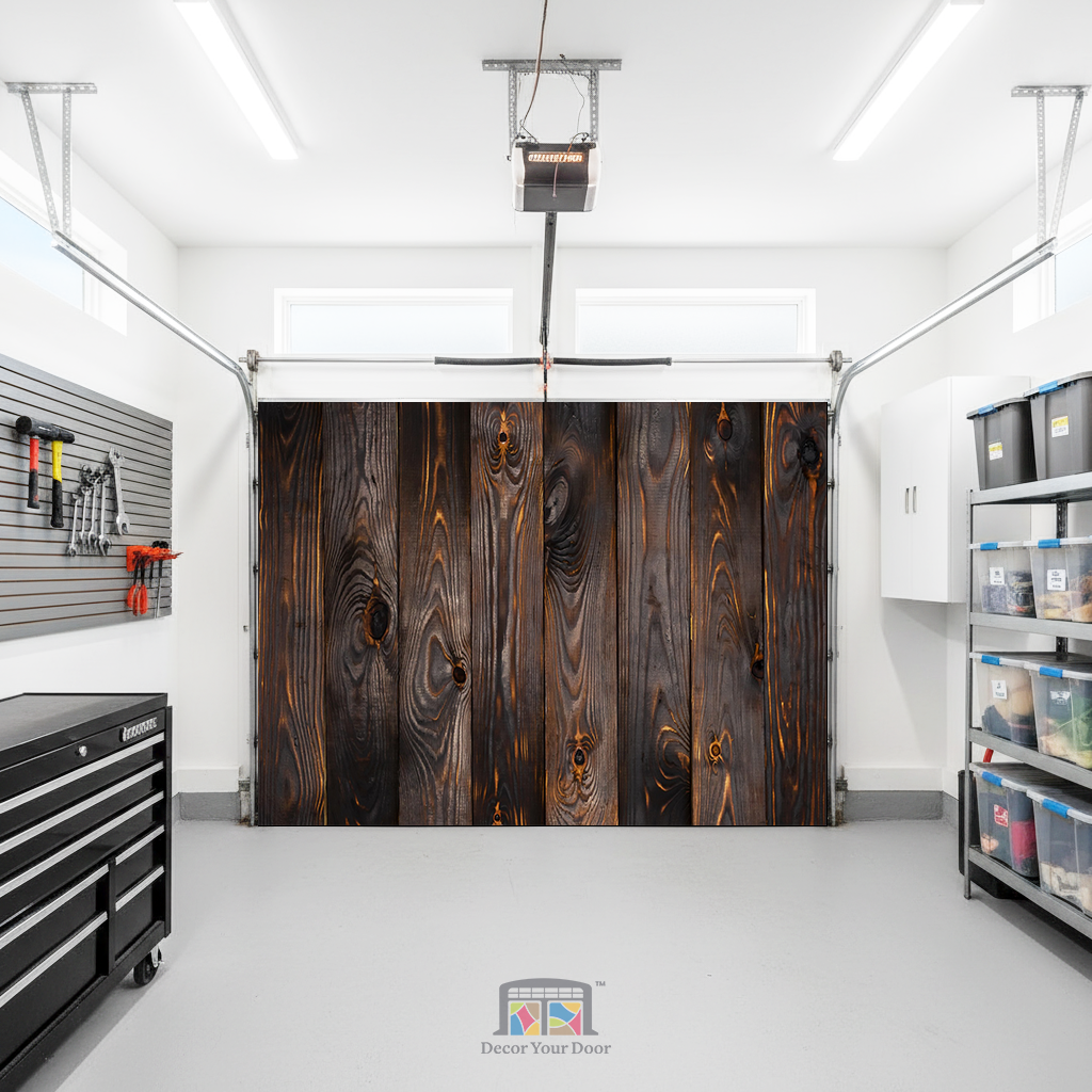 A bold and rustic design that brings the beauty of burnt timber right into your garage. The deep brown grains and natural charred textures give a modern yet earthy feel that completely transforms plain walls into a striking visual feature. Perfect for creating a warm workshop vibe, a stylish man cave, or a cozy cabin-style atmosphere. Upgrade your garage with the rich character of real wood and make it feel intentionally designed, not just used for storage. By Decor Your Door.