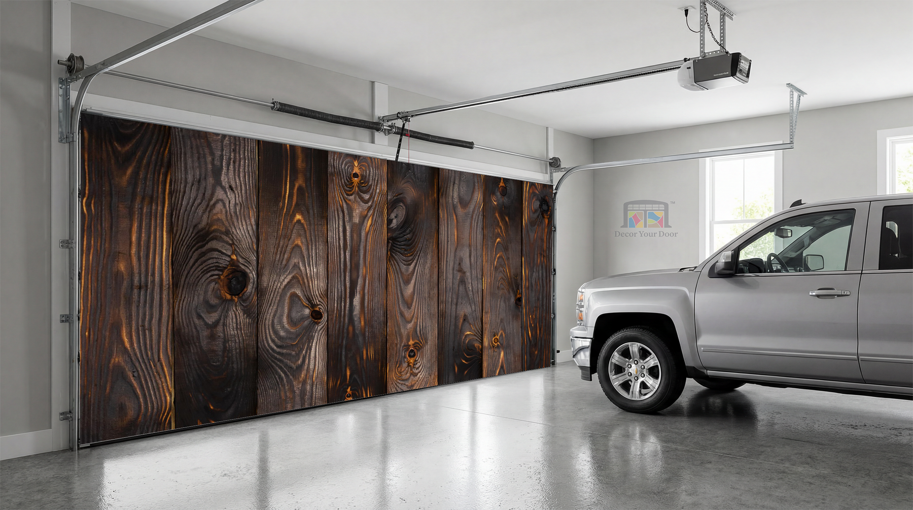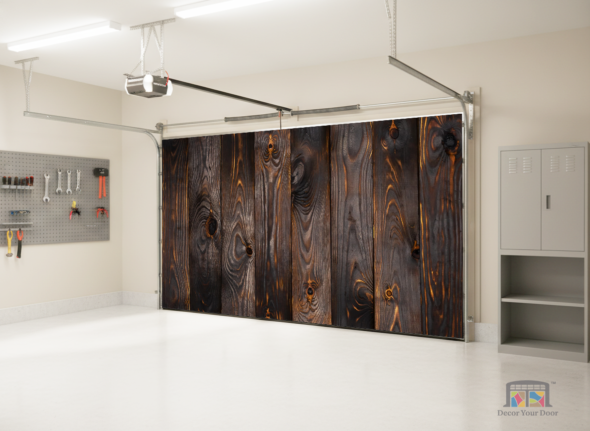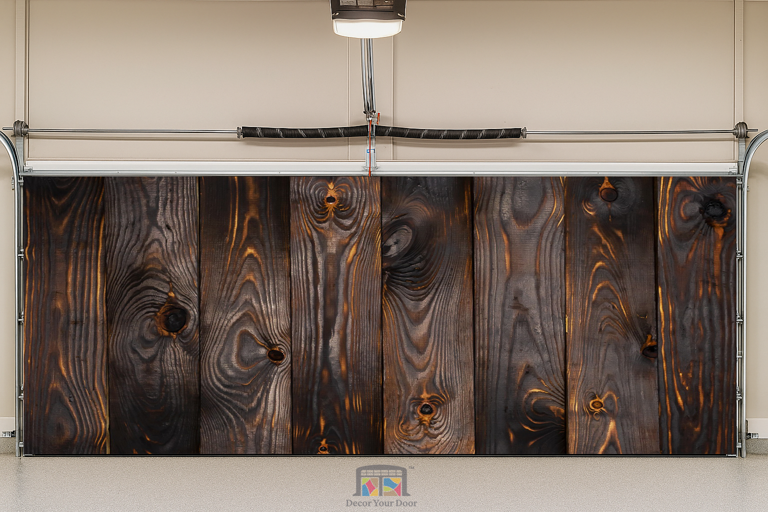 A bold and rustic design that brings the beauty of burnt timber right into your garage. The deep brown grains and natural charred textures give a modern yet earthy feel that completely transforms plain walls into a striking visual feature. Perfect for creating a warm workshop vibe, a stylish man cave, or a cozy cabin-style atmosphere. Upgrade your garage with the rich character of real wood and make it feel intentionally designed, not just used for storage. By Decor Your Door.