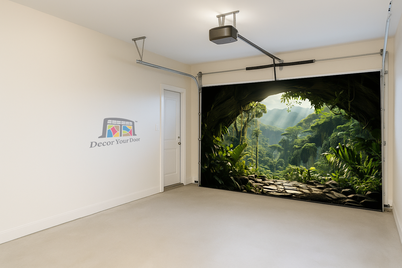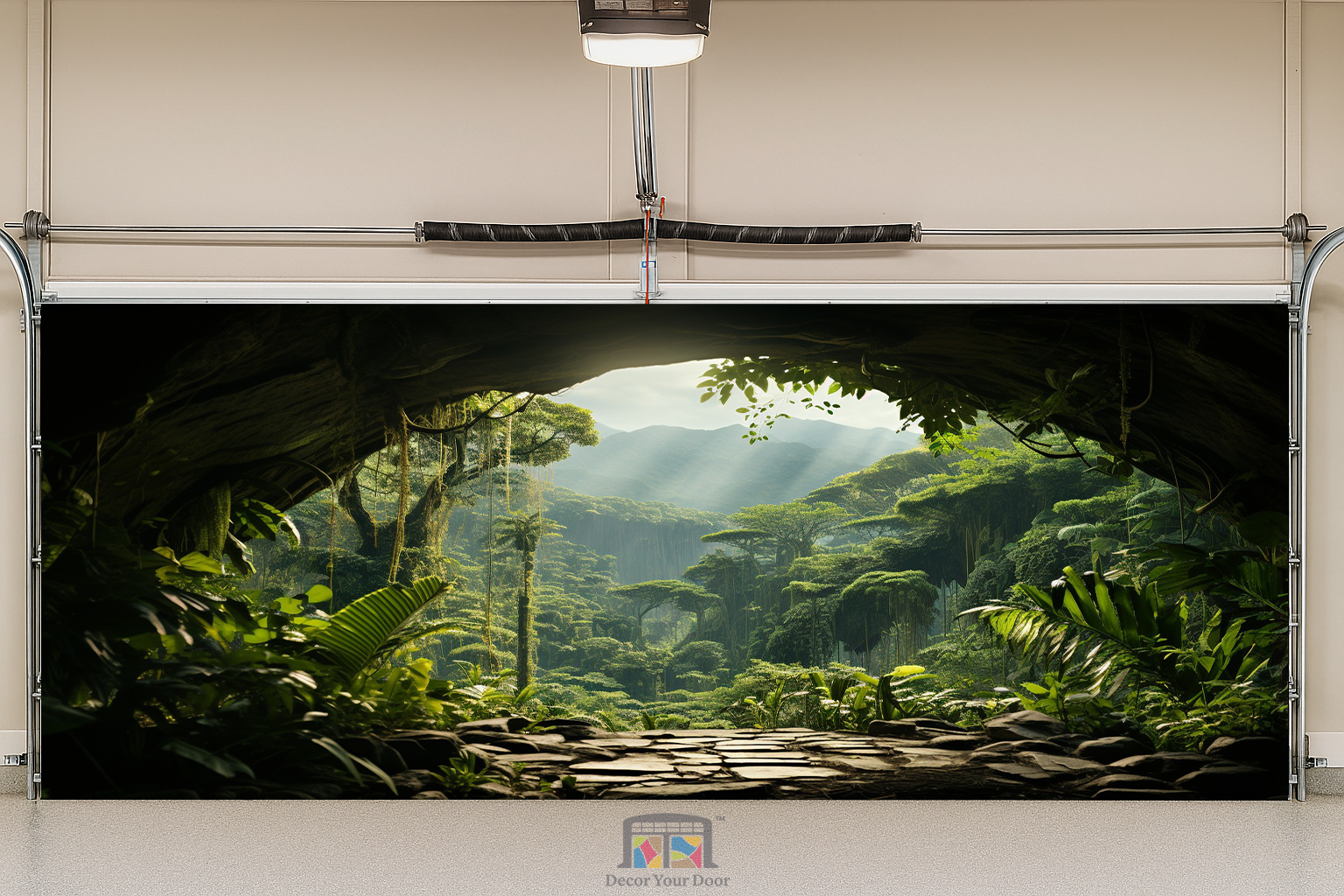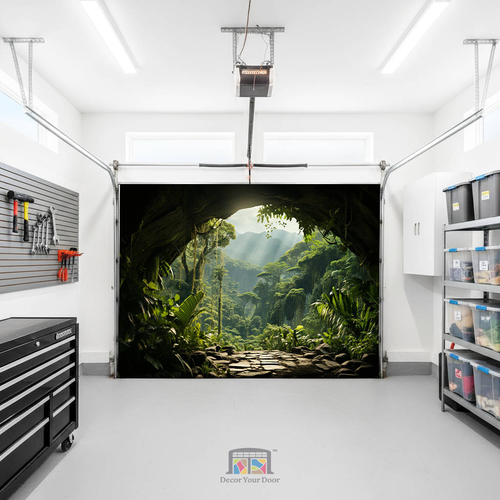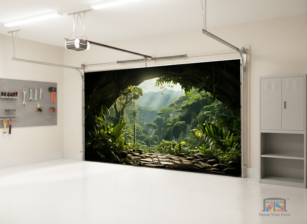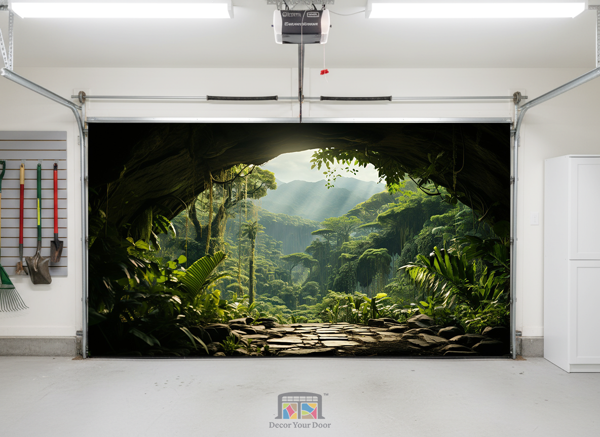Step into a secret paradise with the Hidden Valley View Interior Garage Door Cover by Decor Your Door. Designed to look like you’re standing at the mouth of a lush jungle cave, this breathtaking scene reveals towering trees, soft sunlight, and misty mountains beyond. The lifelike depth and natural lighting bring an immersive escape to your space, turning your garage interior into a peaceful tropical retreat filled with calm and wonder.