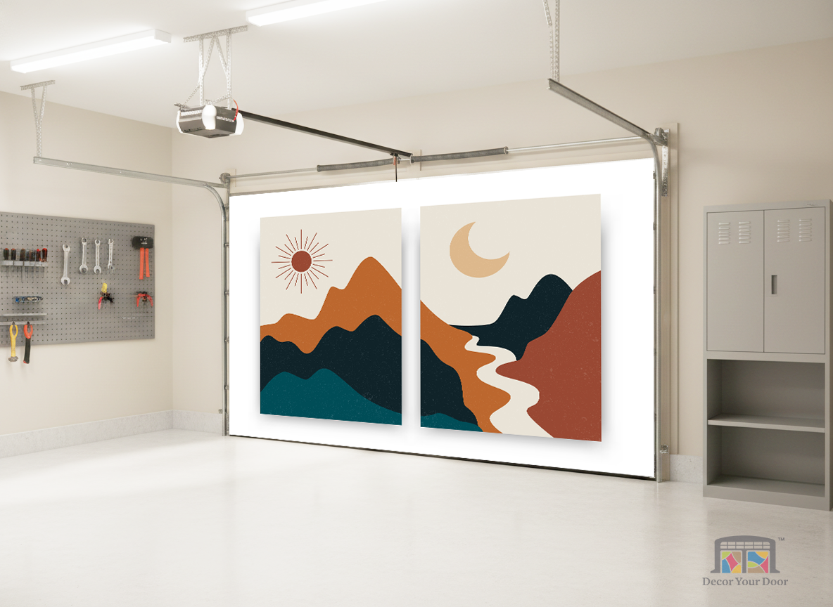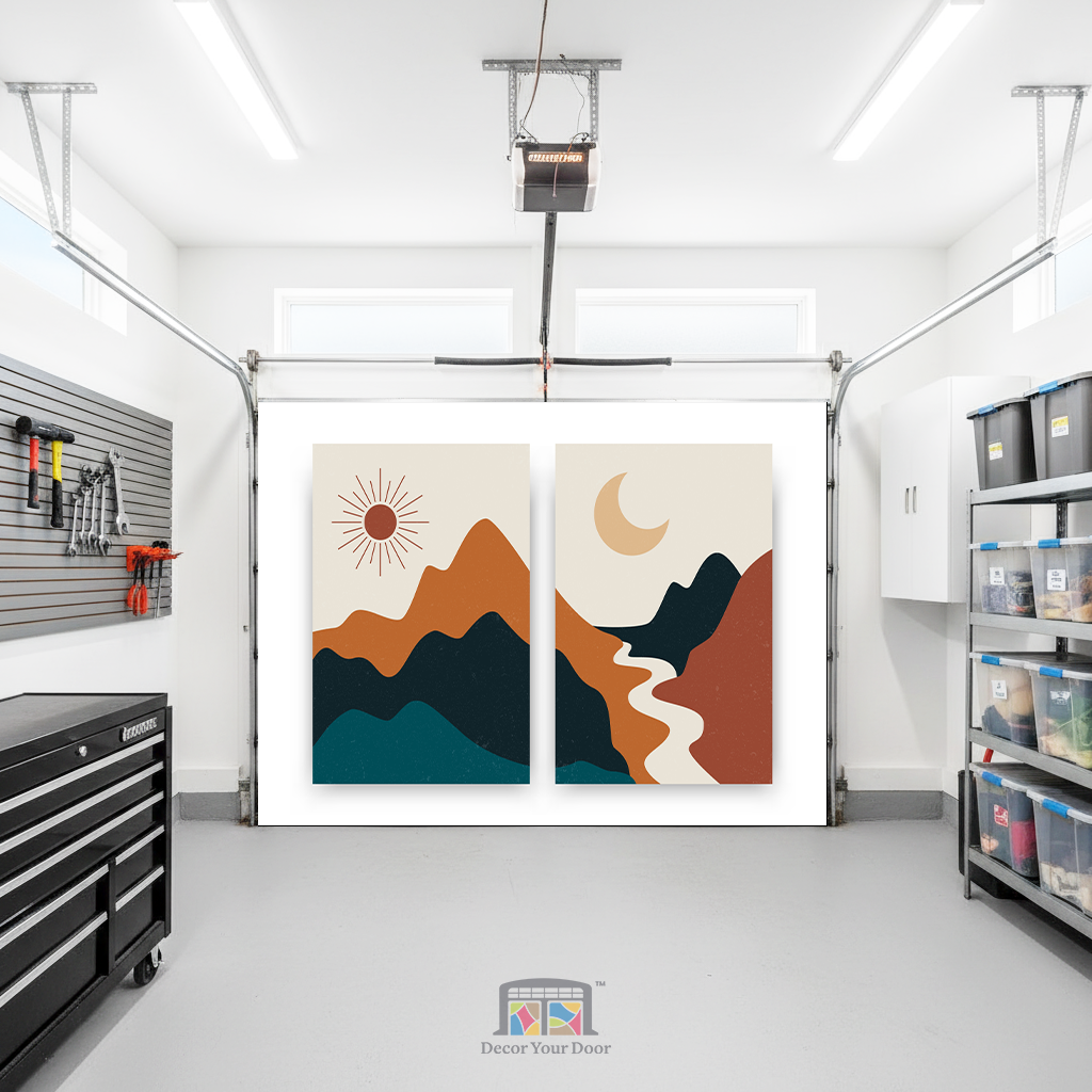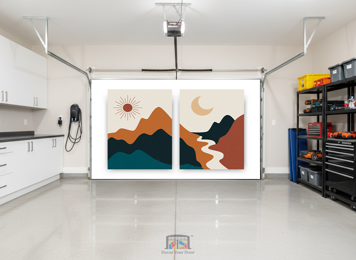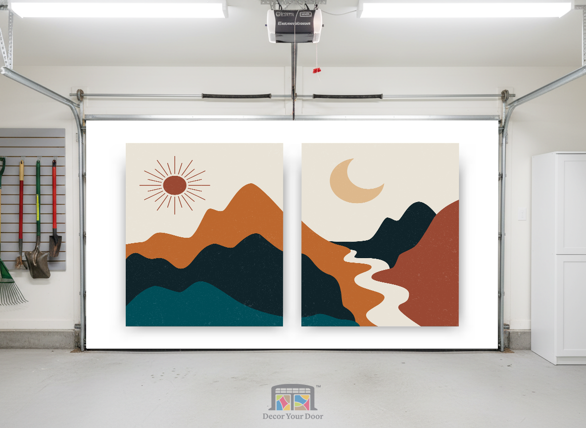 Bring calm, balance, and earthy warmth into your space with the Desert Sun & Moon Harmony – Interior Garage Door Cover. This boho-inspired design features layered desert mountains in rich terracotta, deep teal, and warm sand tones, paired with a radiant sun on one side and a gentle crescent moon on the other. The flowing path through the landscape creates a sense of journey, peace, and natural rhythm. Perfect for boho, modern, or earthy interiors, this cover transforms your garage into a serene, artful retreat. Designed to elevate your home with subtle elegance, exclusively by Decor Your Door.