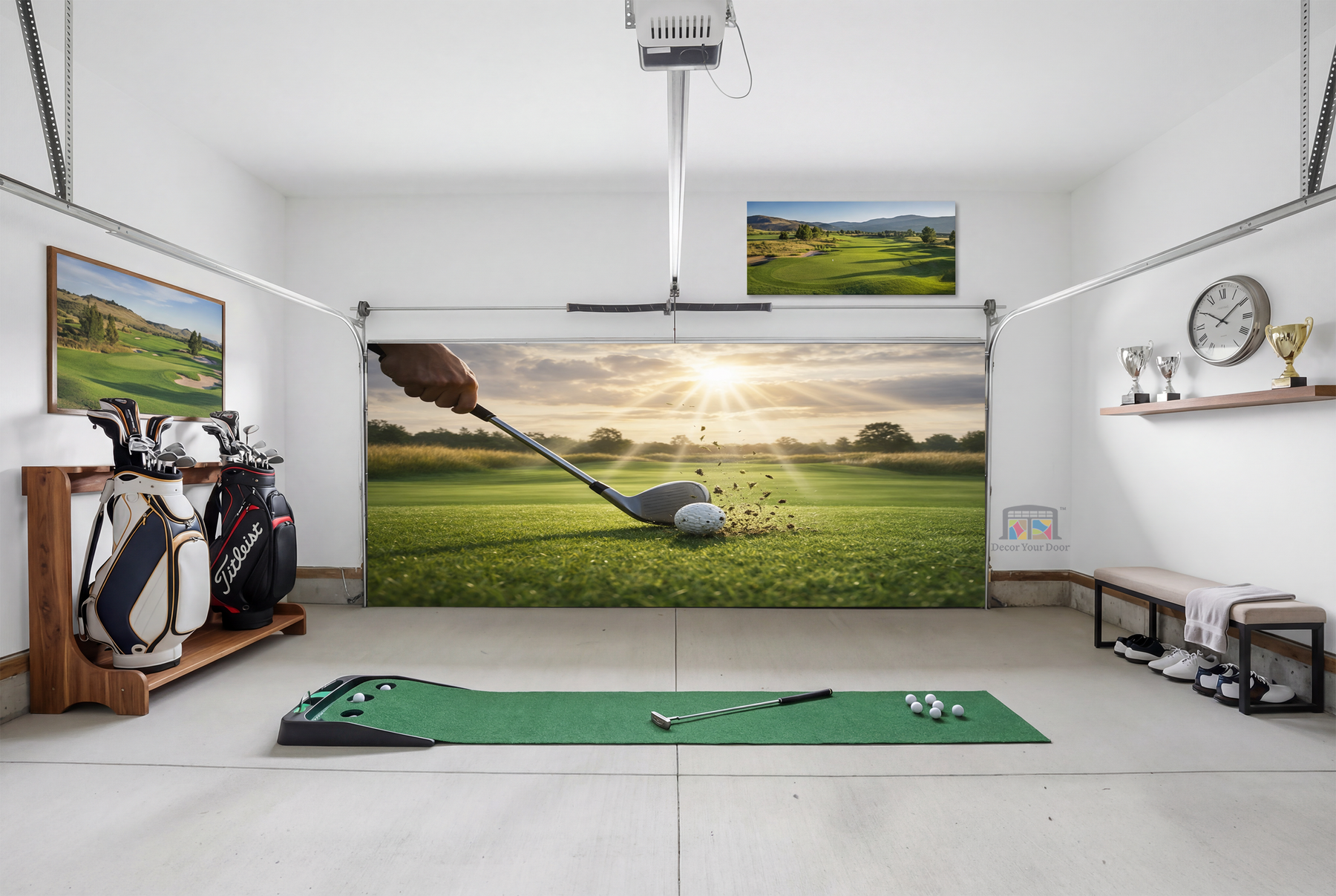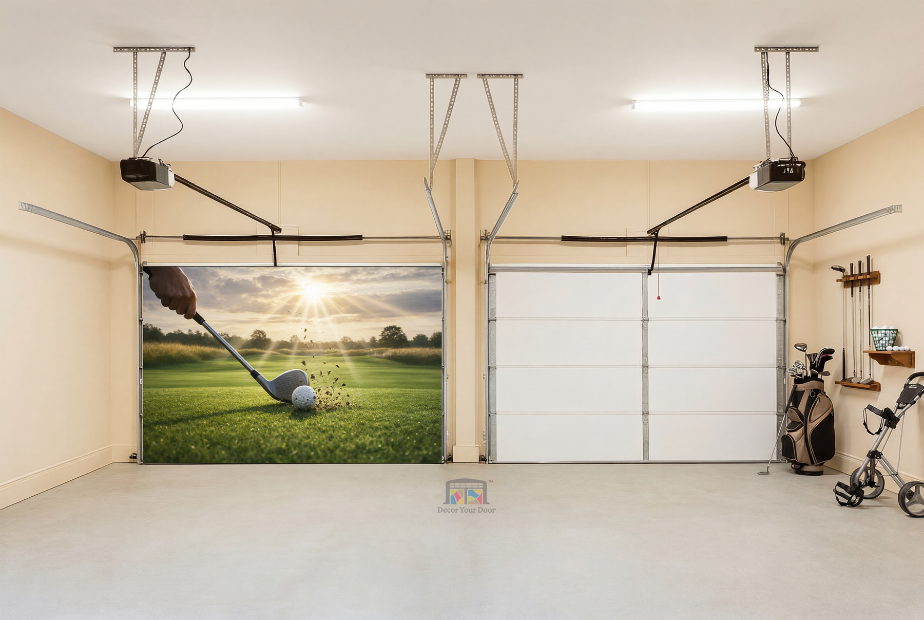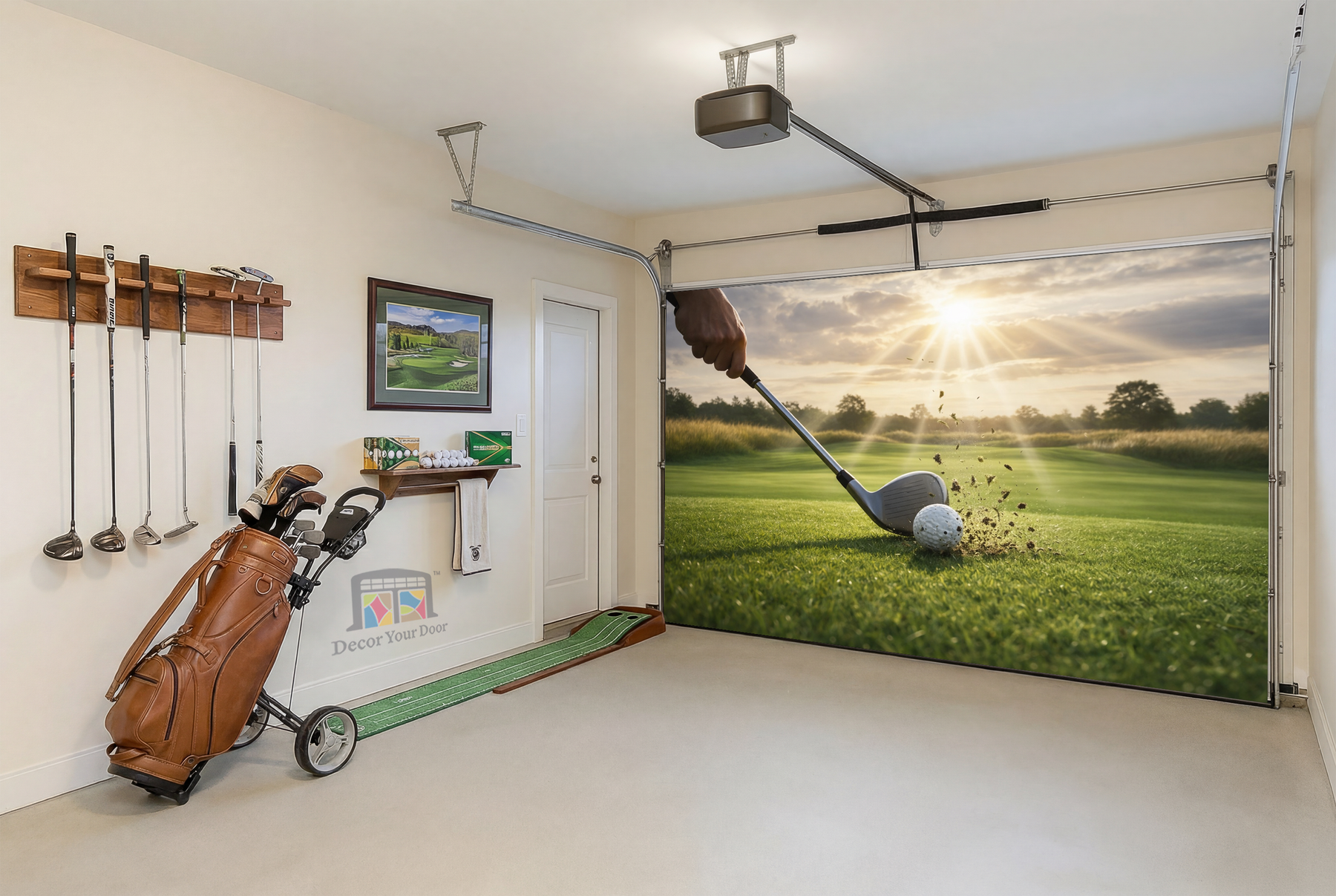 This inspiring golf scene captures the exact moment of impact, as the club strikes the ball under warm sunlight on a perfectly kept fairway. The flying turf and glowing sky symbolize focus, patience, and fresh opportunity, turning your garage into a space that motivates you every time you step inside. Clean, powerful, and full of motion, this design brings the mindset of the game into your daily routine and instantly elevates the atmosphere of your garage. Designed to transform your space with purpose and calm confidence, by Decor Your Door.