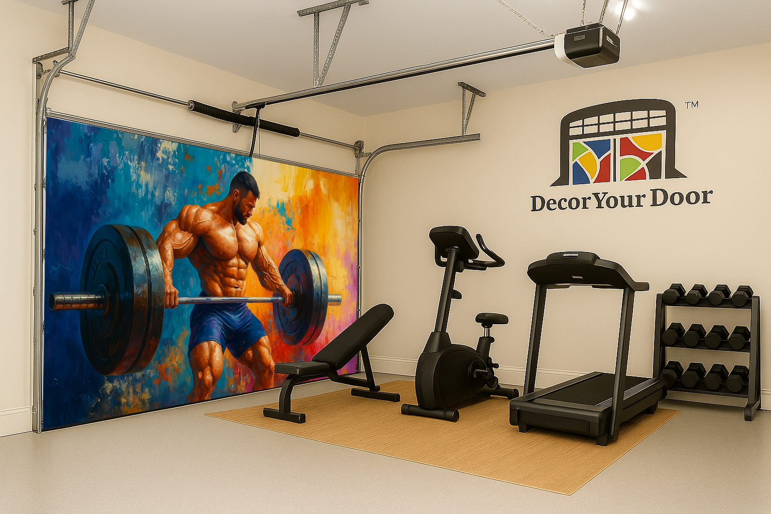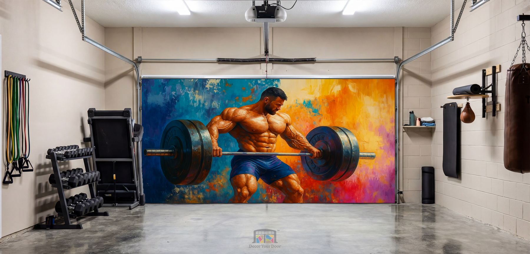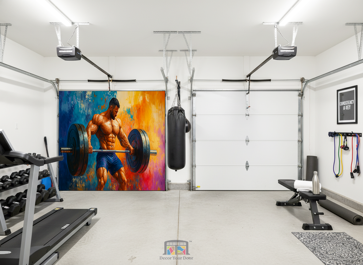 Turn your workout space into a zone of pure intensity with Beast Mode Deadlift by Decor Your Door. This electrifying artwork captures a powerful athlete in a heavy deadlift, every muscle defined with raw strength and focus. The vibrant background blends deep blues, fiery oranges, and energetic brushstrokes to create a dramatic, motivating atmosphere. Printed in ultra-high resolution on durable, weatherproof material, this cover transforms any garage into a high-performance training arena that pushes you to lift harder, train stronger, and stay unstoppable.