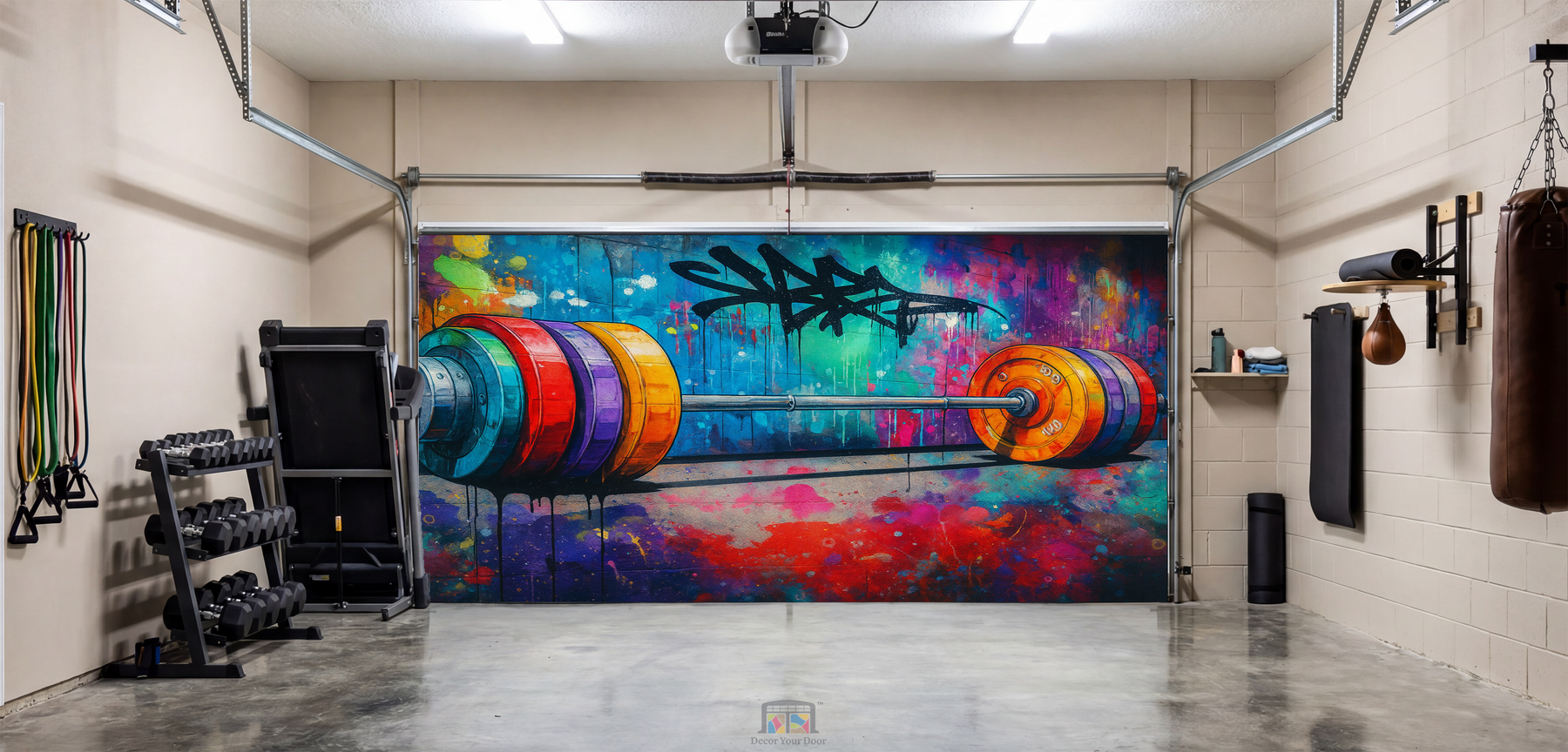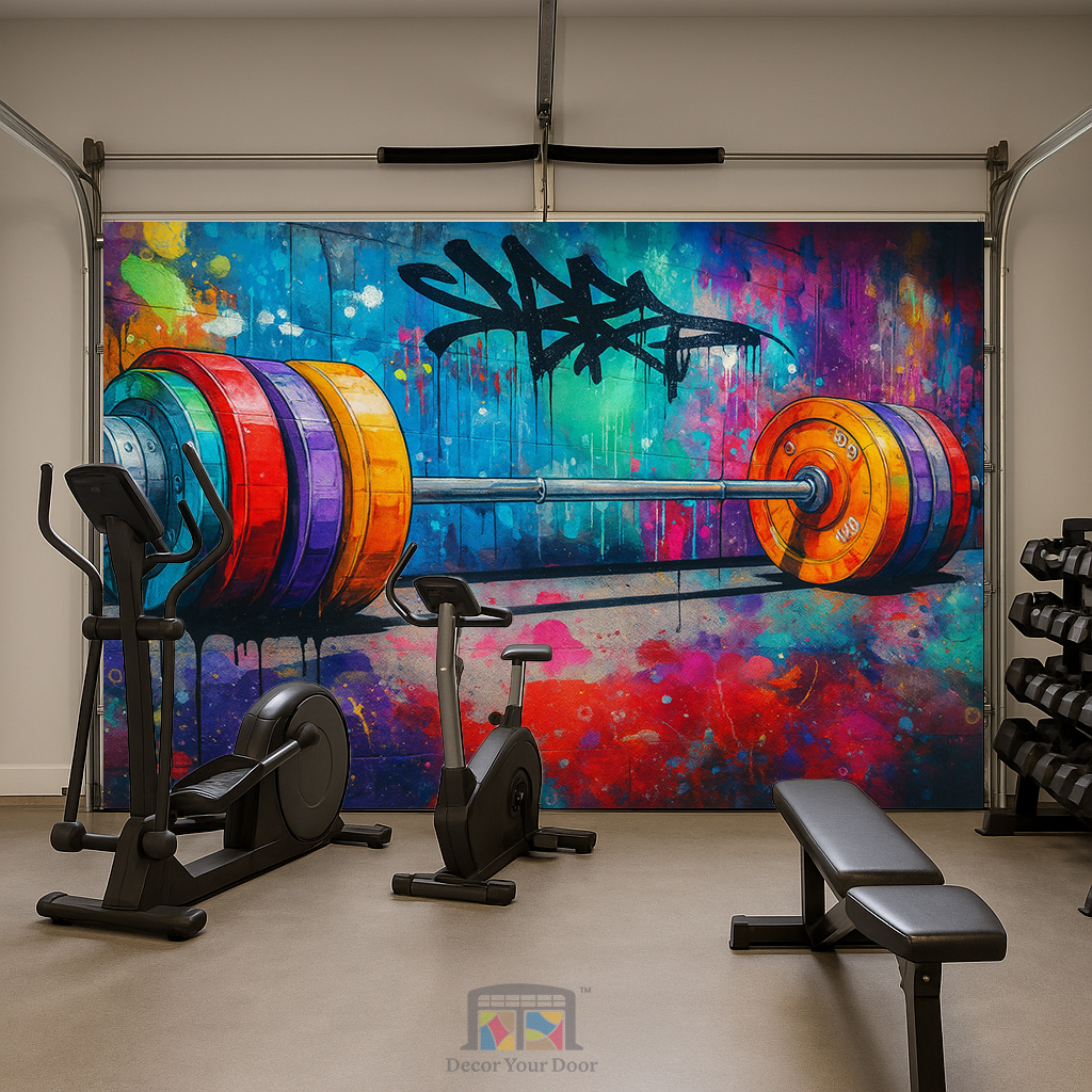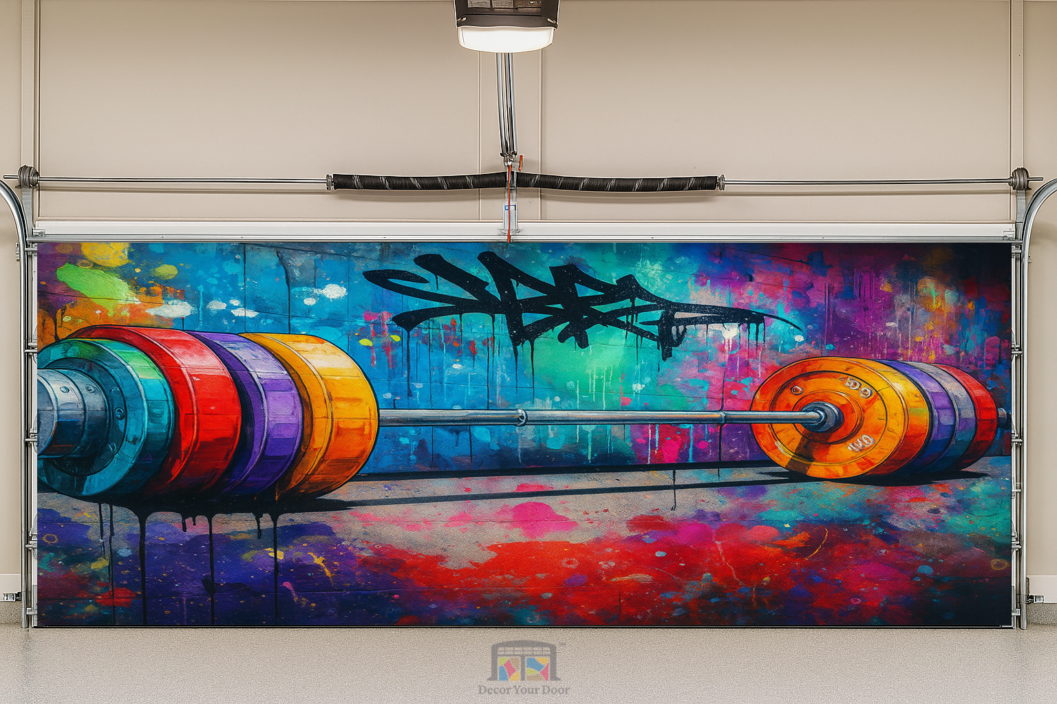 A bold graffiti-inspired fitness mural featuring a heavy barbell packed with vibrant multicolored plates, set against an explosive street-art background. Dripping paint, neon splashes, and dynamic textures bring raw gym energy to life. Designed in a wide landscape format, this high-impact artwork delivers strength, motivation, and visual intensity, making it a perfect statement piece for any gym space or interior garage door cover.