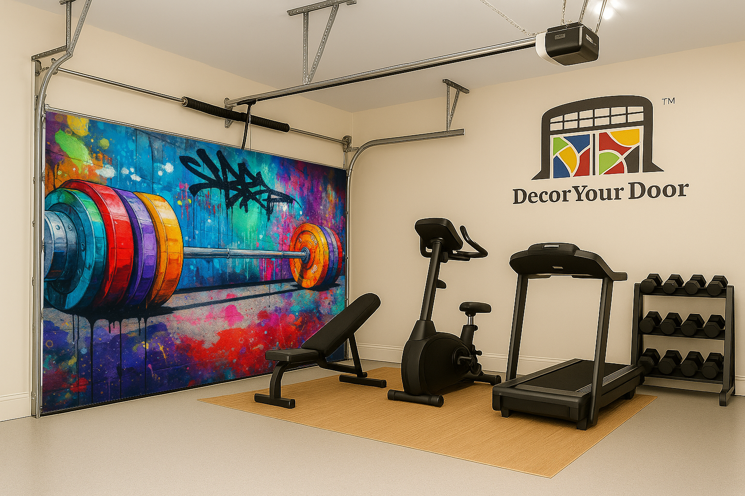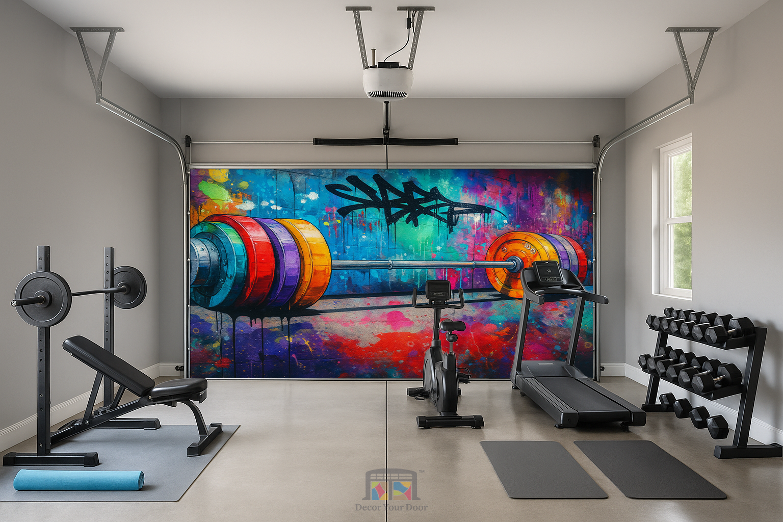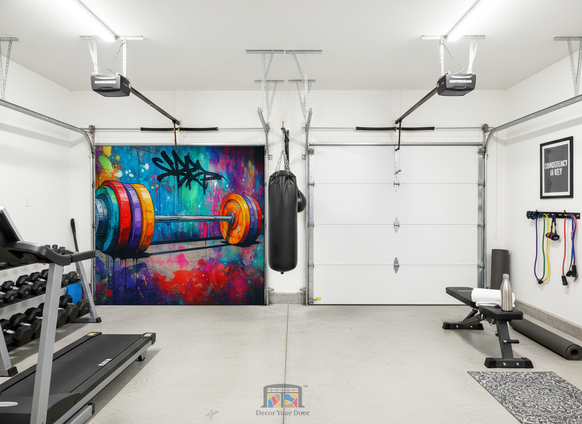 A bold graffiti-inspired fitness mural featuring a heavy barbell packed with vibrant multicolored plates, set against an explosive street-art background. Dripping paint, neon splashes, and dynamic textures bring raw gym energy to life. Designed in a wide landscape format, this high-impact artwork delivers strength, motivation, and visual intensity, making it a perfect statement piece for any gym space or interior garage door cover.