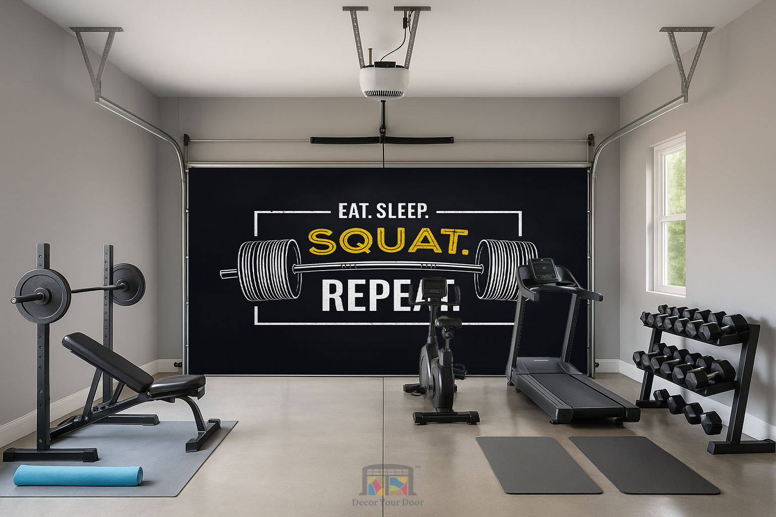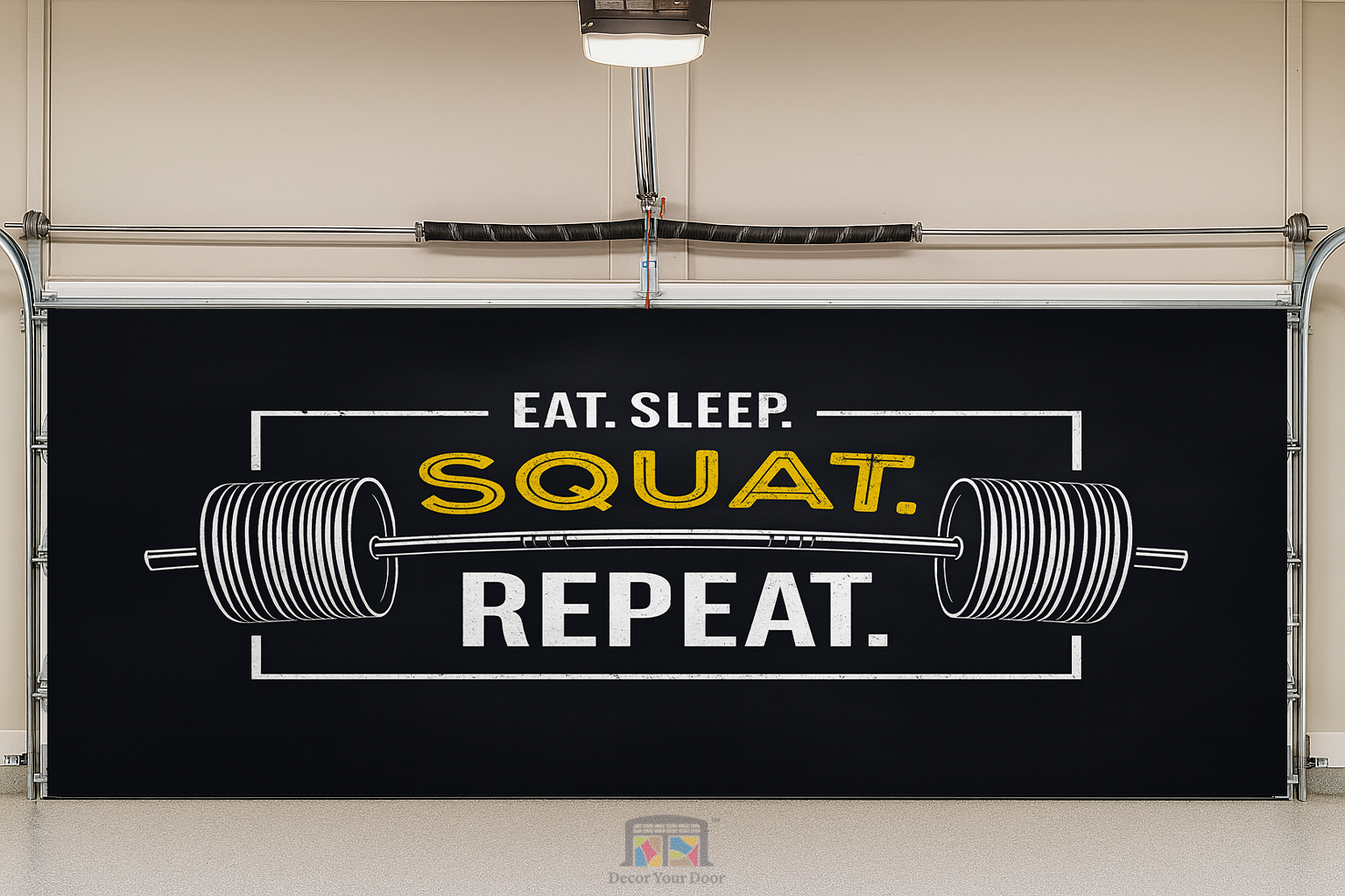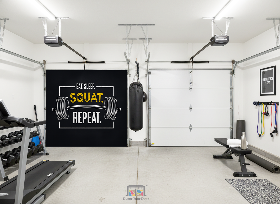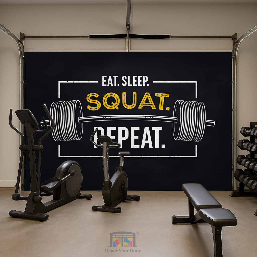 Push your limits every time you walk into the garage with this bold and gritty motivation design by Decor Your Door. The oversized barbell illustration and strong distressed typography bring real gym energy straight into your workout space. Printed in ultra high resolution for a clean and powerful look, this interior garage door cover is the perfect reminder to stay disciplined and keep the grind going. Eat. Sleep. Squat. Repeat. Your results start here.