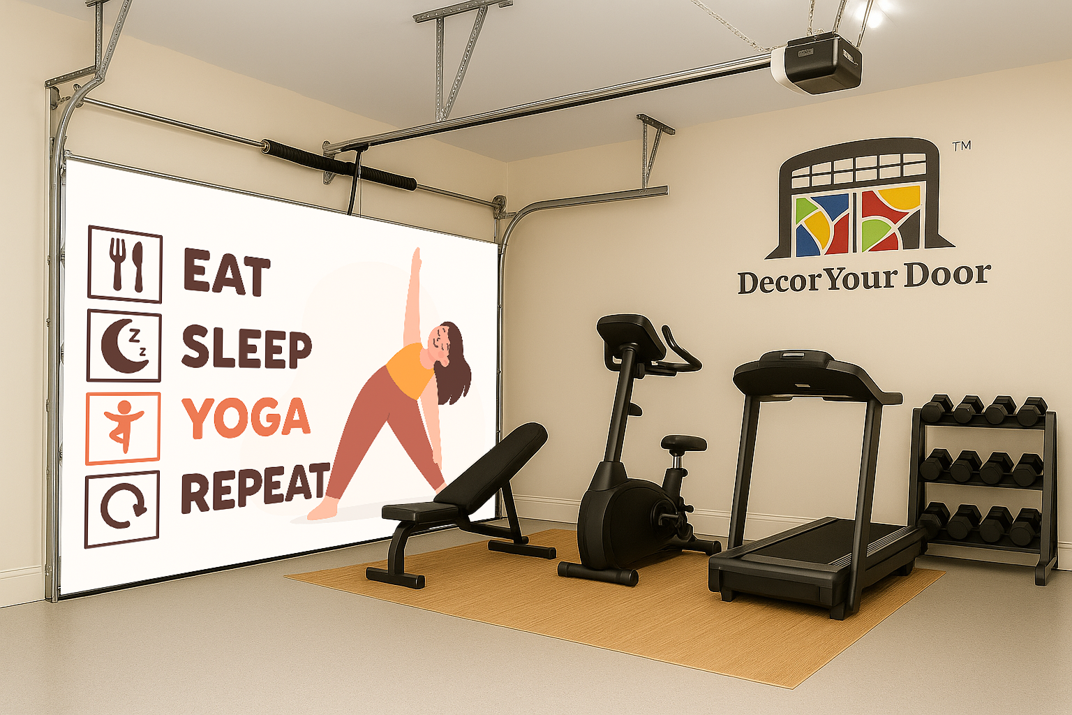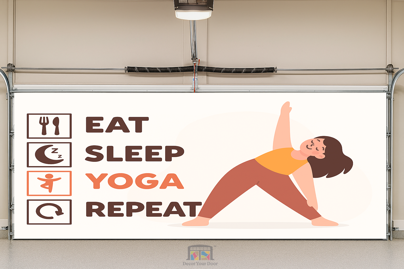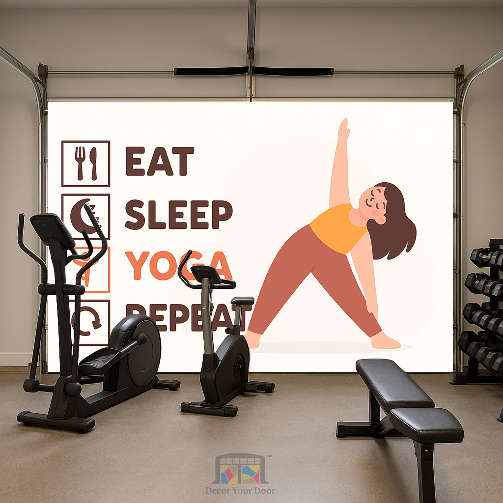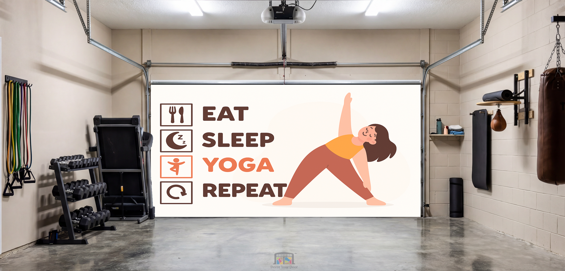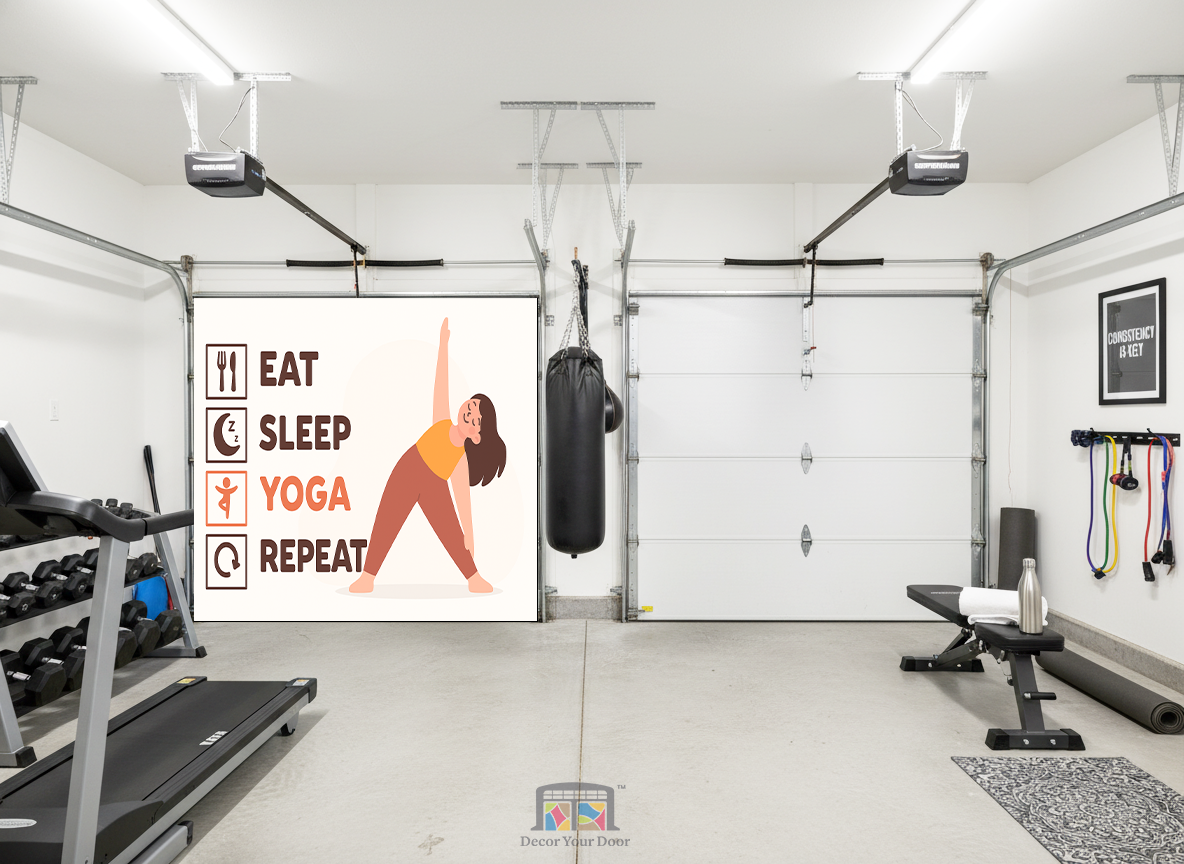 Create a calming and inspiring atmosphere with this beautifully designed interior garage door cover from Decor Your Door. Featuring clean minimalist icons and a graceful yoga pose, this design celebrates routine, mindfulness, and inner balance. The soft color palette and modern layout make it a perfect addition to any home gym, yoga studio, or relaxation space. Transform your garage into a peaceful wellness sanctuary that motivates you every day.