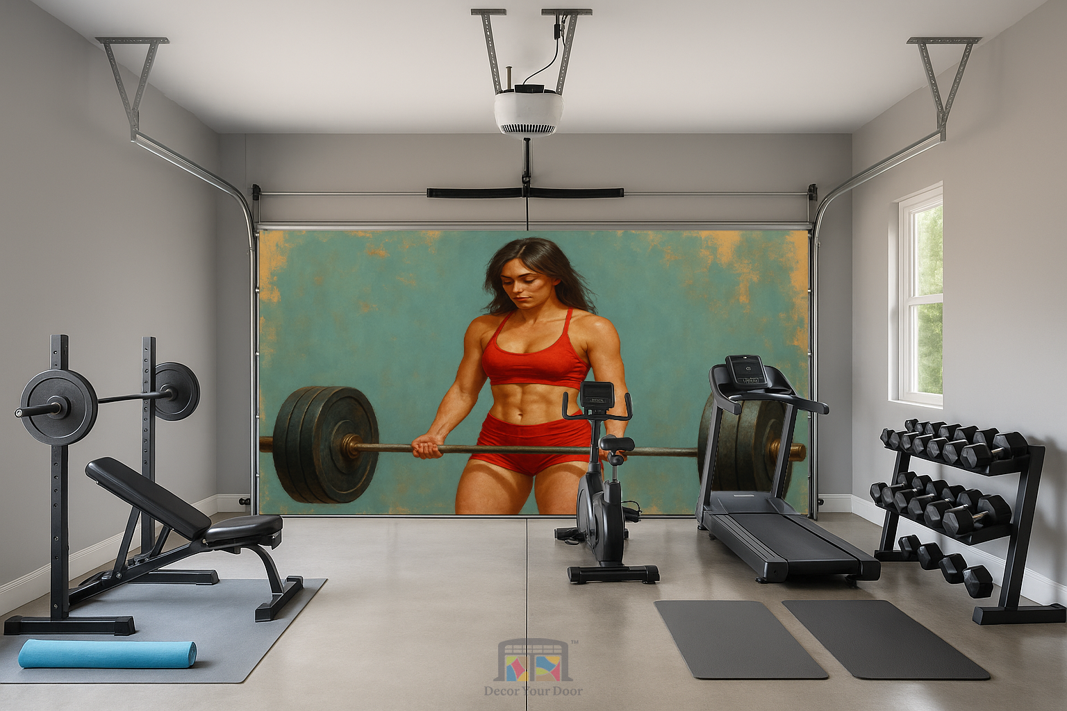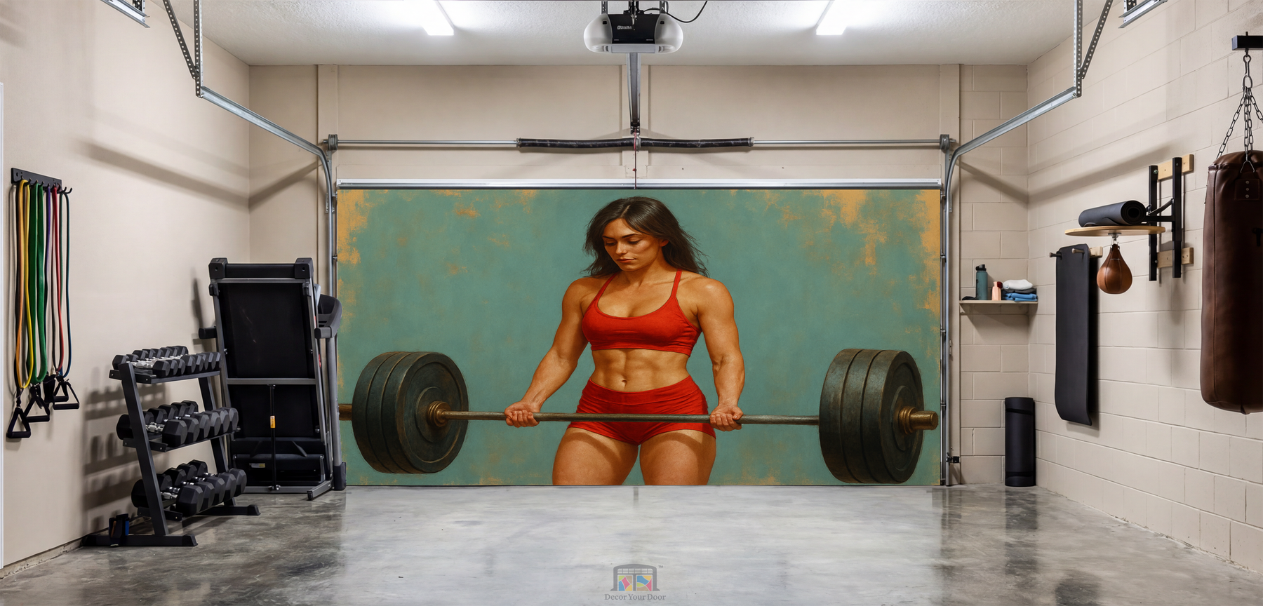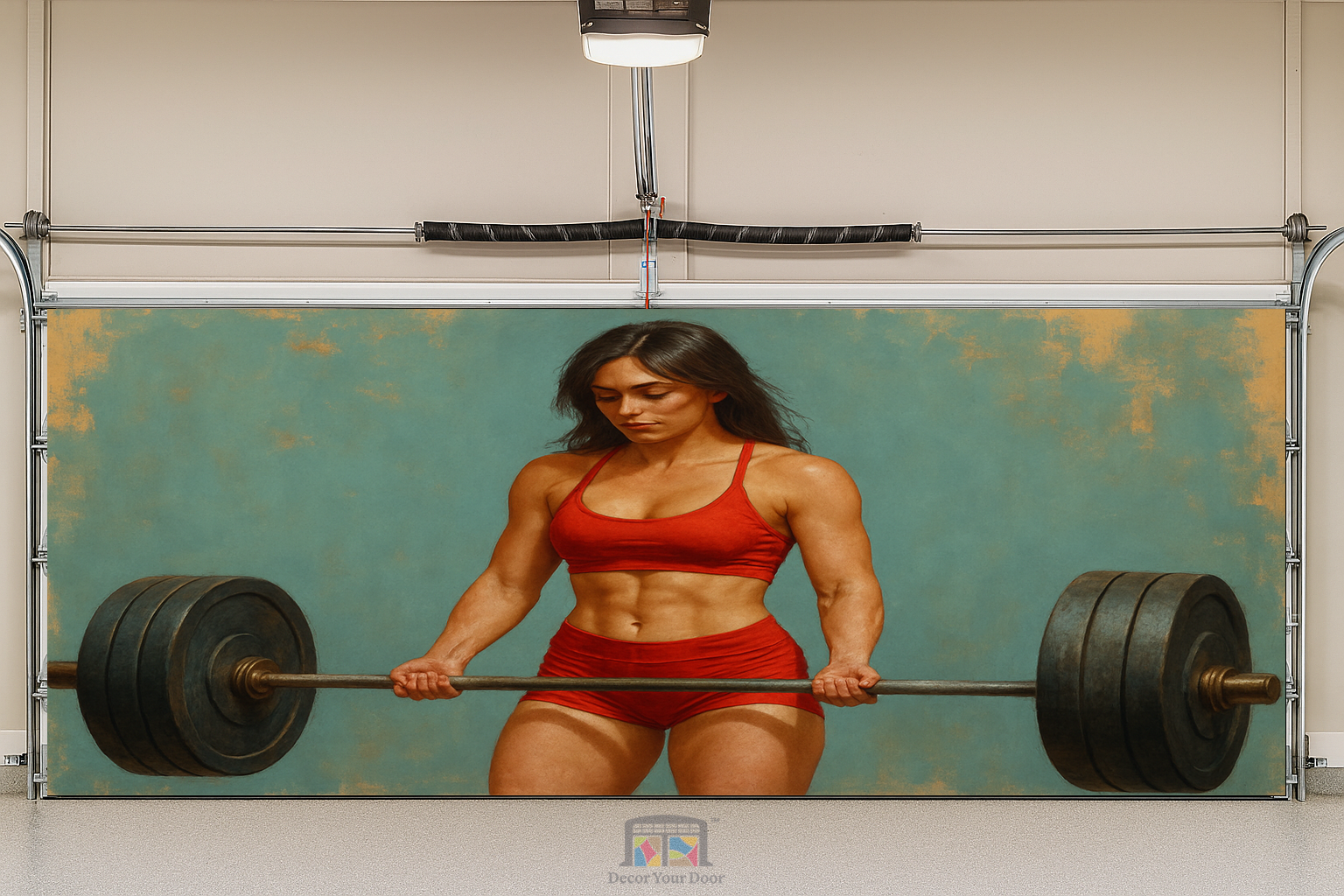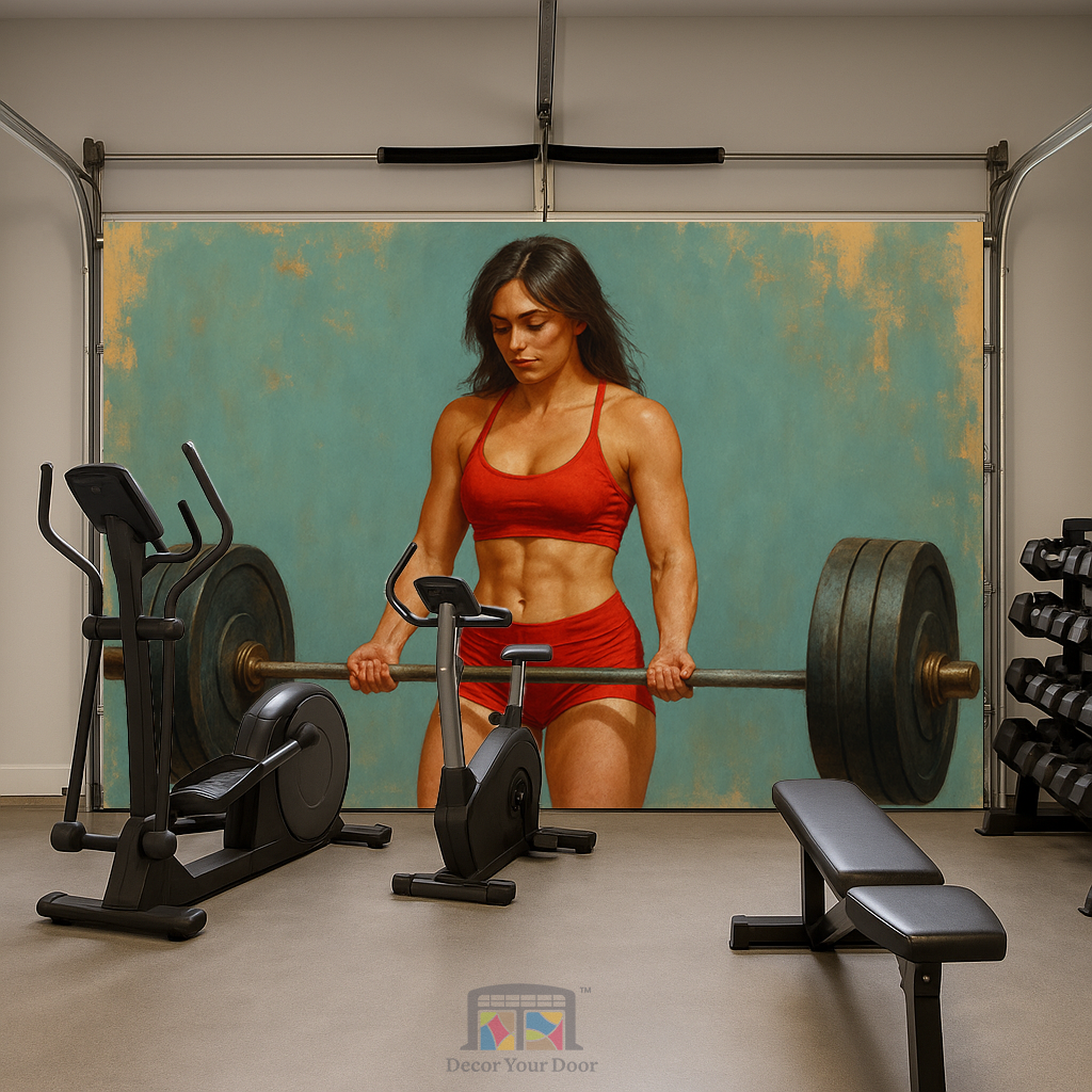 Bring unstoppable energy into your workout space with this powerful and artistic design by Decor Your Door. Featuring a strong yet naturally feminine athlete lifting a full barbell, this oil painting style artwork blends determination, elegance, and grit. The balanced landscape layout showcases the entire barbell for a complete and impactful visual. Printed in ultra high resolution, this interior garage door cover transforms your garage into a motivating fitness environment and inspires you to stay focused, stay strong, and push forward every time you step inside.