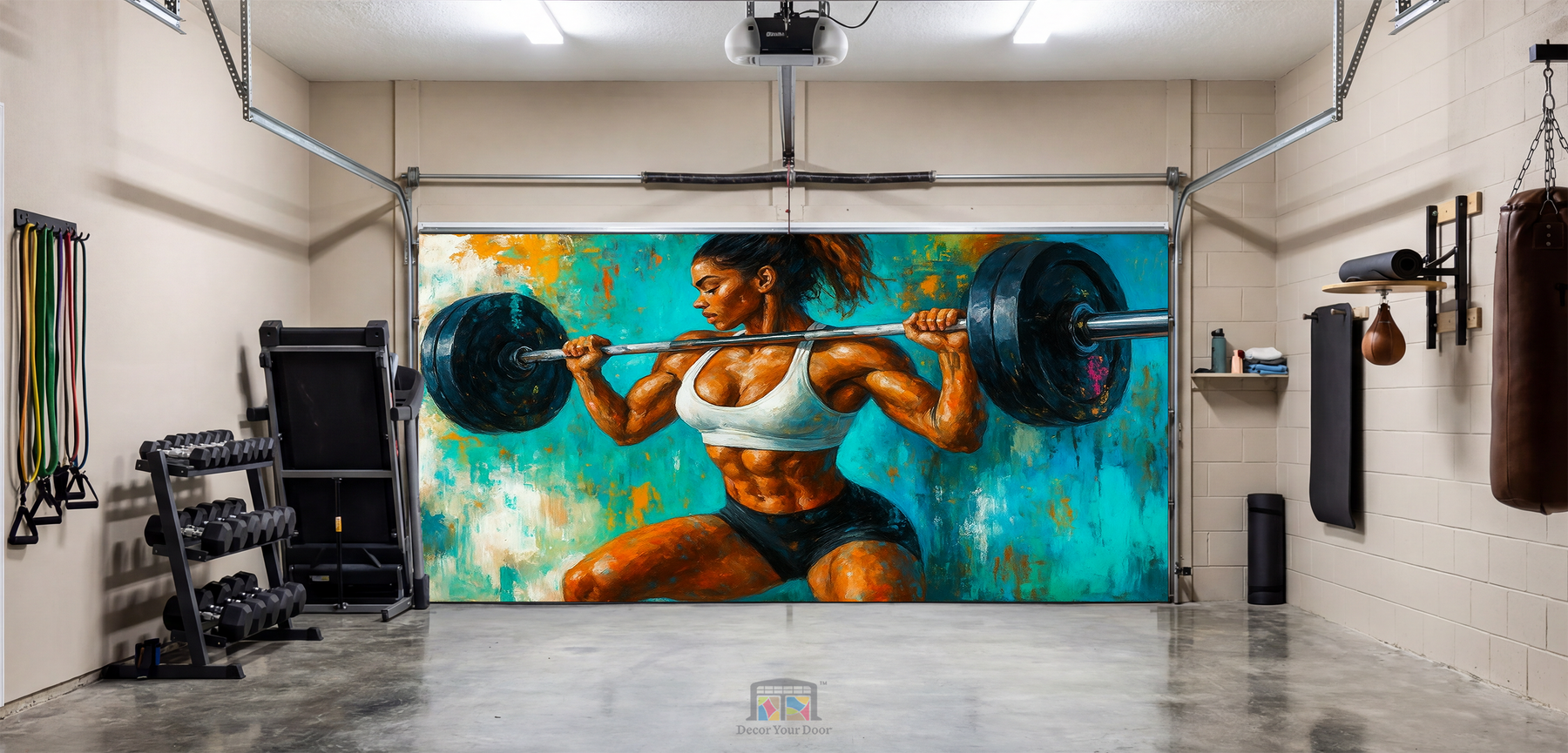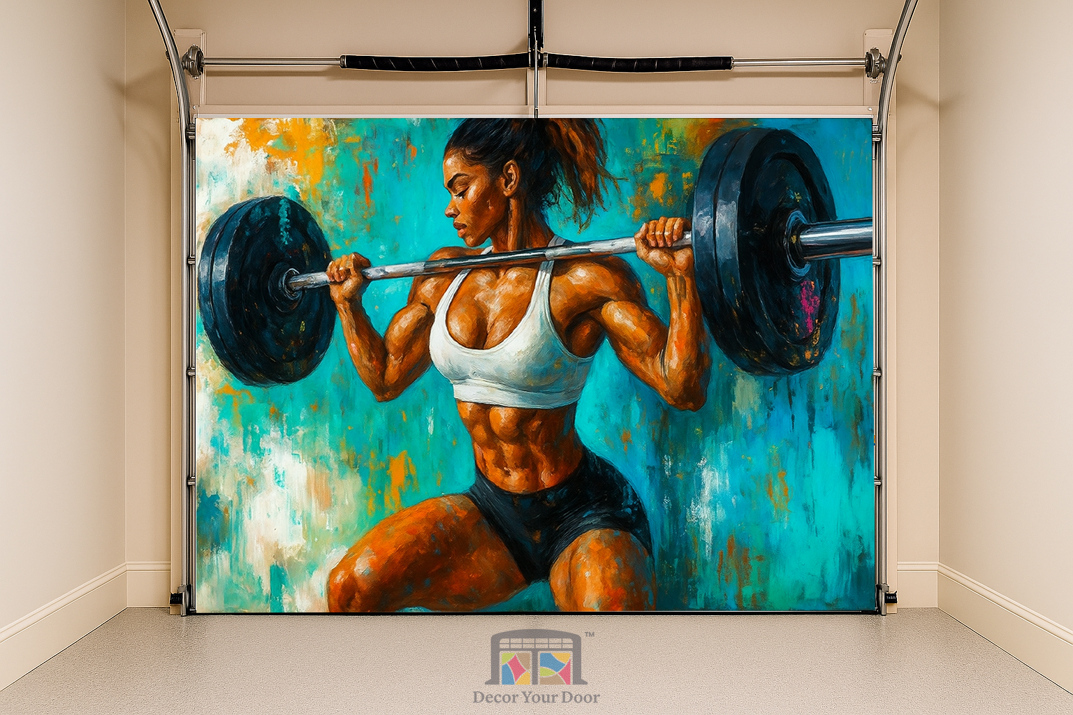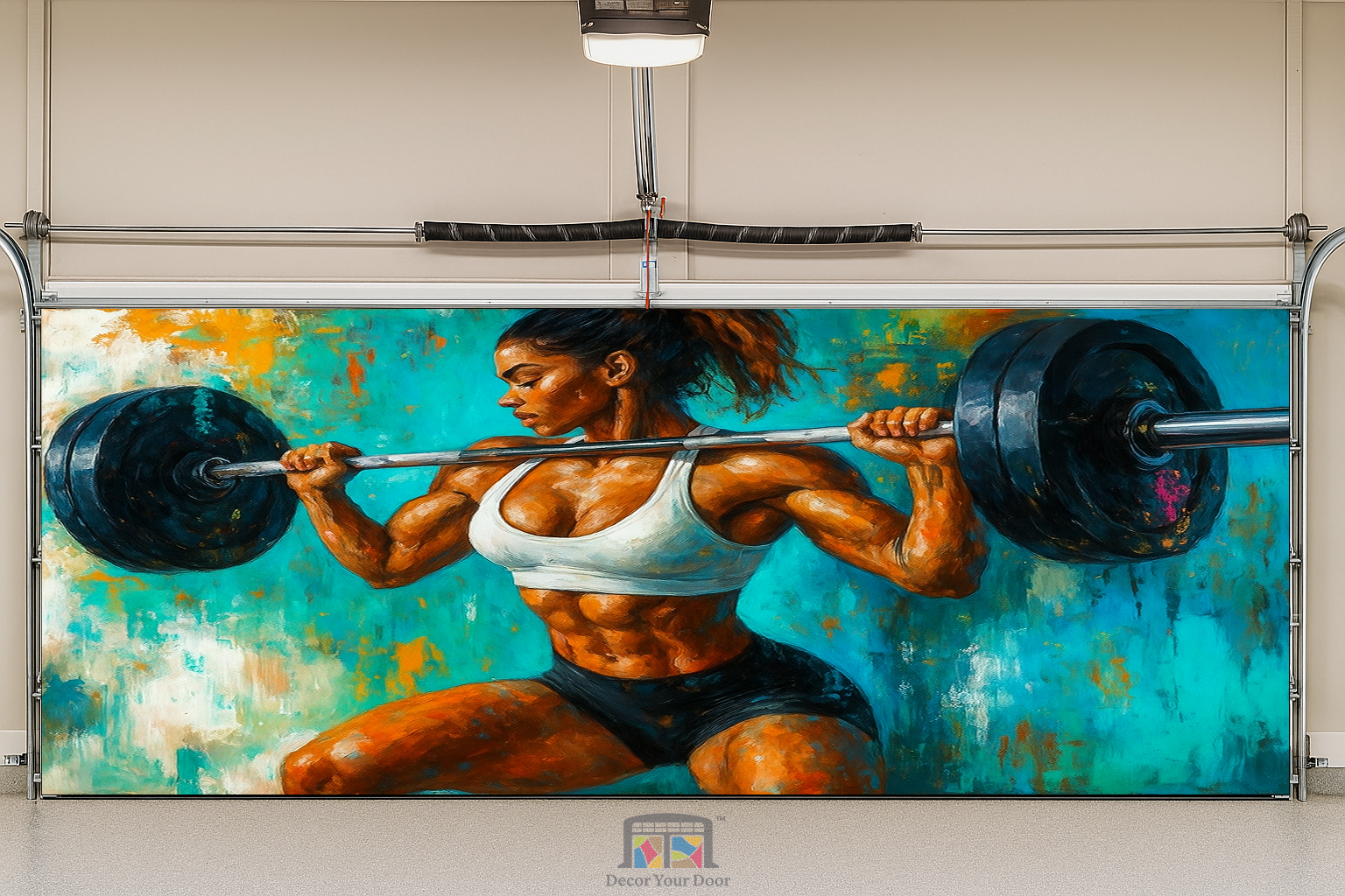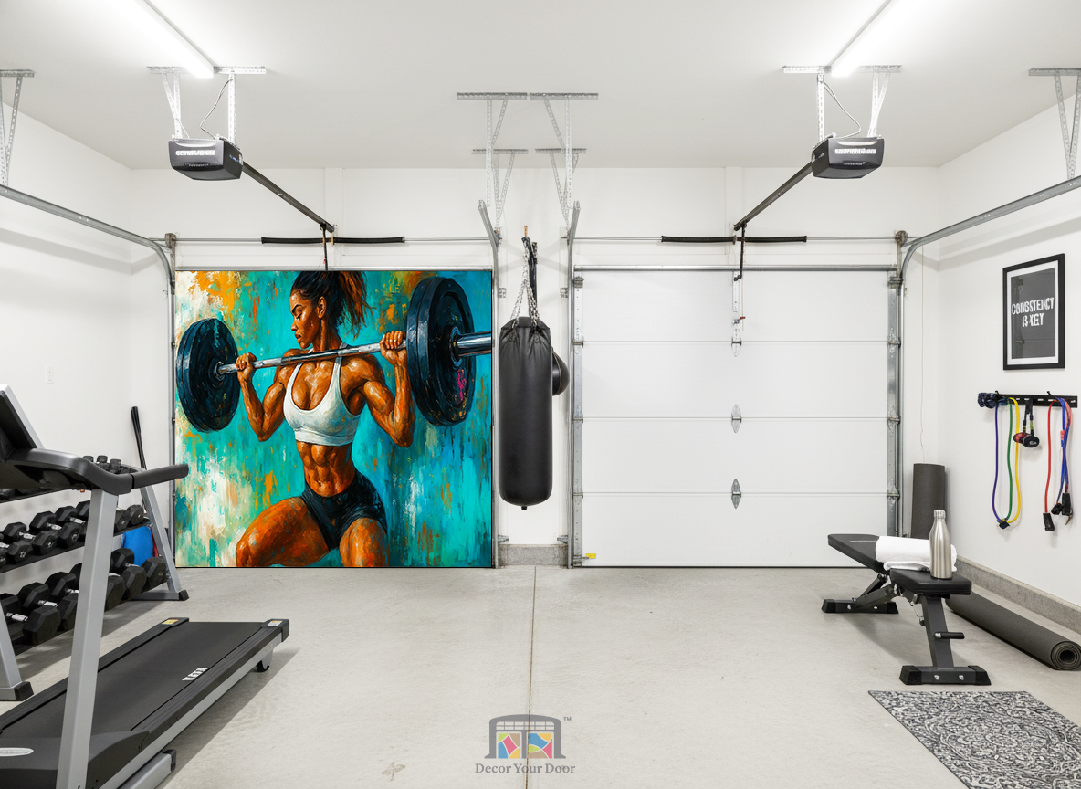 Unleash unstoppable energy in your home gym with Iron Strength by Decor Your Door. This powerful artwork captures a fierce female athlete in mid squat, holding a loaded barbell with perfect form and unshakable focus. The expressive brushstroke style, bold colors, and textured background create an intense, motivational atmosphere that fuels every workout. Printed in ultra high resolution on premium, durable material, this cover transforms any garage into a high performance training space. Perfect for athletes who live for discipline, sweat, and strength.