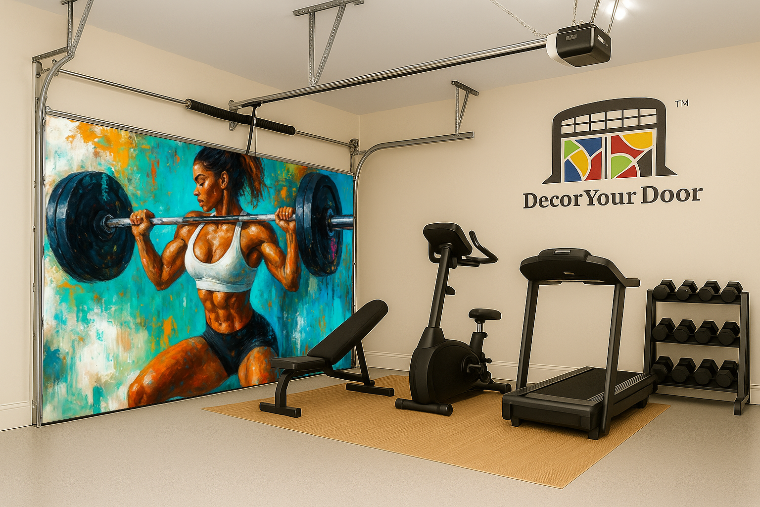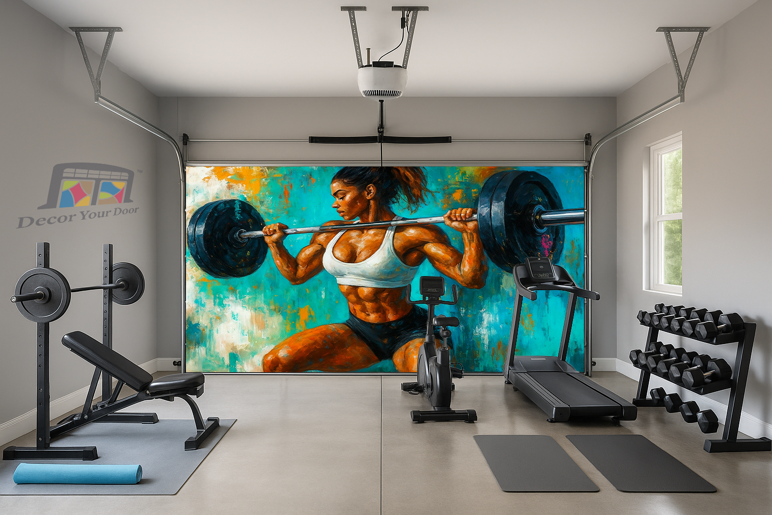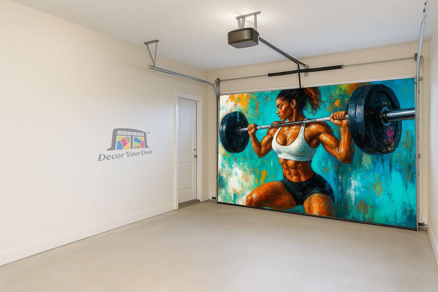 Unleash unstoppable energy in your home gym with Iron Strength by Decor Your Door. This powerful artwork captures a fierce female athlete in mid squat, holding a loaded barbell with perfect form and unshakable focus. The expressive brushstroke style, bold colors, and textured background create an intense, motivational atmosphere that fuels every workout. Printed in ultra high resolution on premium, durable material, this cover transforms any garage into a high performance training space. Perfect for athletes who live for discipline, sweat, and strength.