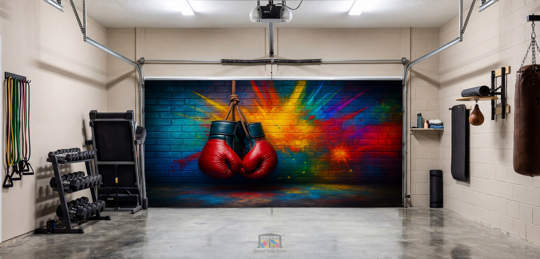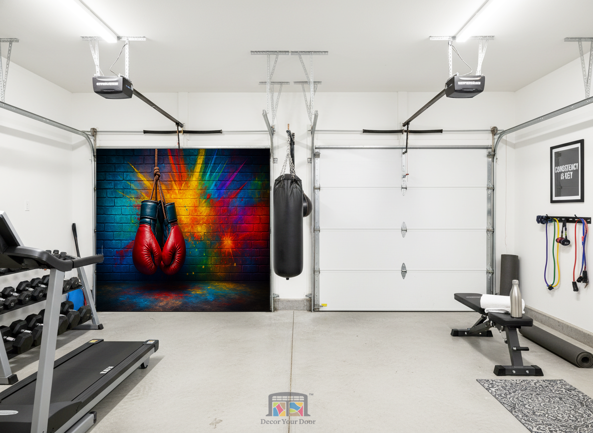 Unleash raw power in your training space with the Knockout Spirit garage door cover. Featuring vibrant boxing gloves suspended against an explosive spray-paint backdrop, this design brings intense gym energy straight to your garage. The bold colors and gritty brick texture create a high-impact visual that pushes you to strike harder, lift heavier, and show up with fight every single day.