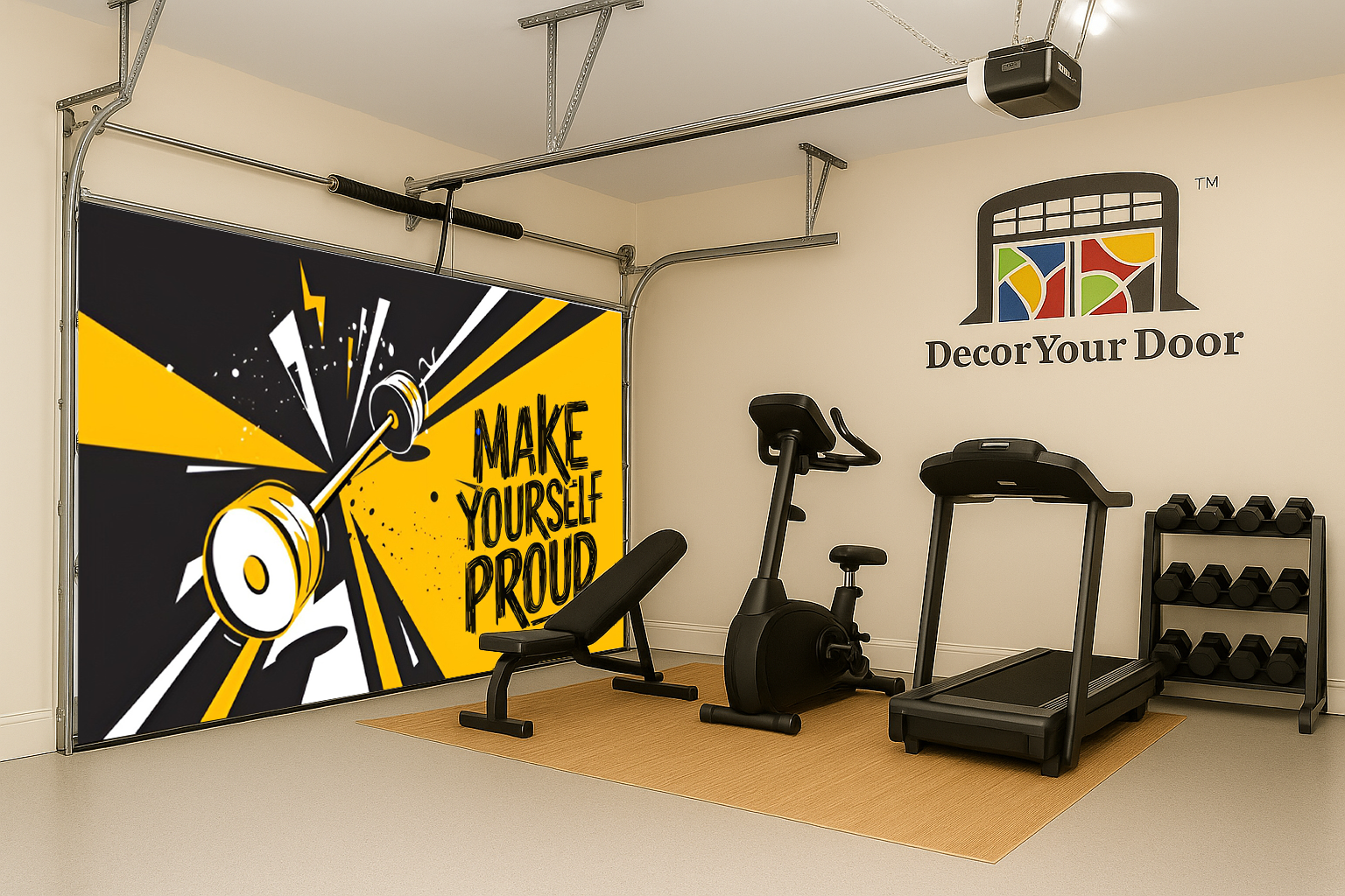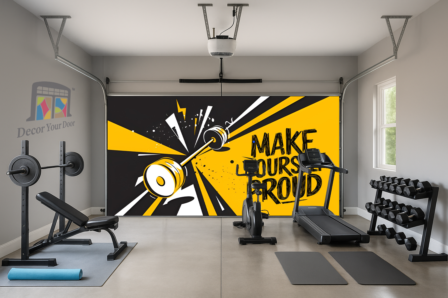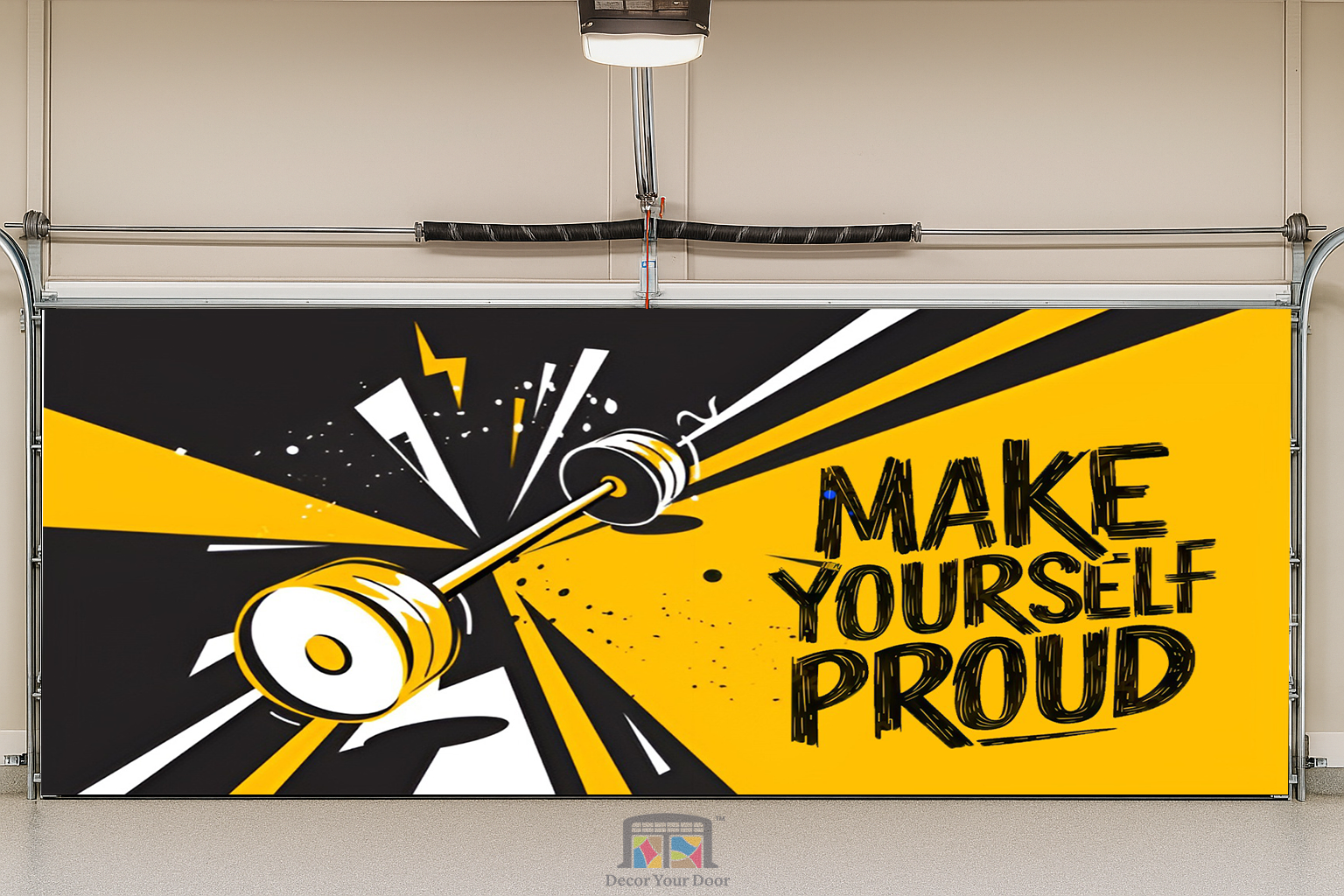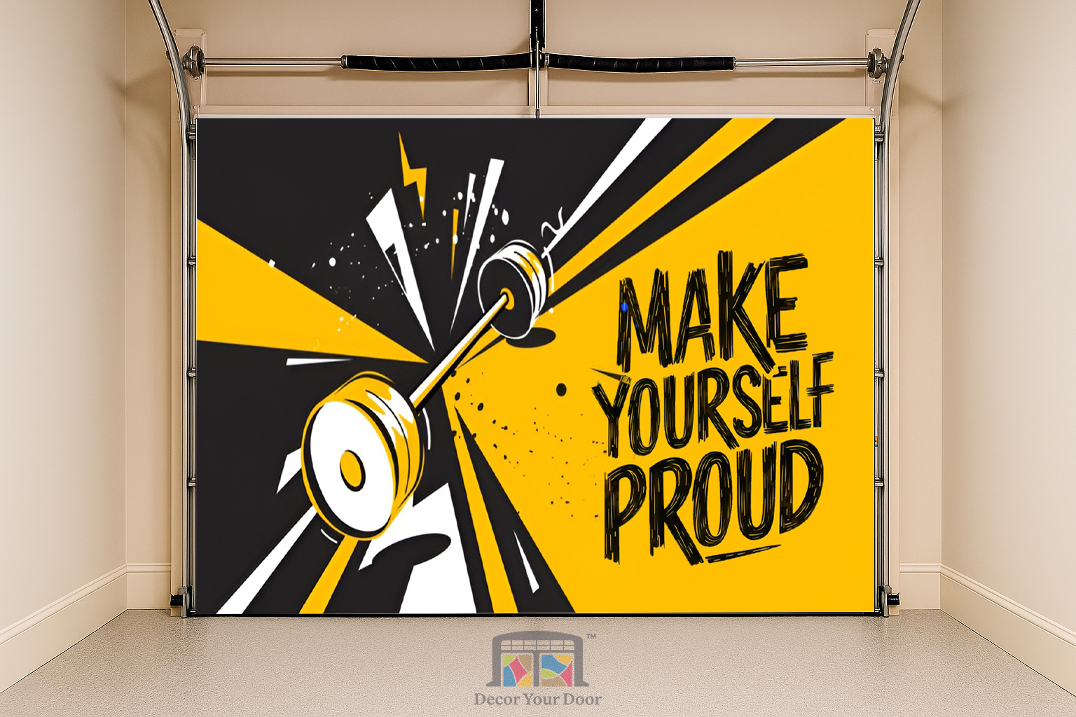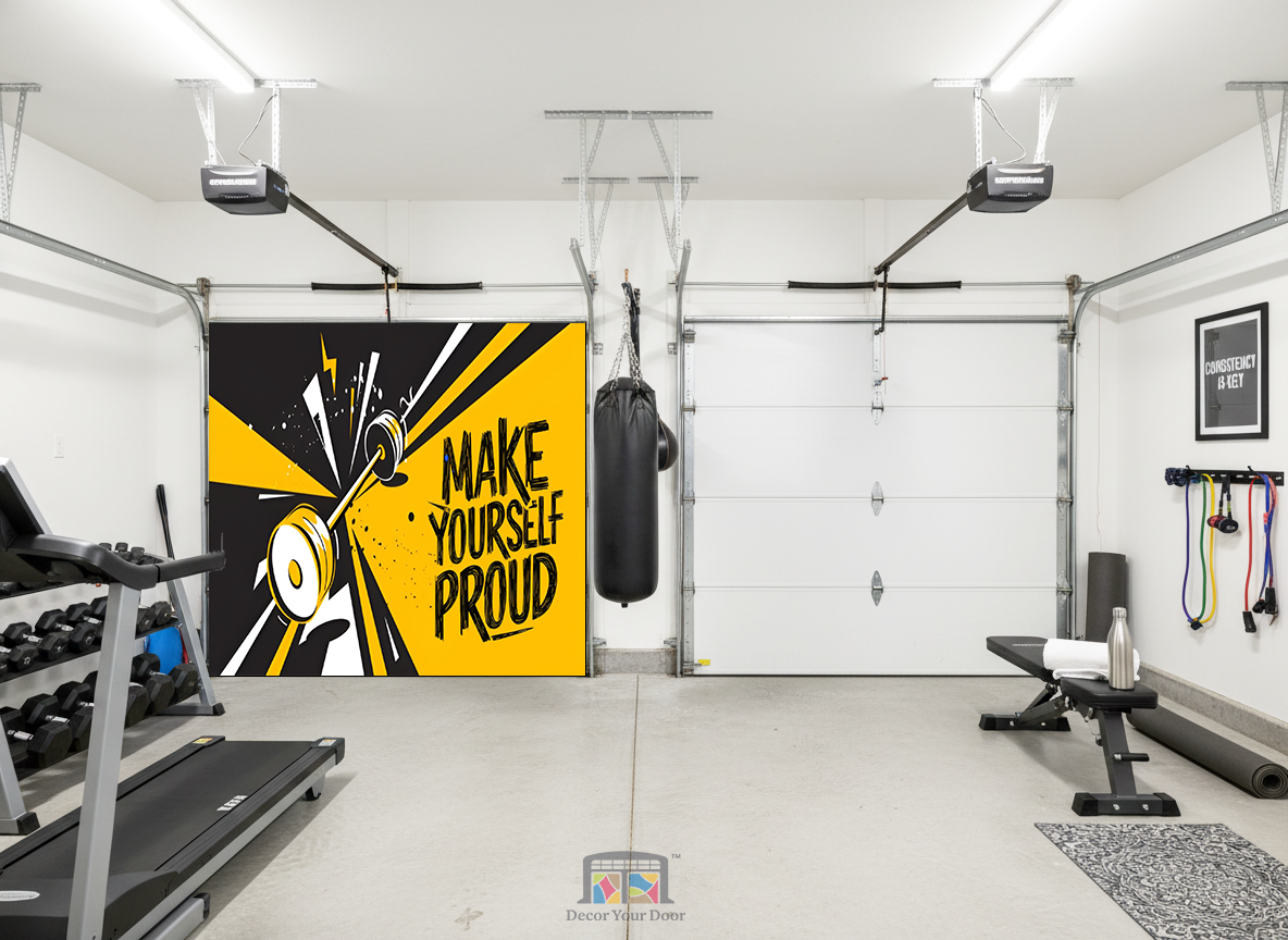 The “Make Yourself Proud” – Motivation Interior Garage Door Cover by Decor Your Door brings bold energy to your home gym with its electric yellow and black design. The dynamic motion of the barbell captures the drive to push harder every day. Crafted from durable, wrinkle-resistant fabric, it installs easily and transforms your garage into a motivational space that reminds you why you started.