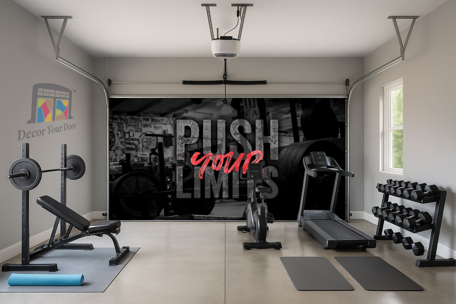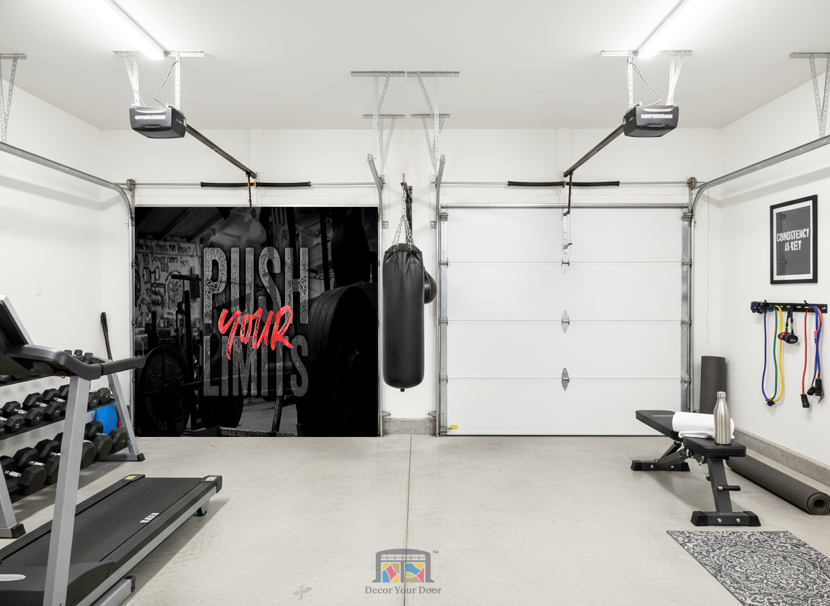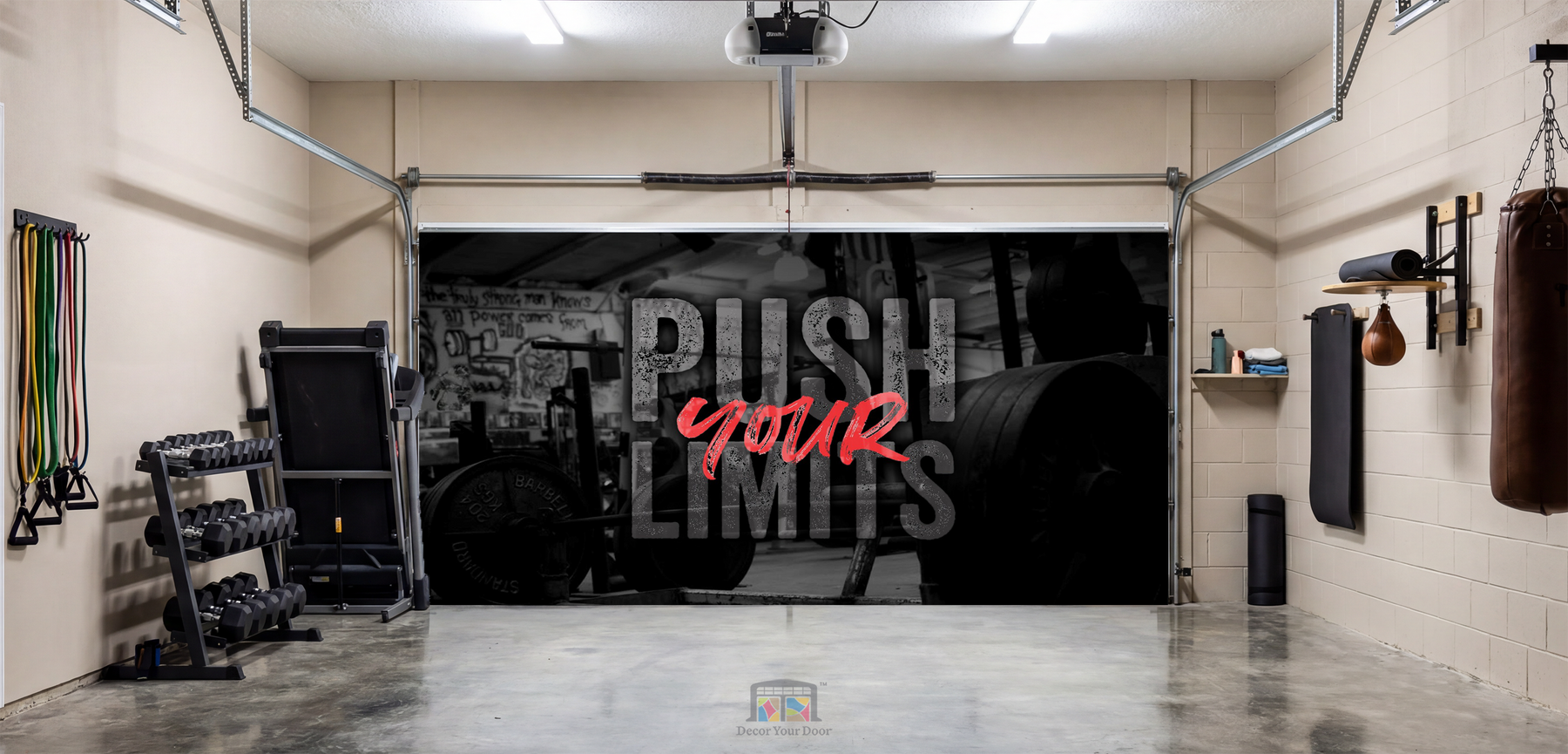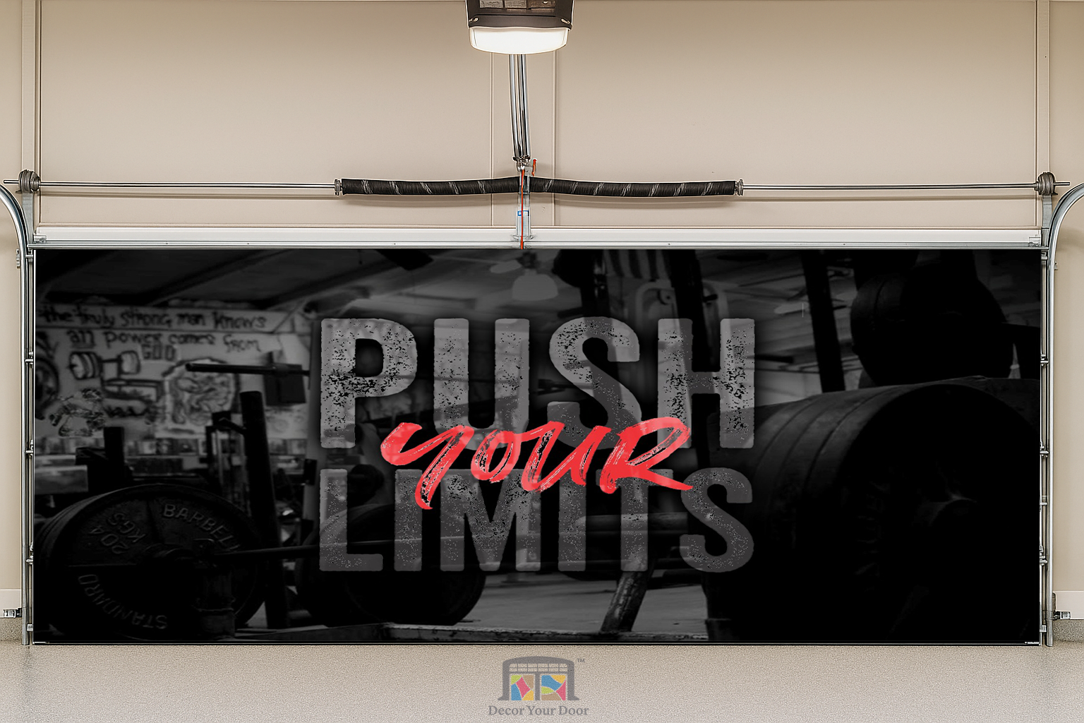 The “Push Your Limits” – Motivation Interior Garage Door Cover by Decor Your Door fuels your drive with raw intensity and bold contrast. Set against a gritty gym backdrop, the striking red typography commands focus and resilience. Crafted from premium wrinkle-resistant fabric, it installs in minutes and transforms your workout space into a reminder that progress starts where comfort ends.