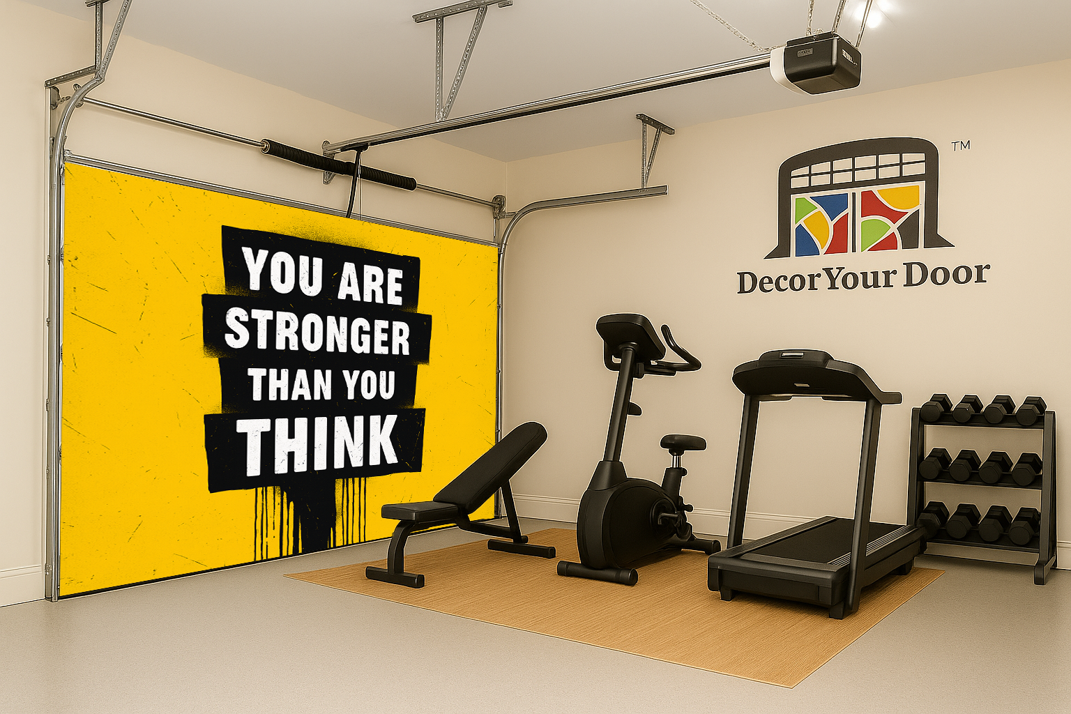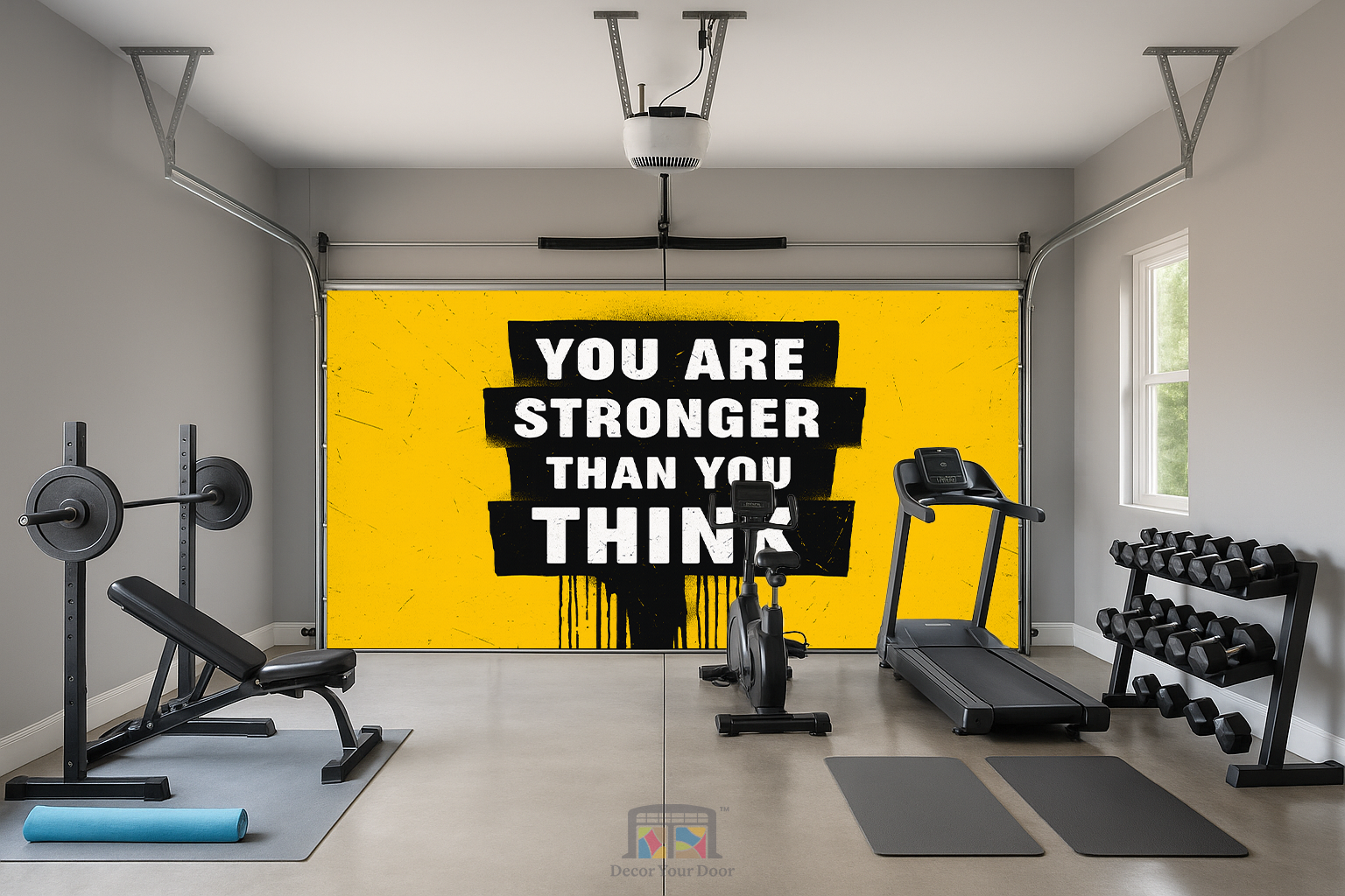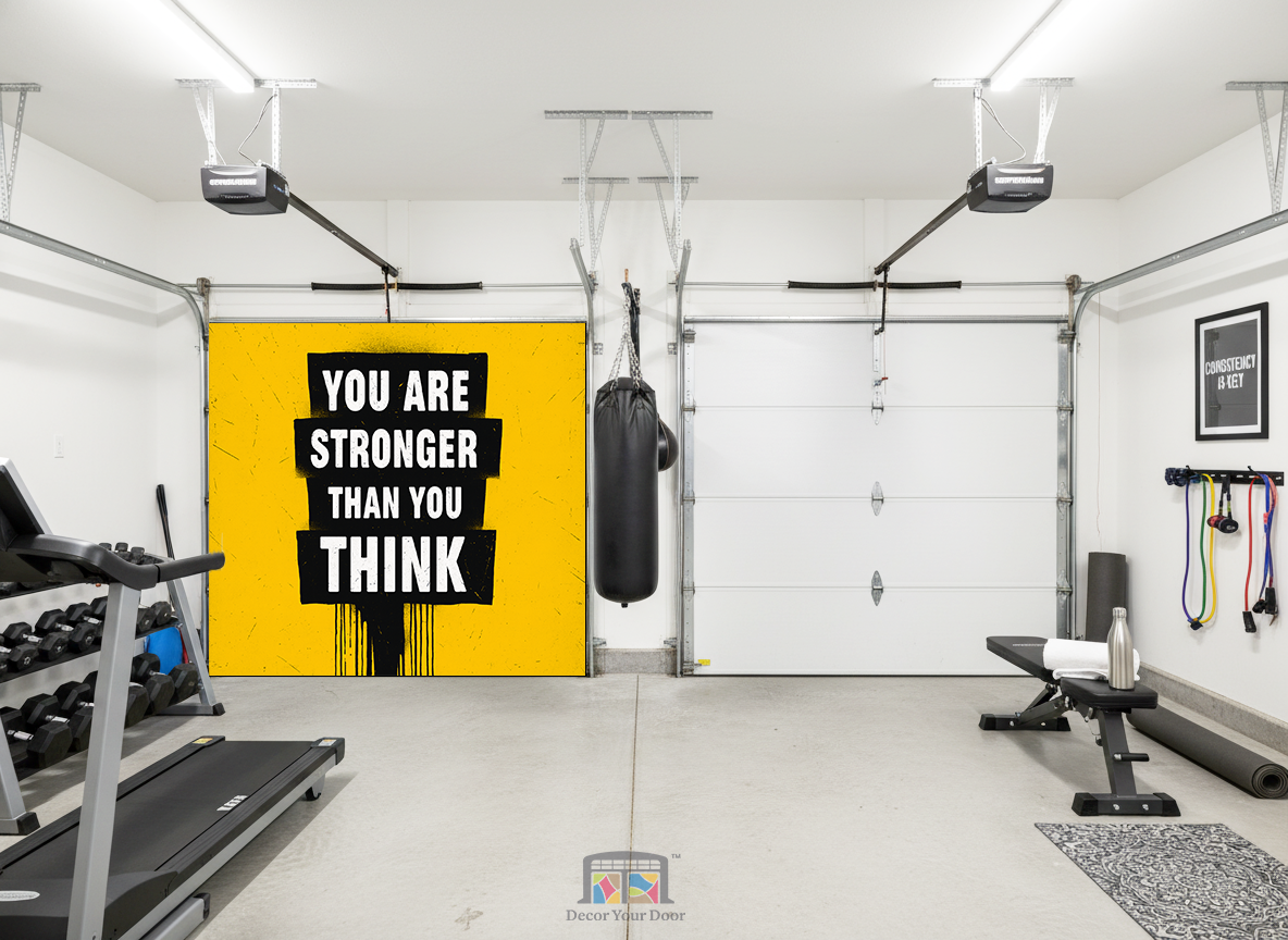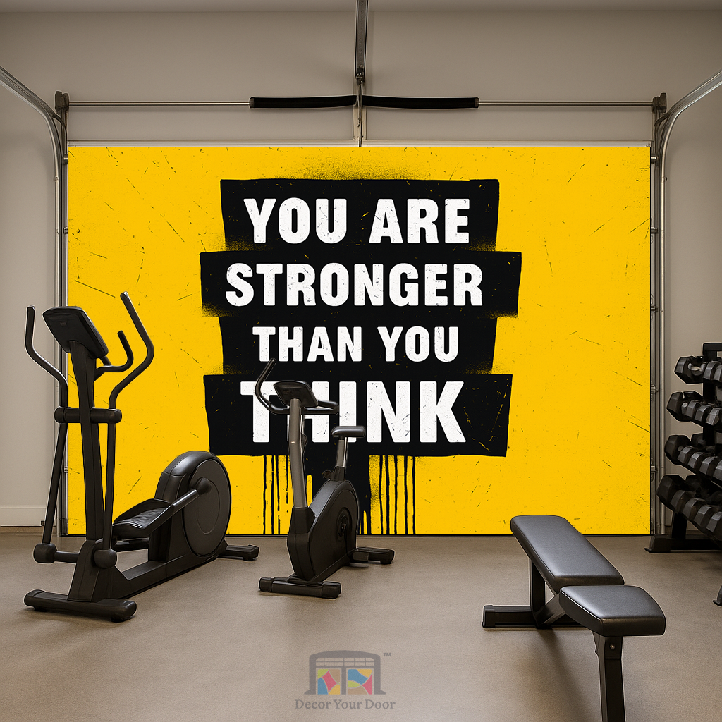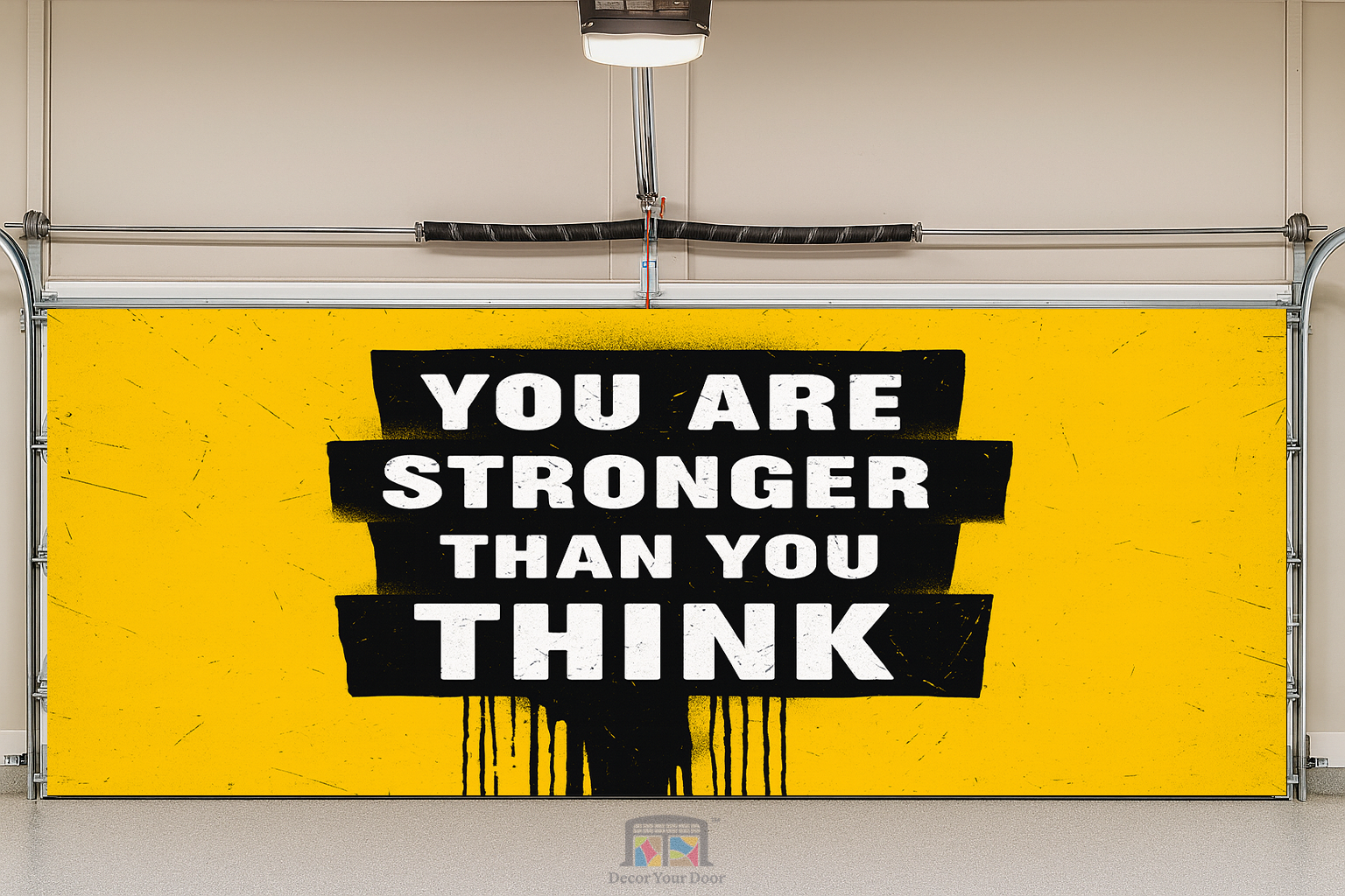 Elevate your workout mindset every time you walk into the garage with this bold and empowering design by Decor Your Door. The gritty paint stroke style and high contrast lettering create a powerful statement that pushes you to break limits and believe in your strength. Printed in ultra high resolution, this interior garage door cover adds intensity, motivation, and unstoppable energy to any home gym. A daily reminder that you are always stronger than you think.