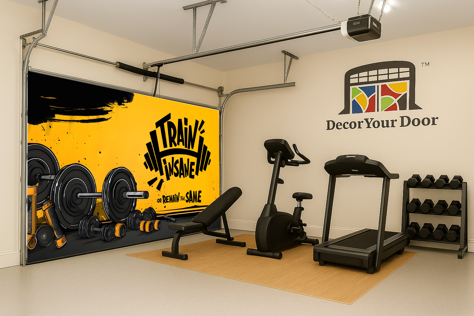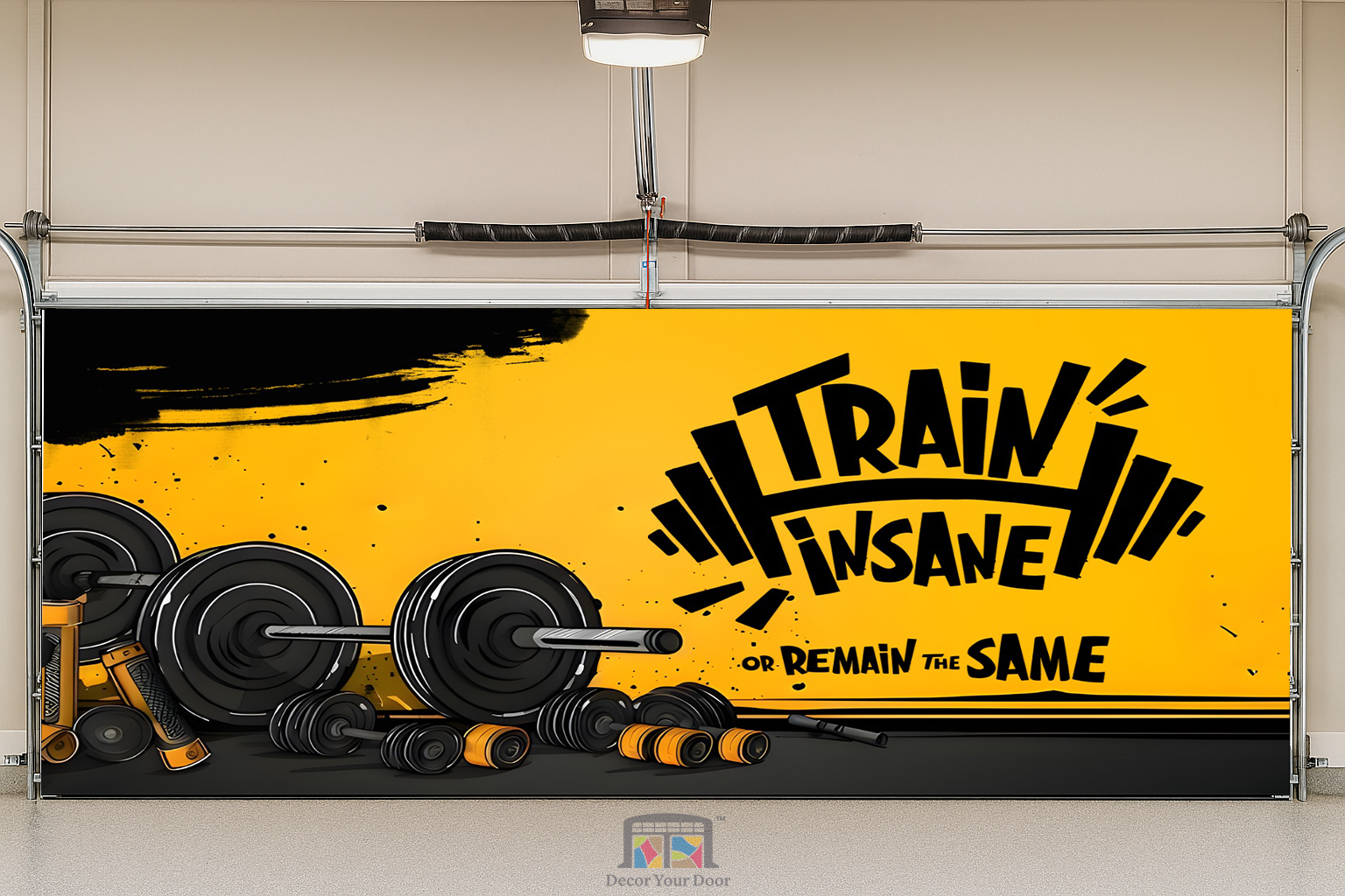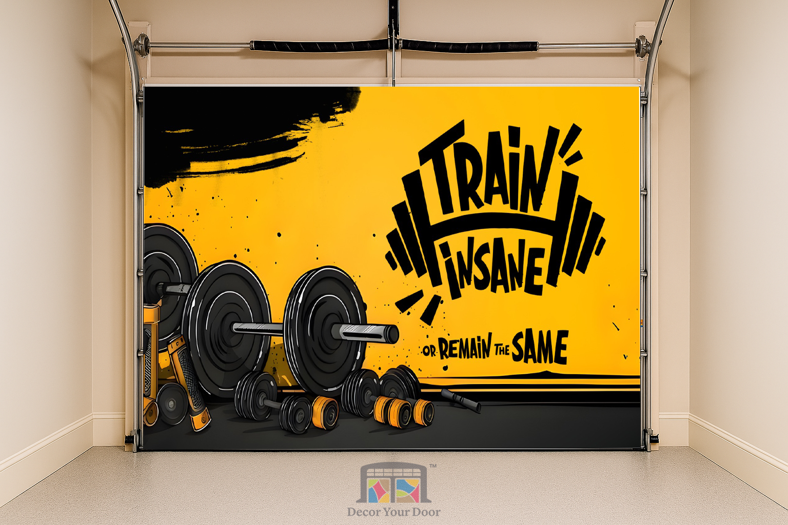 The “Train Insane or Remain the Same” – Motivation Interior Garage Door Cover by Decor Your Door is designed to fire up your drive the moment you step into your workout space. Featuring bold black and yellow contrast with powerful barbell graphics, this design embodies dedication and intensity. Made from high-quality wrinkle-resistant fabric, it installs easily and transforms your garage or gym into a space that commands you to give it everything you’ve got.