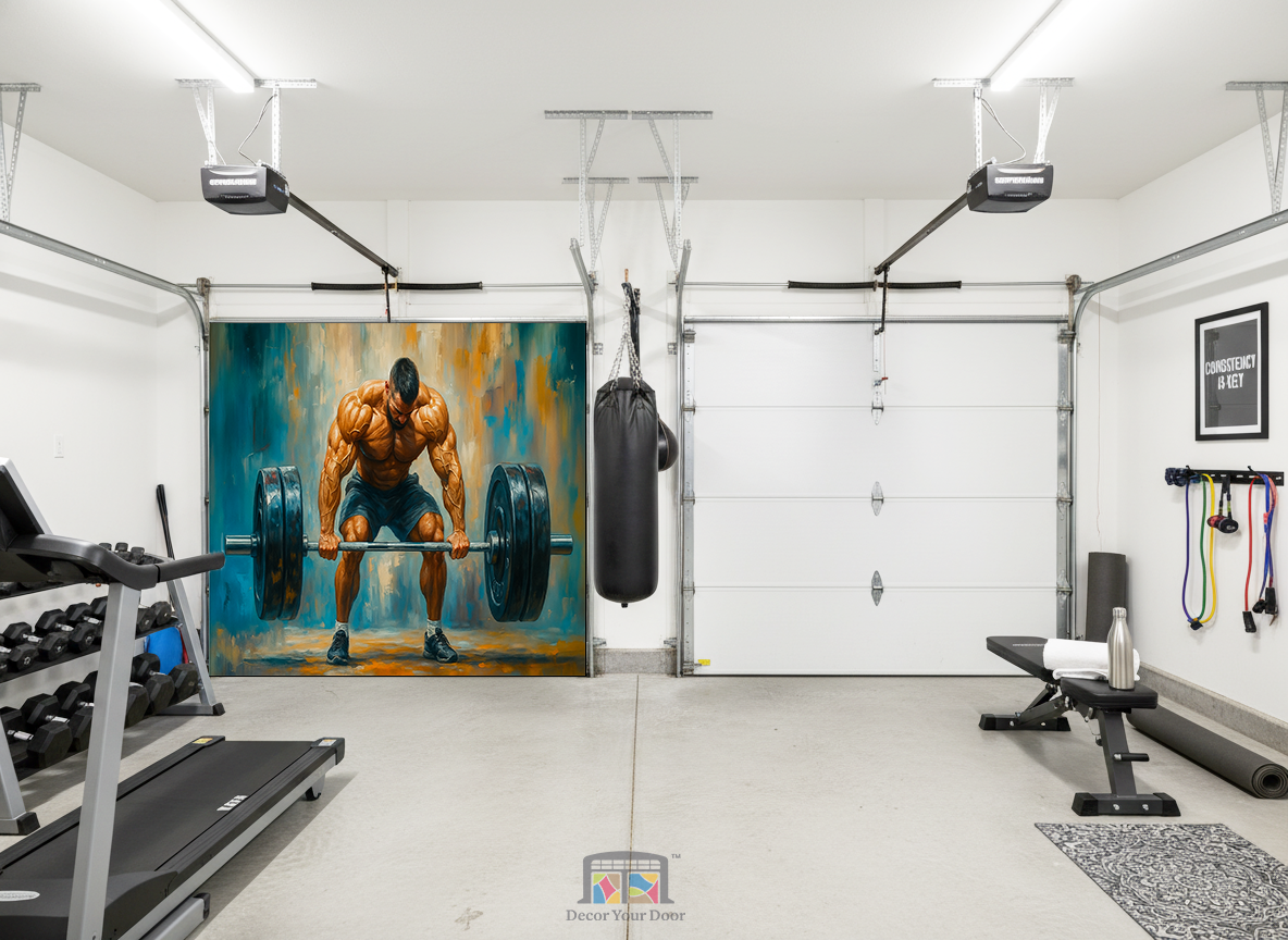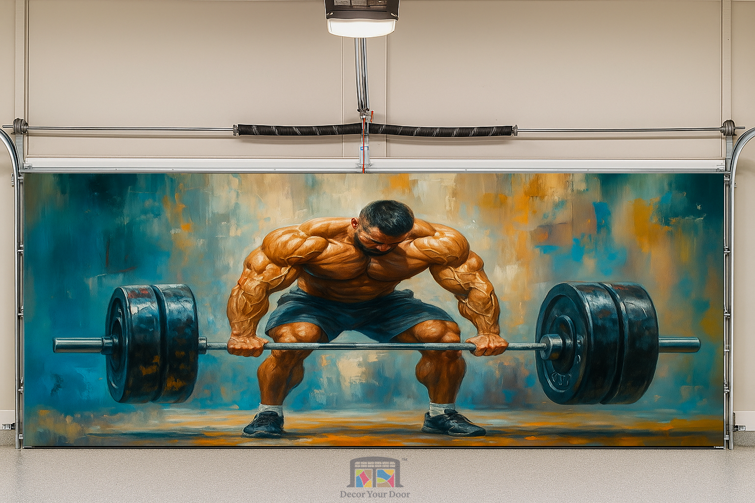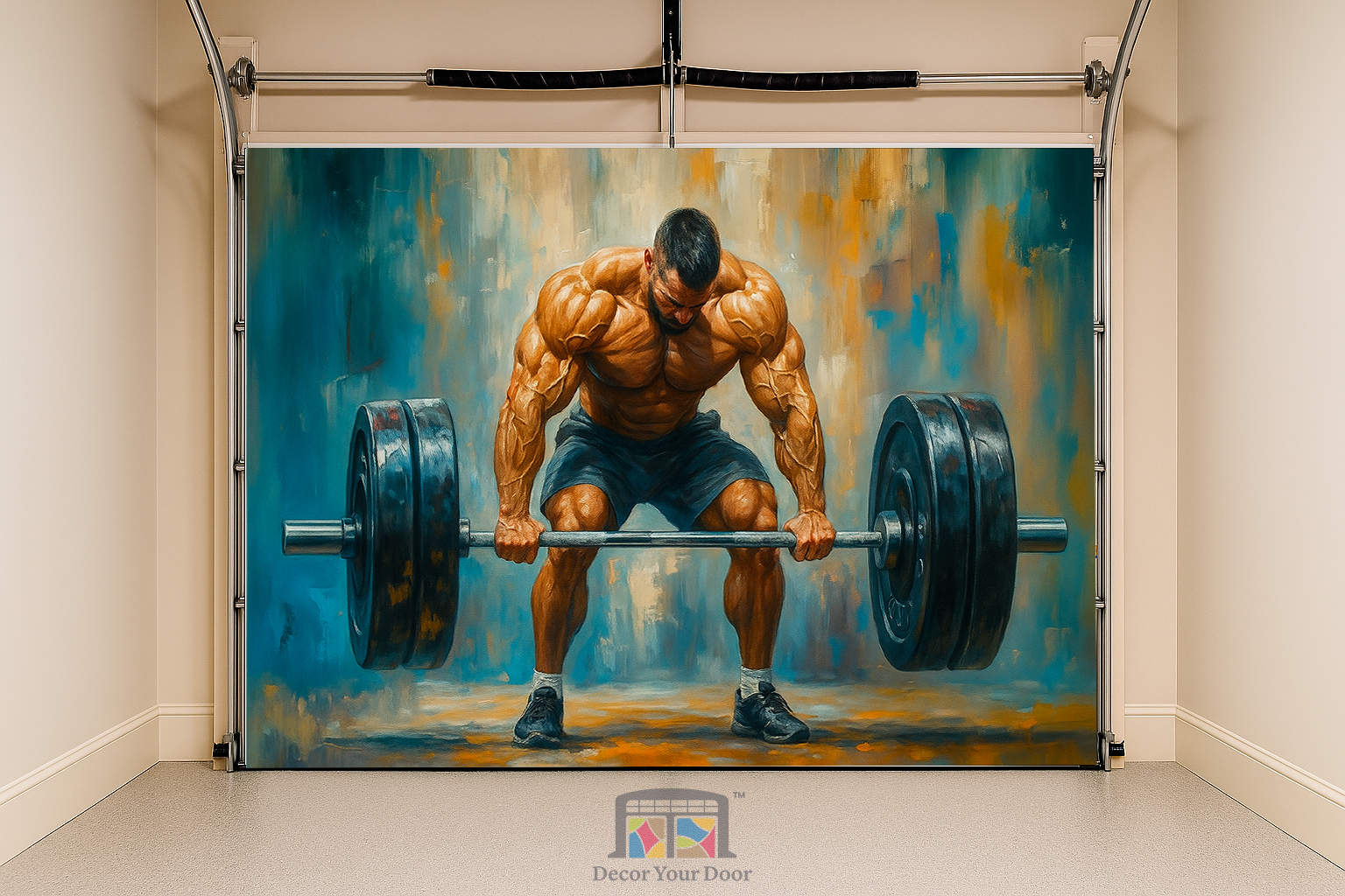 Fuel your training zone with unstoppable intensity using Unbreakable Lift by Decor Your Door. This commanding artwork features a powerful athlete locked into a heavy deadlift, every muscle sculpted and flexed with absolute precision. The dynamic mix of warm and cool brushstrokes creates an explosive backdrop that amplifies the strength, discipline, and grit in the scene. Printed in ultra-high resolution on durable, weatherproof material, this garage door cover transforms your space into a high-energy gym environment that pushes you to lift harder and rise stronger every single day.