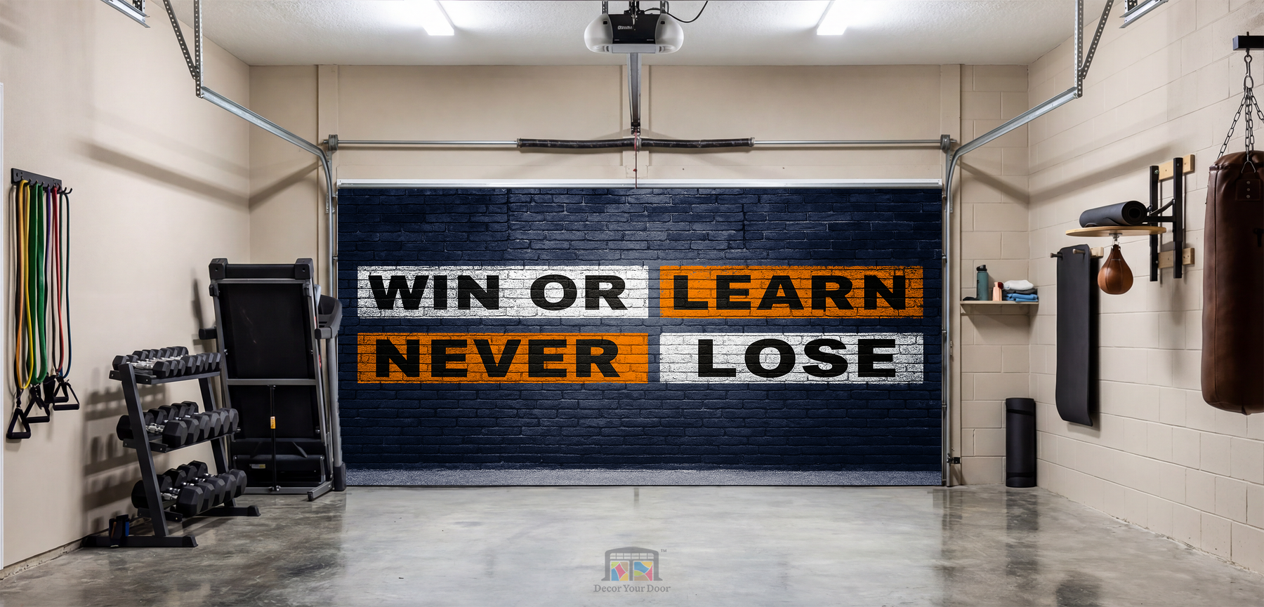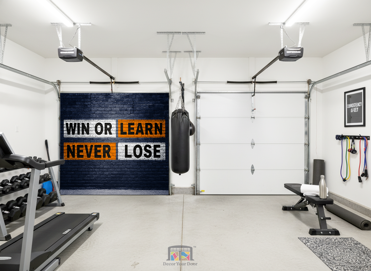 Level up your garage gym with the Win or Learn Wall motivation garage door cover by Decor Your Door. Featuring bold brick textures, gritty stencil lettering, and high-impact color blocks, this design delivers a powerful mindset boost every time you train. The message Win or Learn, Never Lose pushes you to stay focused, stay driven, and keep progressing. Perfect for anyone building a killer home gym atmosphere, this cover adds energy, attitude, and unstoppable motivation to your workout space.