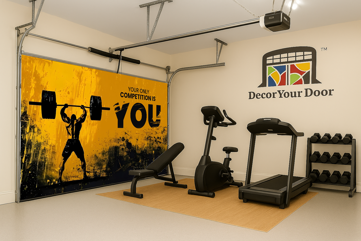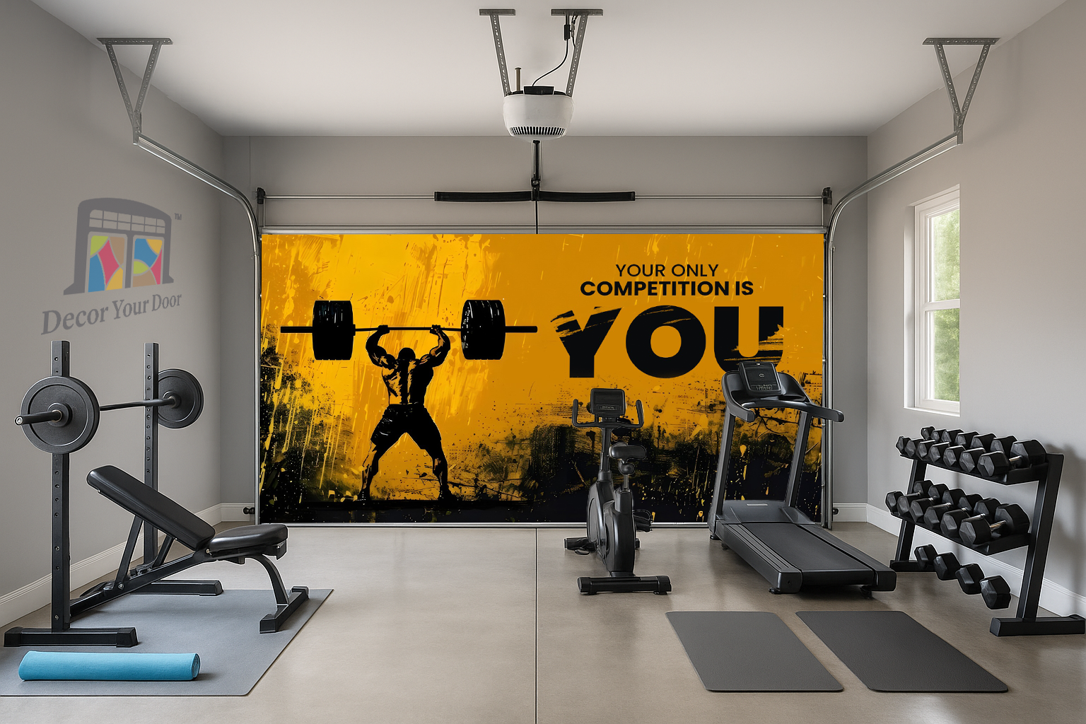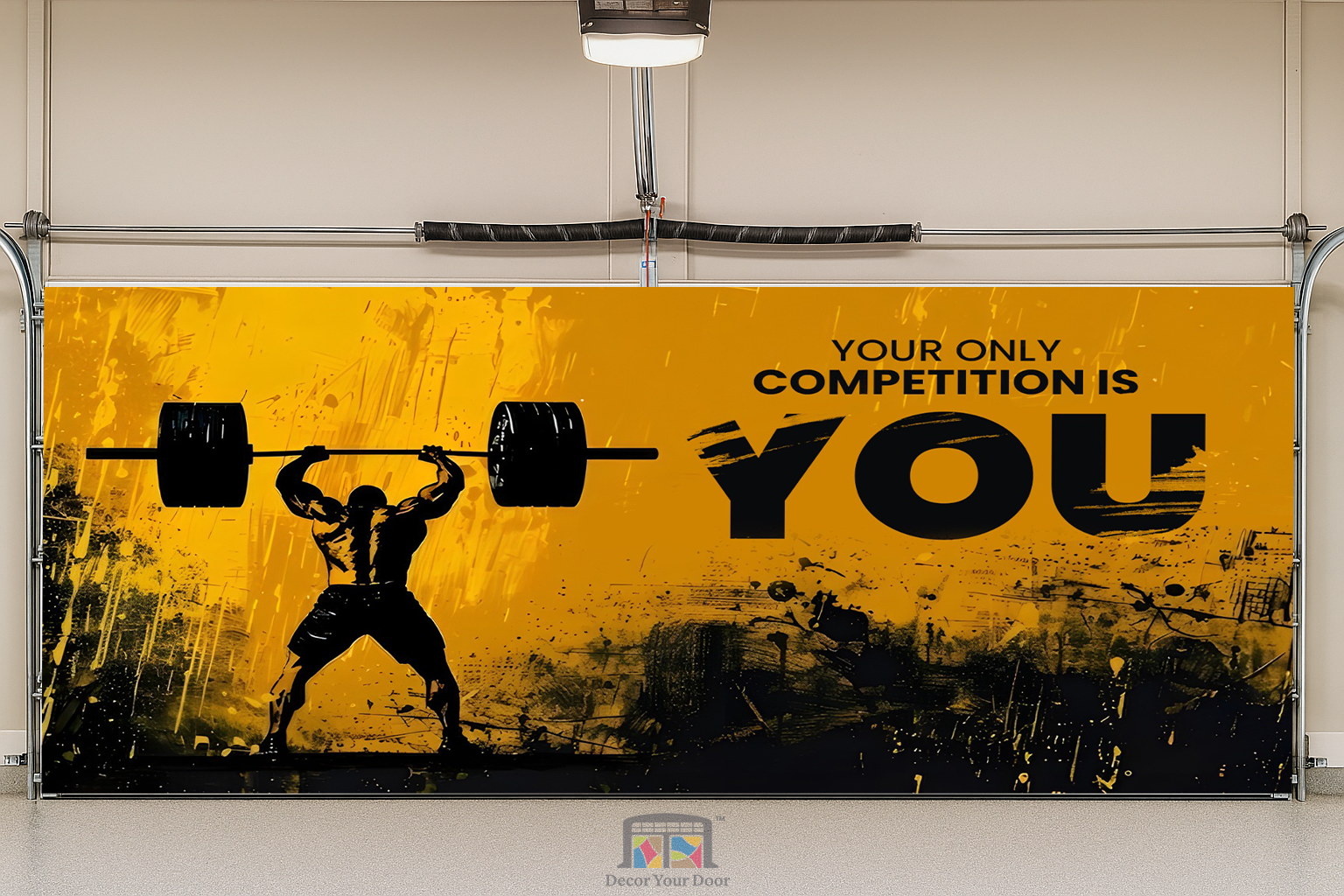 Push yourself every time you step into your garage gym with the “Your Only Competition Is You” interior cover by Decor Your Door. Designed for athletes and home gym owners who strive for progress, this bold yellow and black artwork transforms your space into a daily source of motivation.