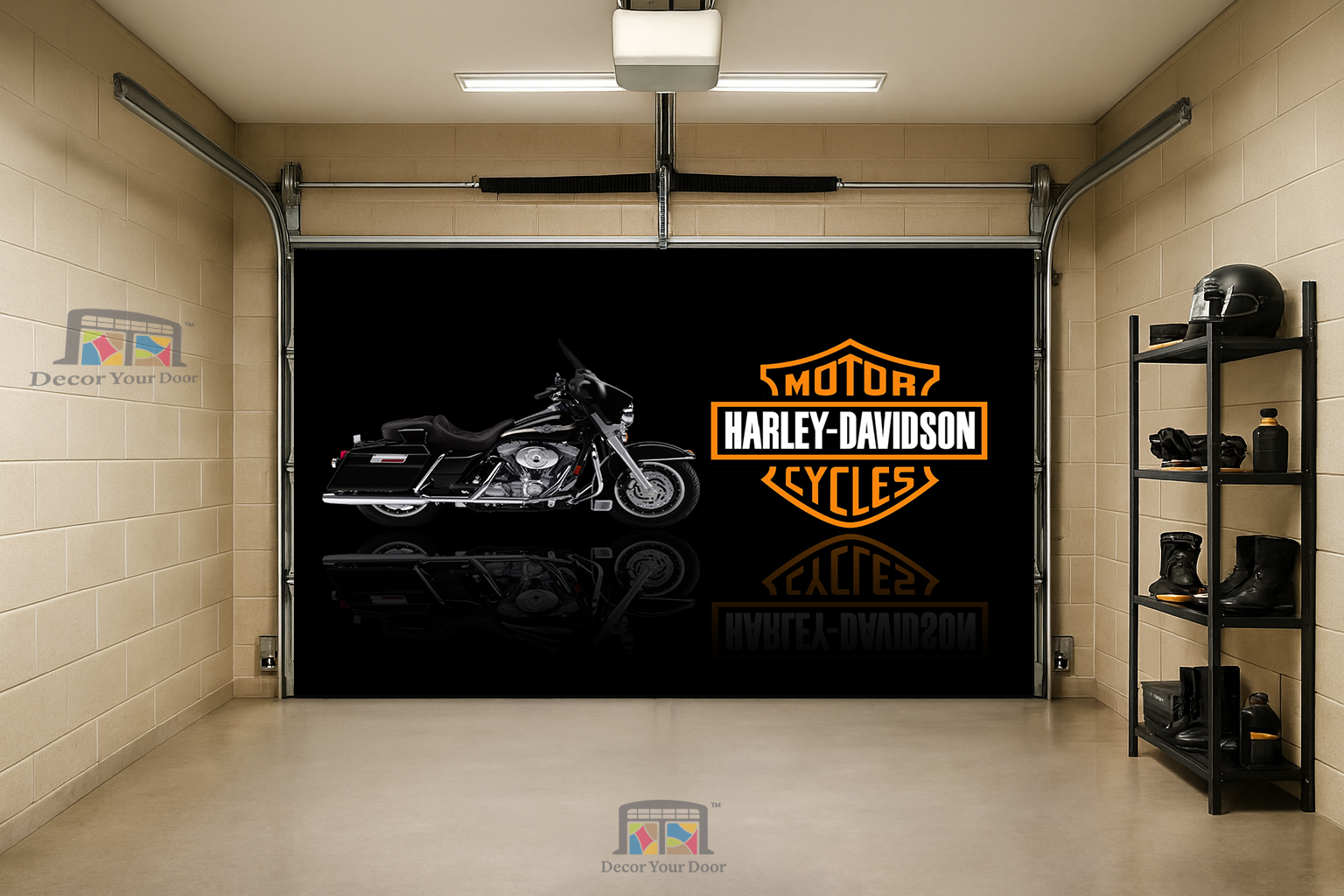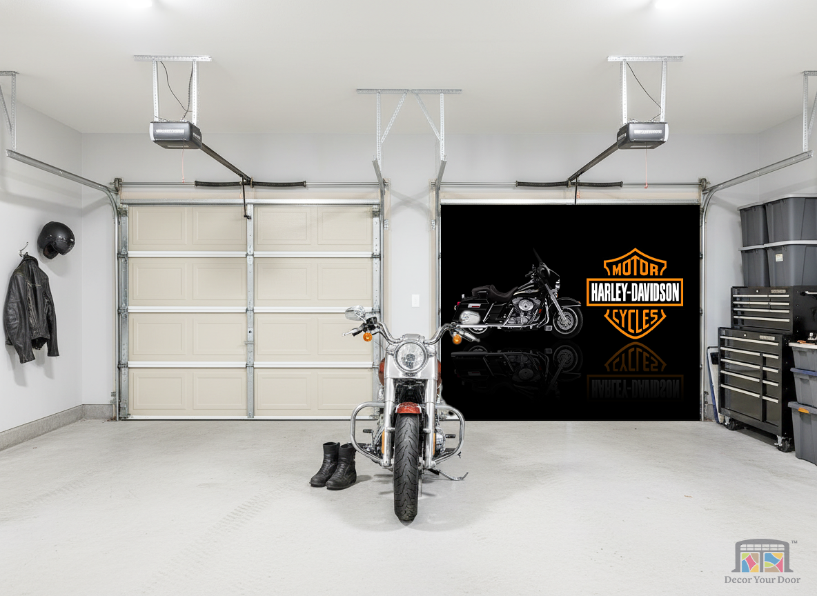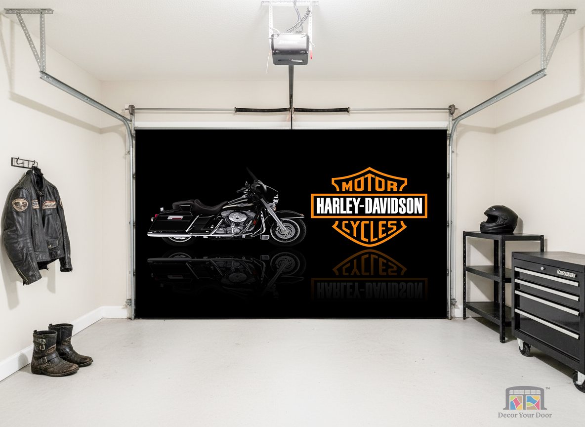 Bring the legend home. This striking black-chrome Harley design by Decor Your Door delivers a clean dark background with a bold reflection effect, just like a showroom spotlight reveal. The iconic Harley-Davidson logo stands proudly beside the bike, creating a powerful tribute to freedom, steel, and the spirit of the open road.