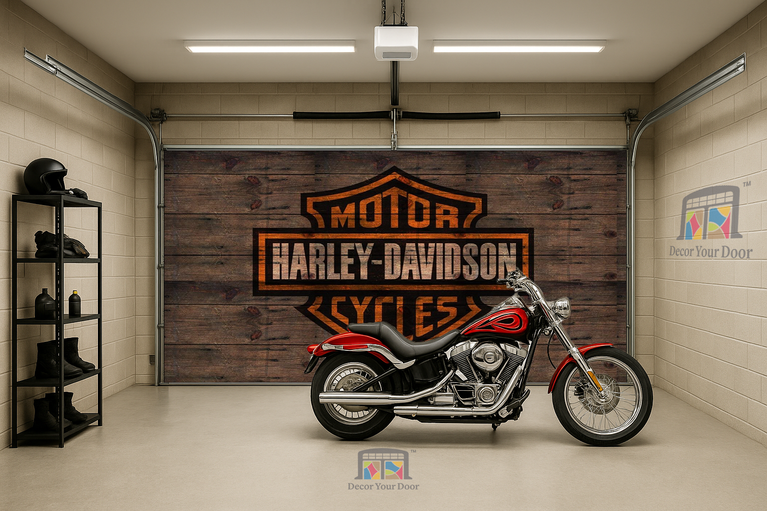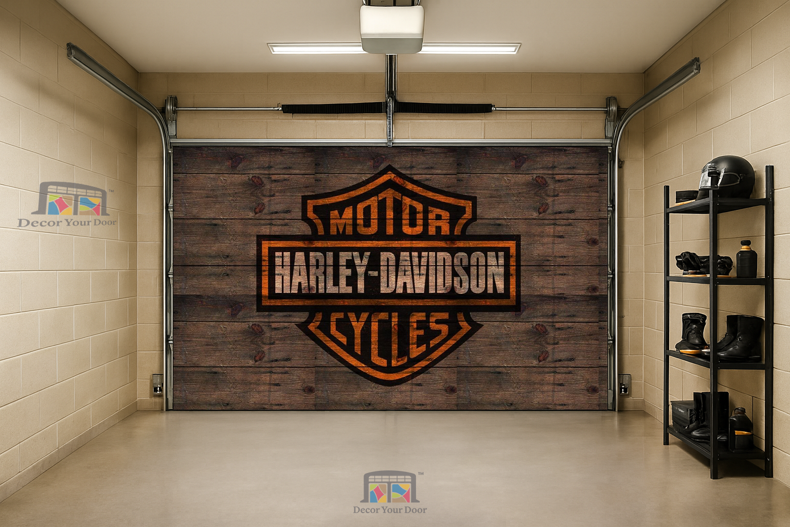 Bring the spirit of the open road into your garage with this rugged wood-grain Harley design by Decor Your Door. The classic Harley-Davidson emblem is blended into a weathered wooden background, giving it a raw authentic feel like a real rider’s workshop or cabin garage.