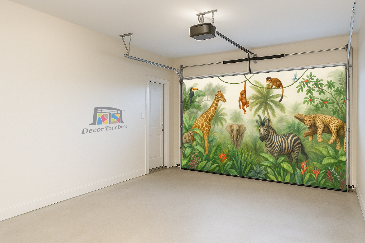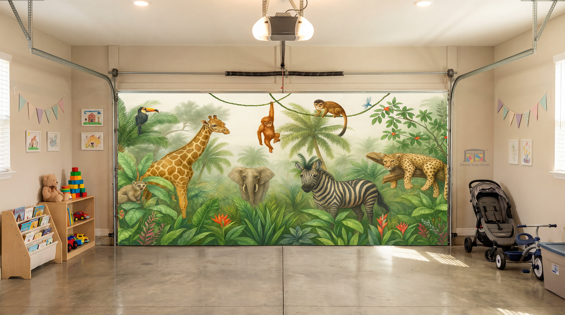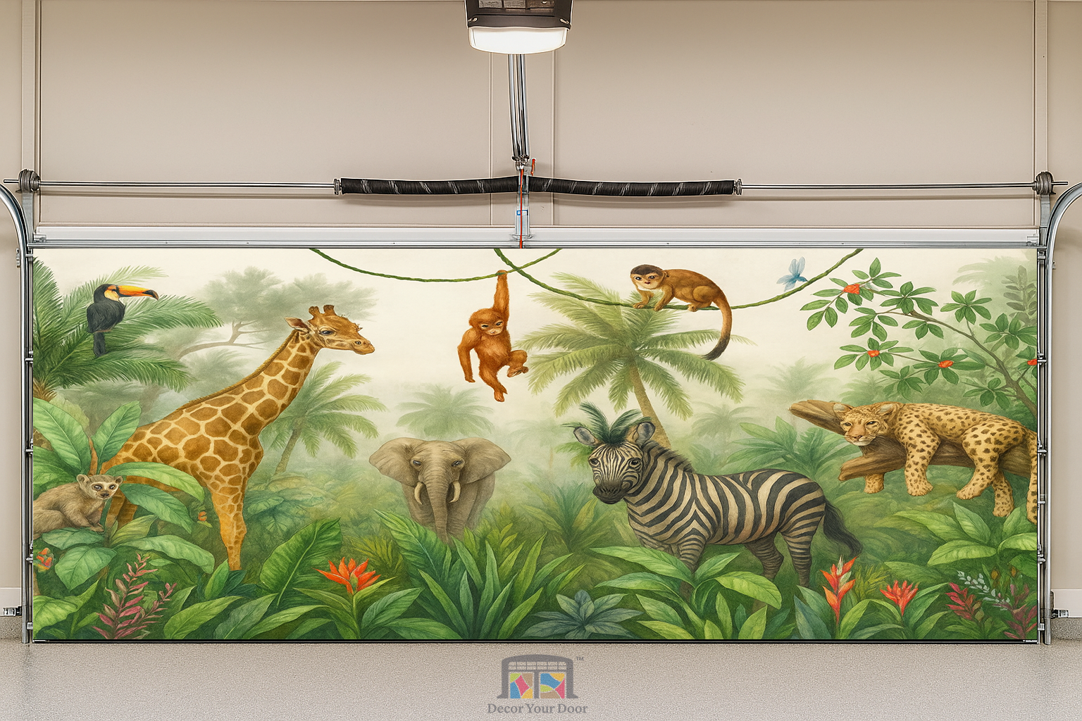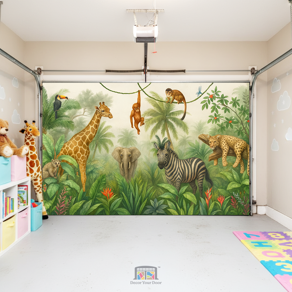 Bring your garage to life with a peaceful jungle scene filled with charming animals. This realistic illustration features a giraffe, zebra, elephant, monkeys, and more surrounded by lush greenery and soft morning light. It transforms your garage into a calm safari atmosphere that feels like stepping into nature. By Decor Your Door.