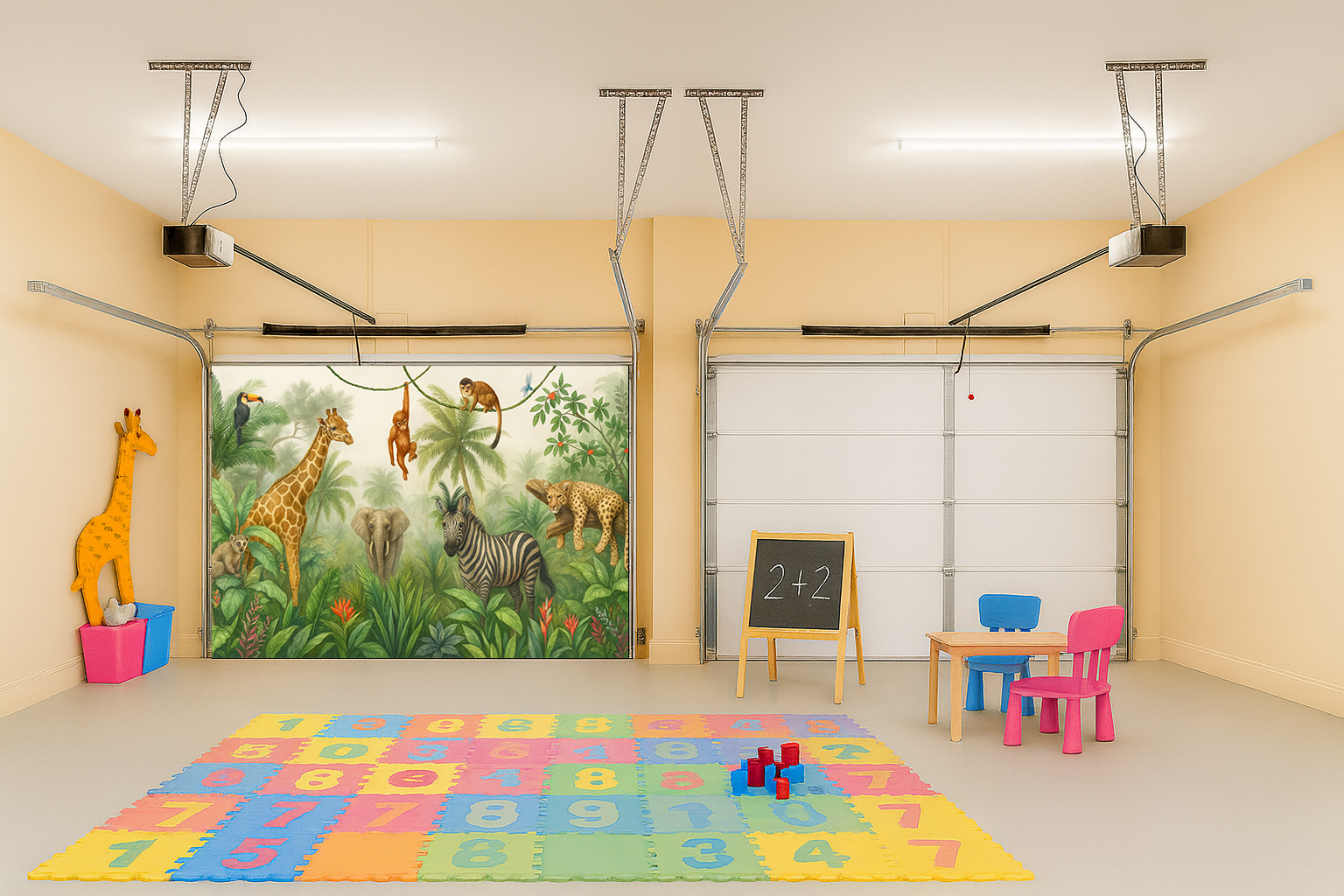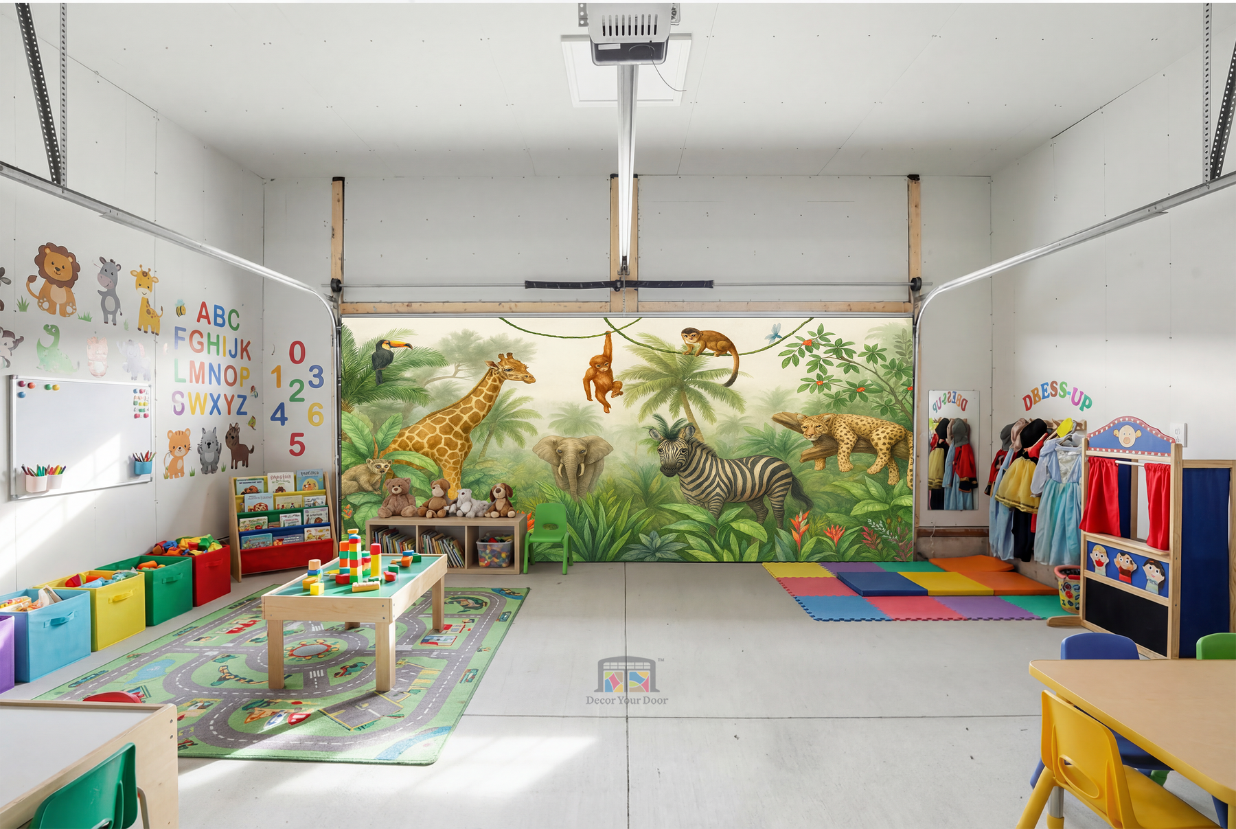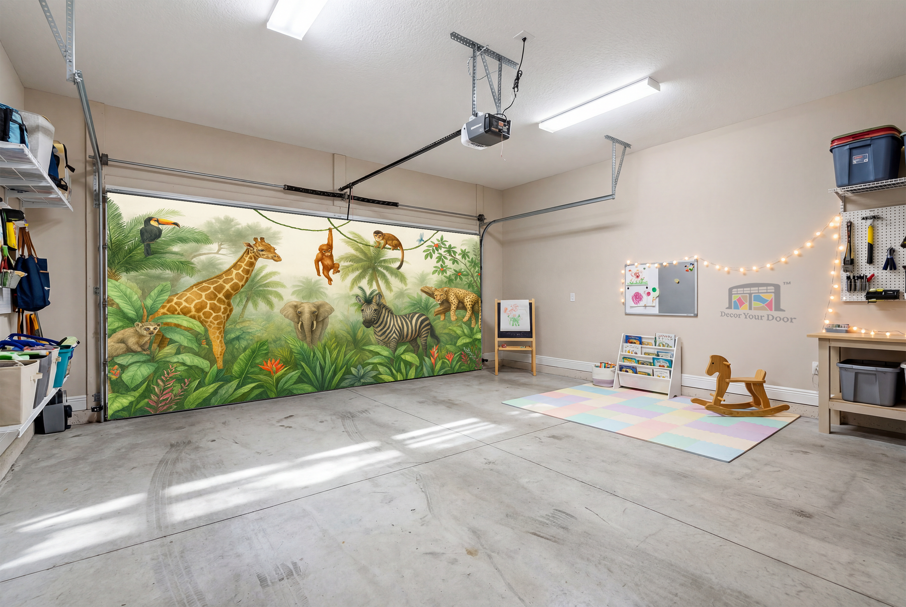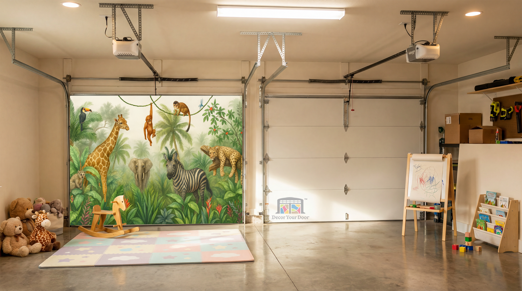 Bring your garage to life with a peaceful jungle scene filled with charming animals. This realistic illustration features a giraffe, zebra, elephant, monkeys, and more surrounded by lush greenery and soft morning light. It transforms your garage into a calm safari atmosphere that feels like stepping into nature. By Decor Your Door.
