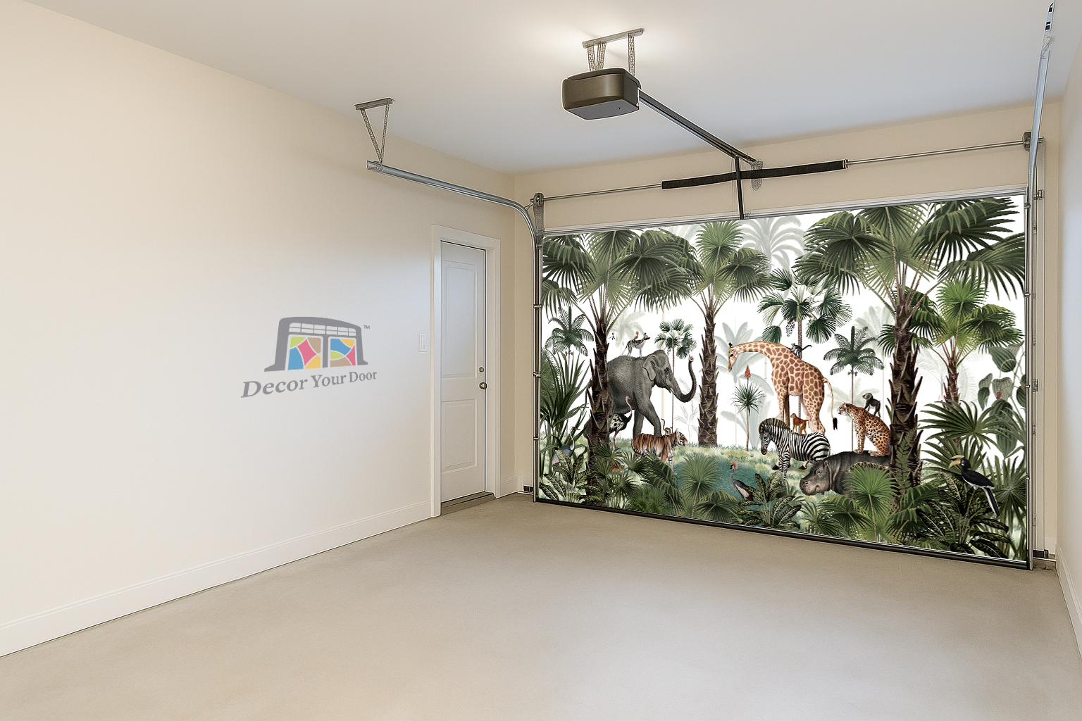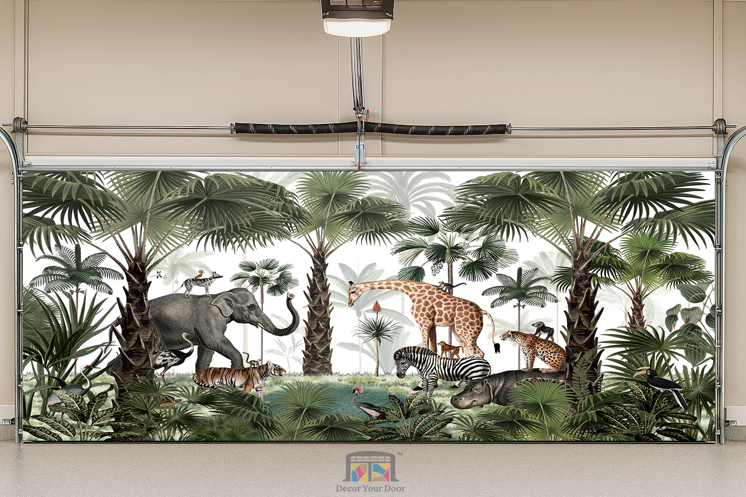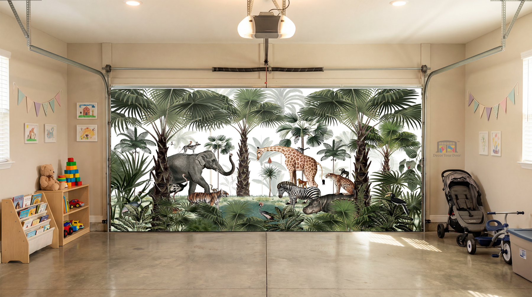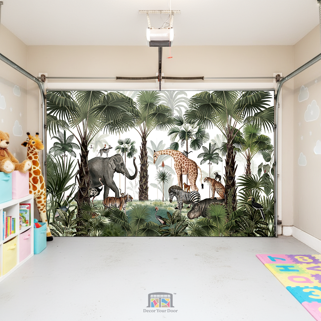 Bring the heart of the wild to your garage with Jungle Gatherings – Interior Garage Door Cover by Decor Your Door. A beautifully illustrated safari scene featuring elephants, giraffes, zebras, tigers, hippos, and exotic birds surrounded by lush green palms. This peaceful animal gathering adds a playful yet elegant touch, perfect for kids rooms, nurseries, or nature lovers who want to turn their garage into a magical sanctuary. A calm color palette keeps it soothing, while the detailed wildlife makes it visually stunning and immersive.