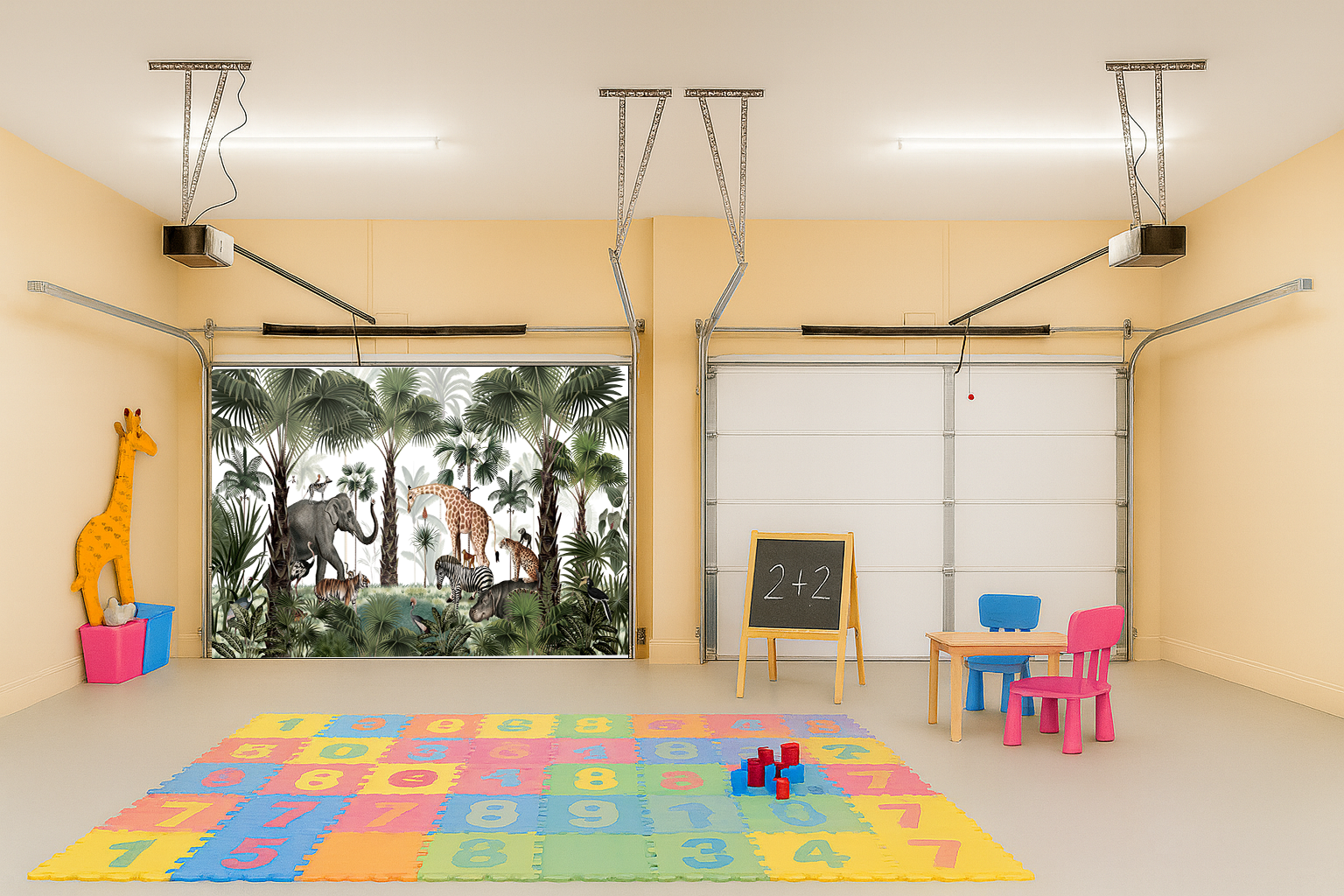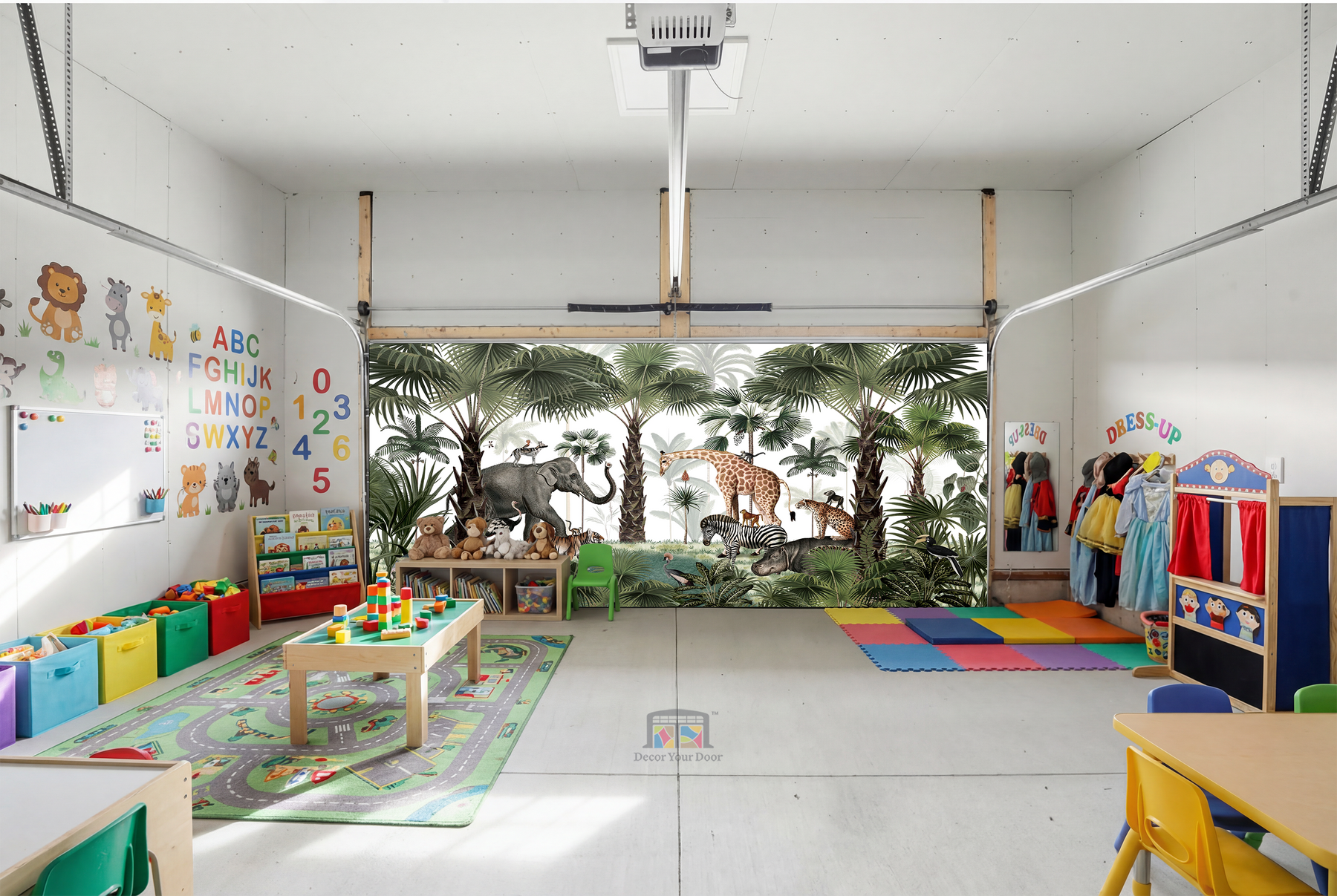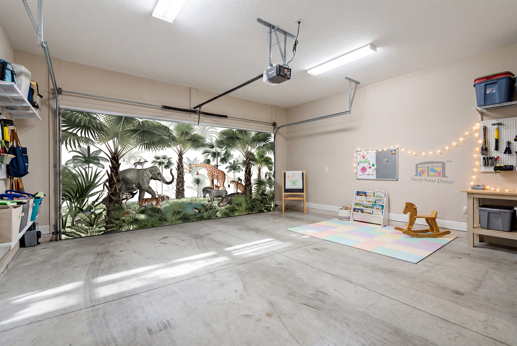 Bring the heart of the wild to your garage with Jungle Gatherings – Interior Garage Door Cover by Decor Your Door. A beautifully illustrated safari scene featuring elephants, giraffes, zebras, tigers, hippos, and exotic birds surrounded by lush green palms. This peaceful animal gathering adds a playful yet elegant touch, perfect for kids rooms, nurseries, or nature lovers who want to turn their garage into a magical sanctuary. A calm color palette keeps it soothing, while the detailed wildlife makes it visually stunning and immersive.