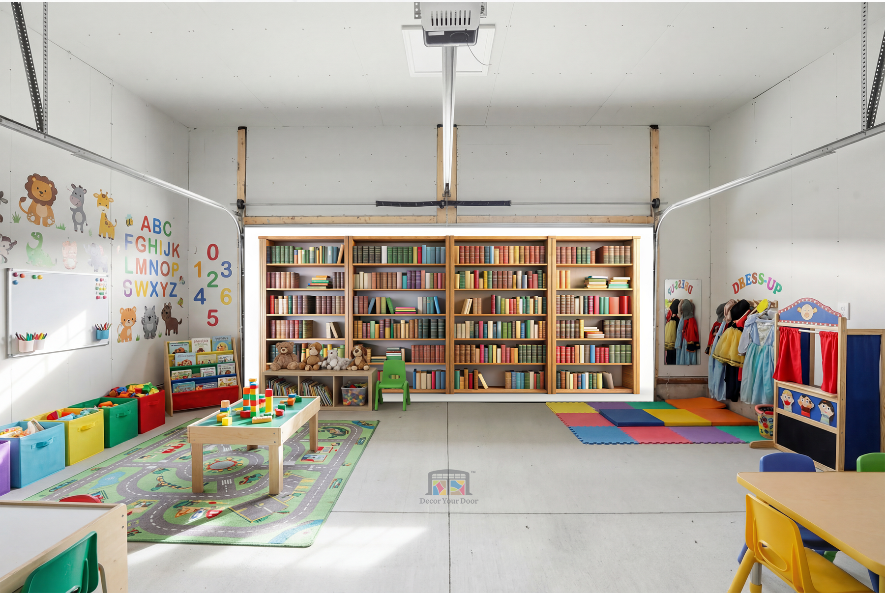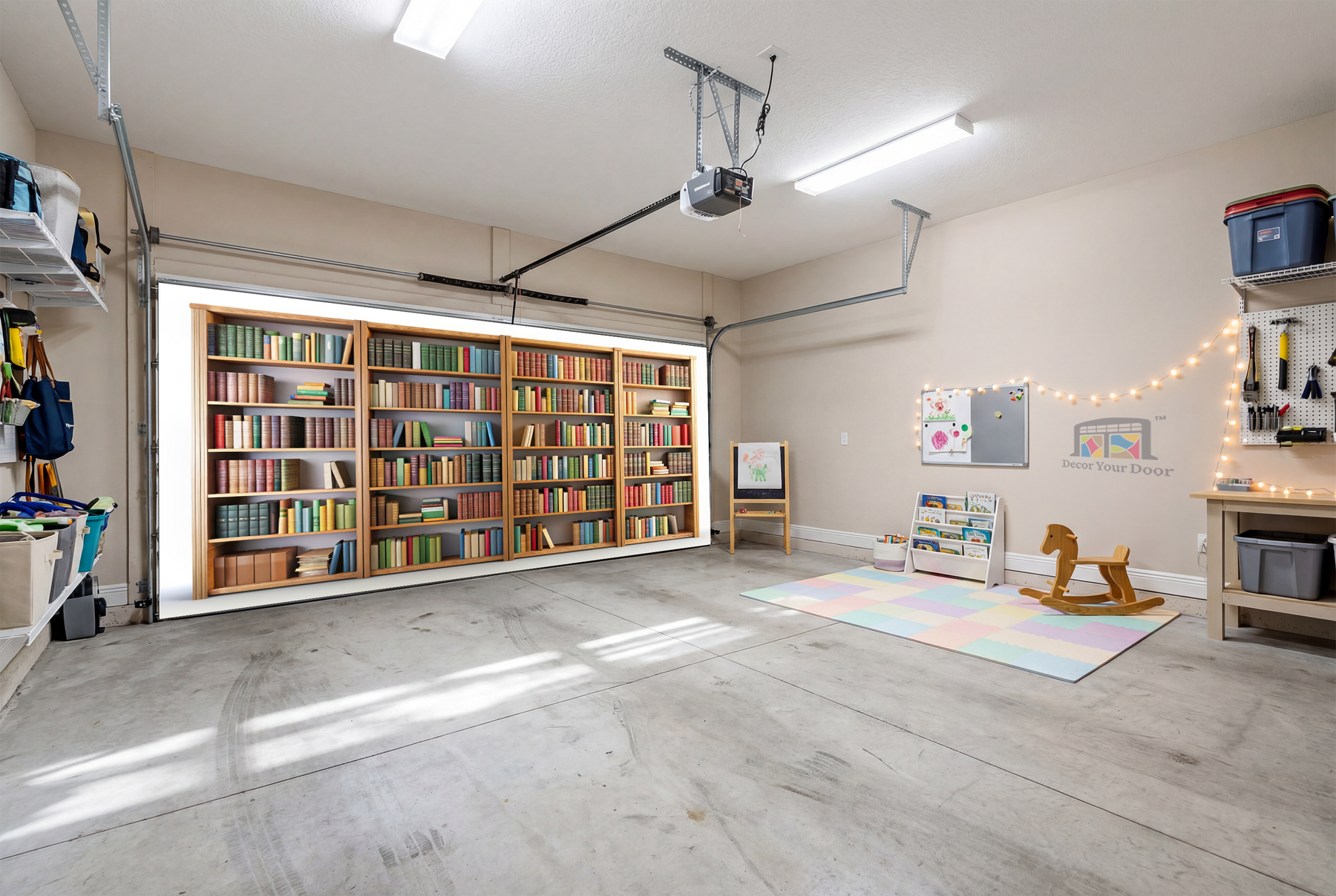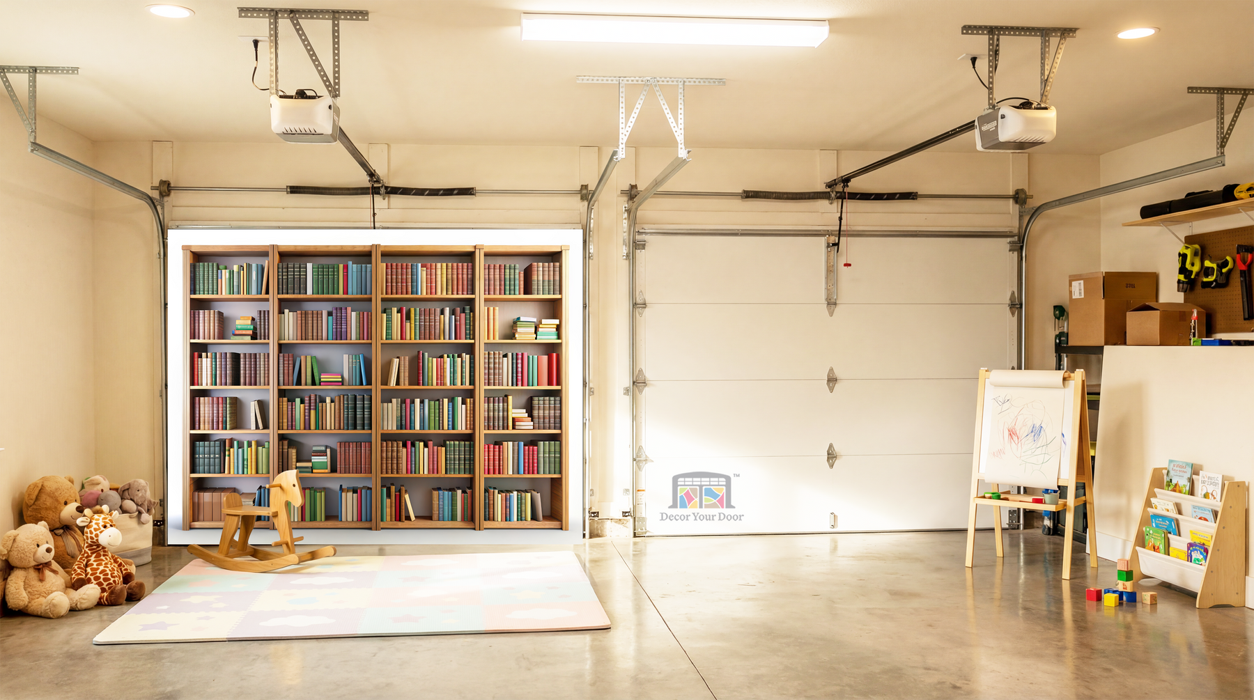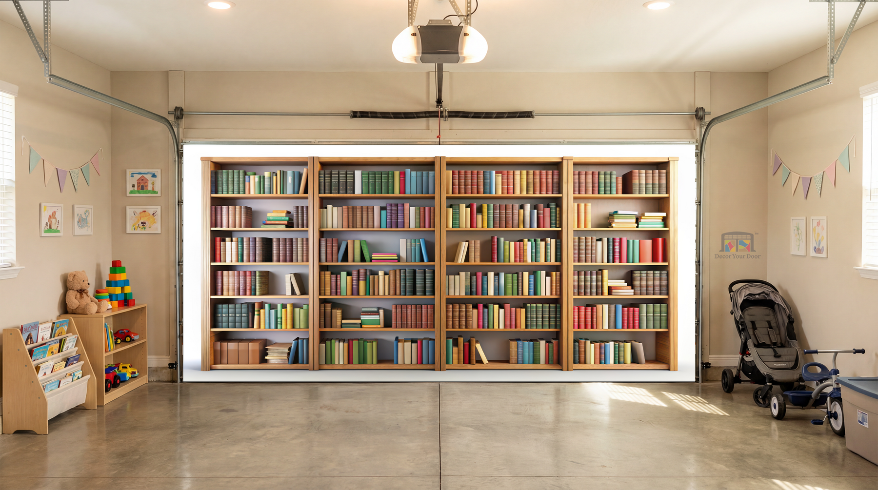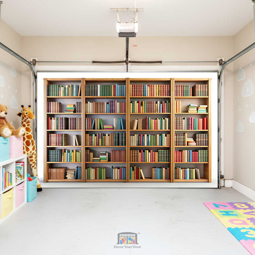 The Little Reader’s Library – Interior Garage Door Cover creates a warm, cozy, and imaginative space inspired by the magic of books and learning. Featuring beautifully arranged bookshelves filled with colorful storybooks, this design brings a calm, comforting library feel that encourages curiosity and a love for reading from an early age. The soft tones and classic wooden shelving make the space feel safe, peaceful, and inviting, perfect for a nursery, playroom, or quiet corner for little minds to grow. A timeless and educational design that gently transforms your garage into a story-filled world, thoughtfully created by Decor Your Door.