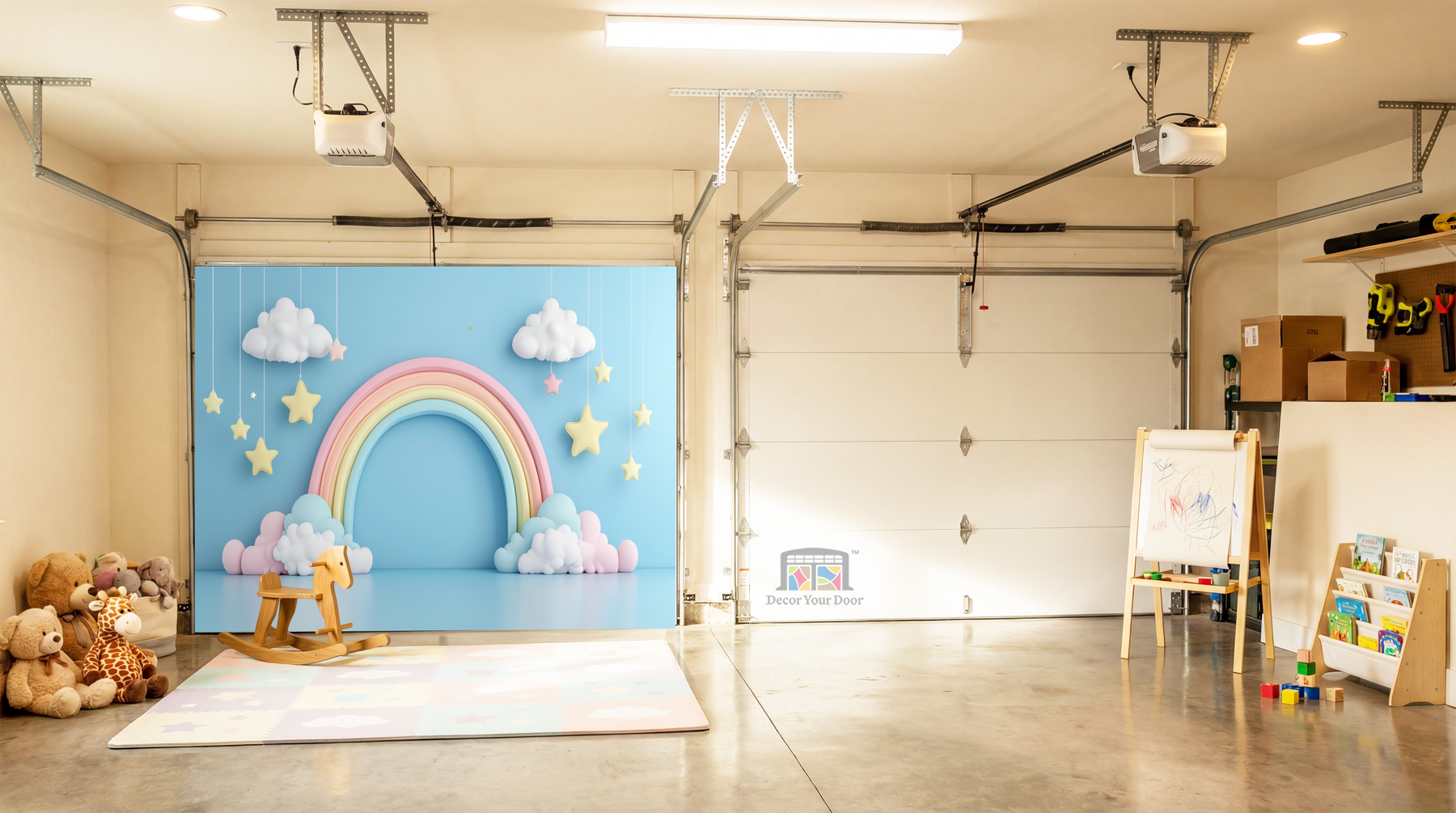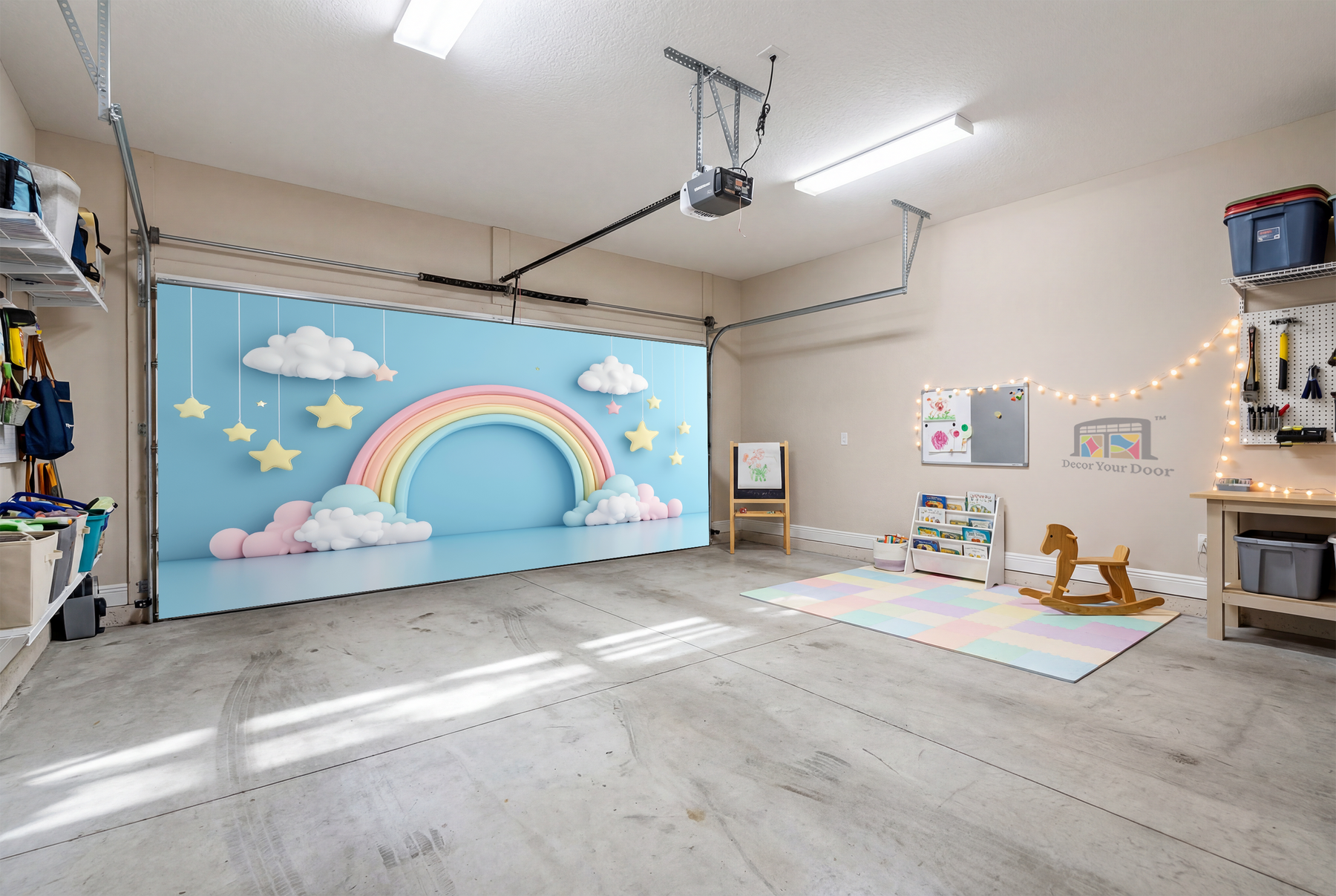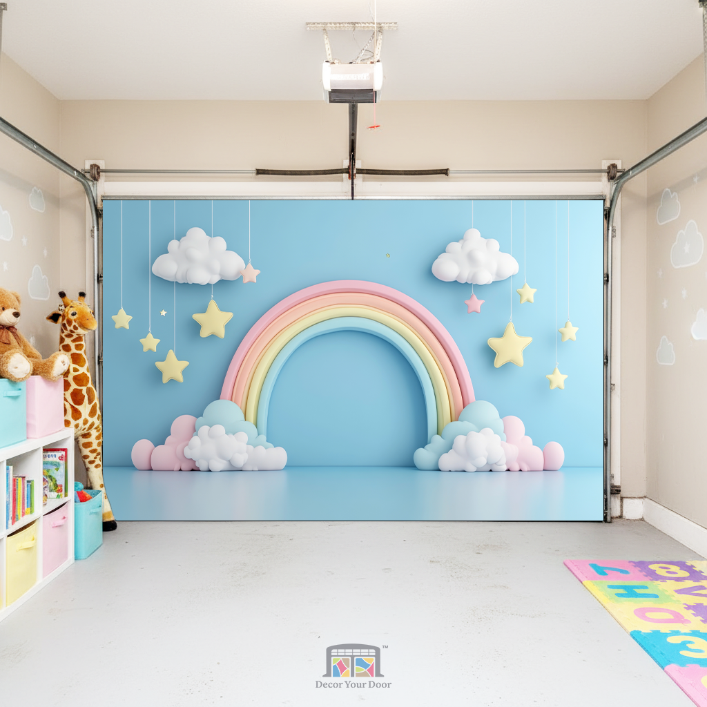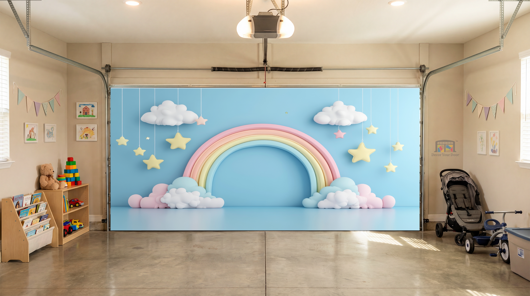 Create a soft, magical atmosphere with Pastel Rainbow Dream – Interior Garage Door Cover, designed by Decor Your Door. This calming nursery design features a gentle pastel rainbow resting on fluffy clouds, surrounded by hanging stars and dreamy sky elements that bring warmth and comfort to any child’s space.