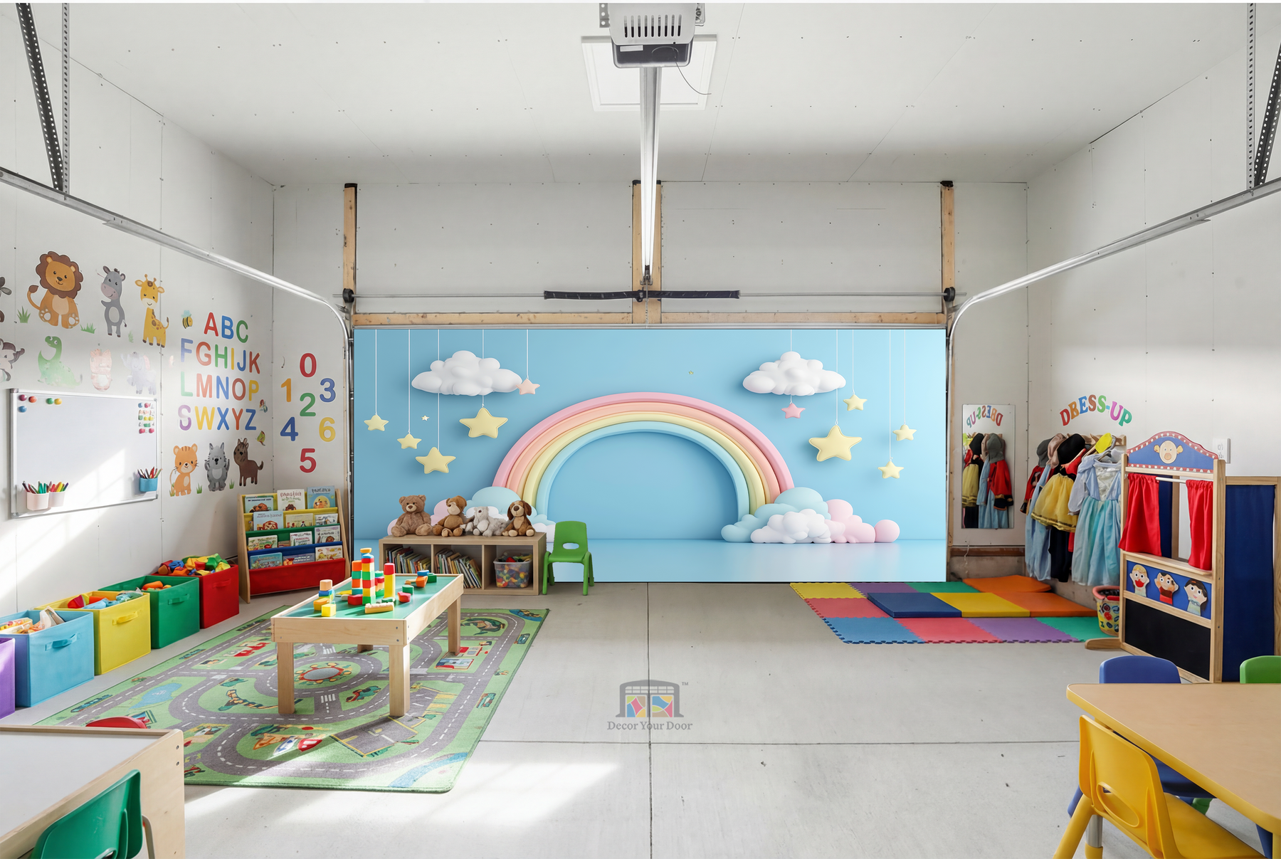 The clean, airy composition and soothing color palette transform the garage into a peaceful nursery or playroom, encouraging relaxation, imagination, and a sense of wonder. Perfect for babies and young children, this design adds a refined decorative touch while keeping the environment light, joyful, and comforting.